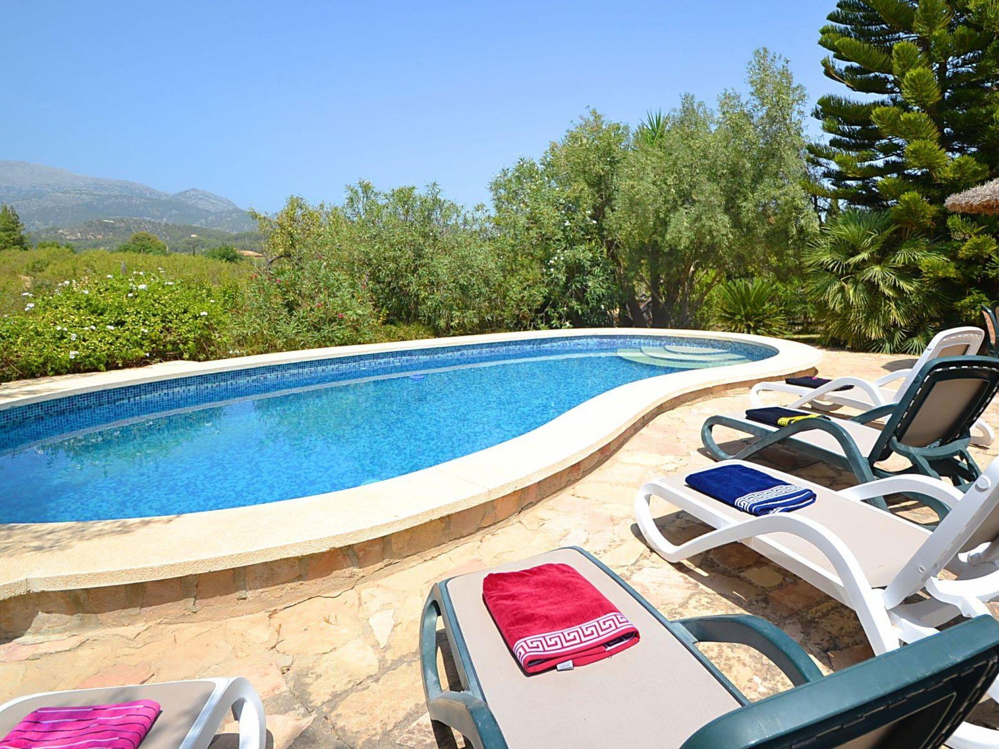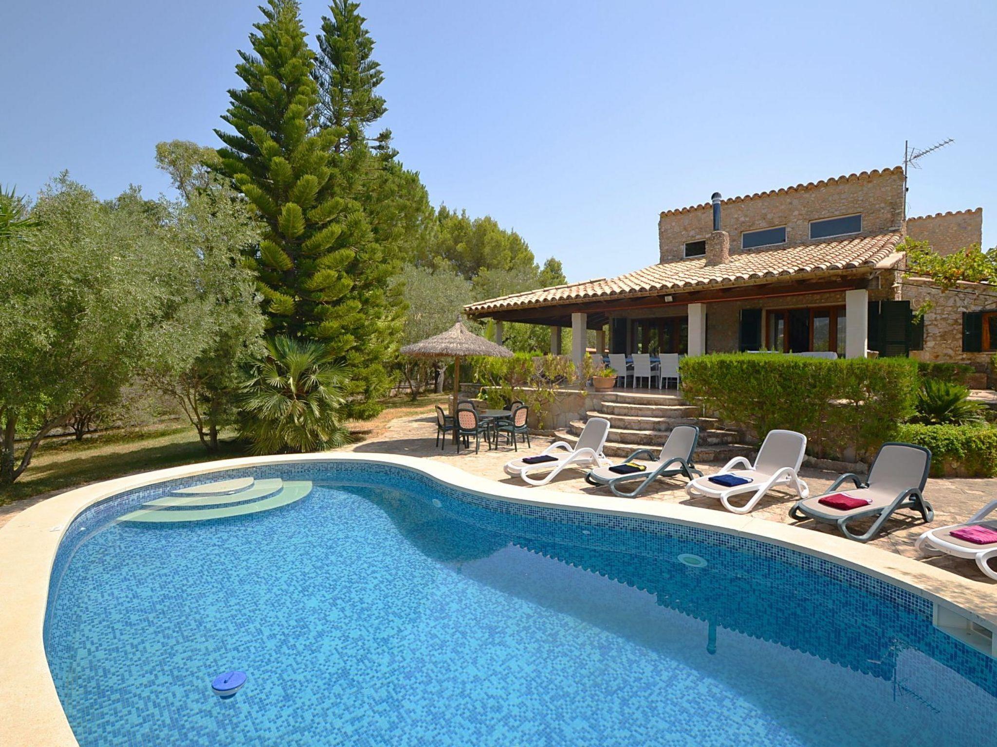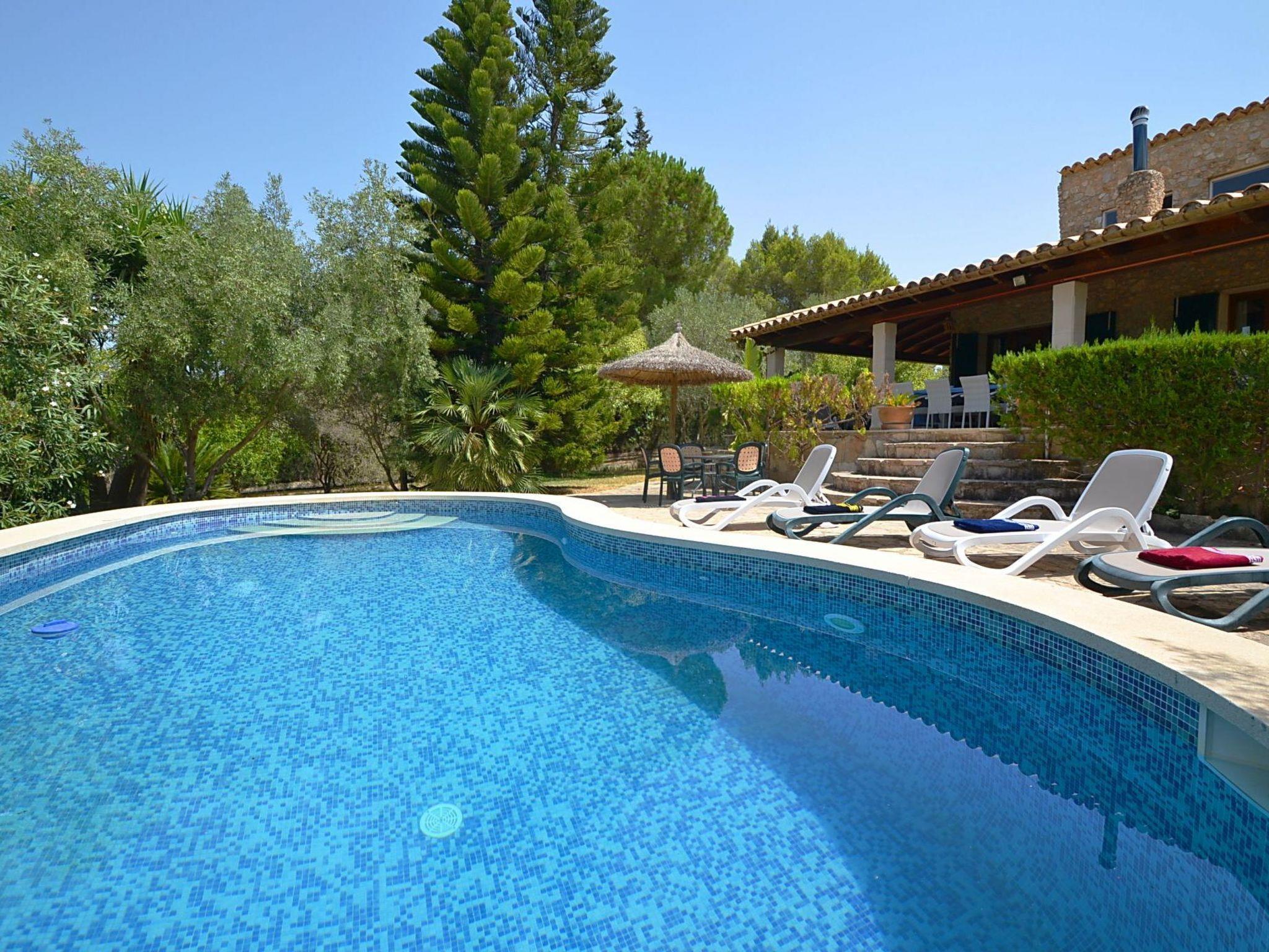 Mancor de la Vall: Cosy, rustic, comfortable house "Roura", built in 200, renovated in 2013, surrounded by trees. On the outskirts Mancor de la Vall, in a quiet, sunny position, 25 km from the sea, in the countryside. Private: property 6'000 m2, natural garden 200 m2, swimming pool kidney shaped (seasonal availability: 01.Jan. - 31.Dec.). Outdoor shower. In the house: internet access, WiFi, sun terrace, washing machine. Parking on the premises. Supermarket 1 km, restaurant 1 km, bus stop 3 km, sandy beach 25 km. Golf course (18 hole) 20 km, tennis 1 km, riding stable 4 km. Please note: car recommended. Suitable for families, suitable for seniors baby equipment on request (included). Object suitable for 12 adults. The owner does not accept any youth groups. Loading and unloading of baggage is possible at the holiday house. Airfield 45 km from the property.