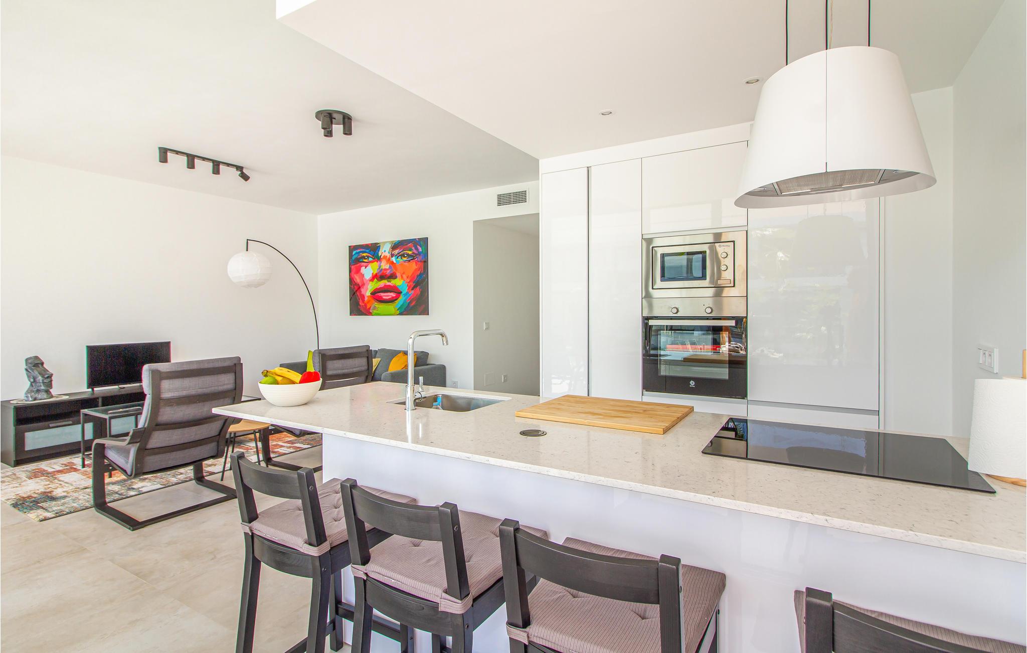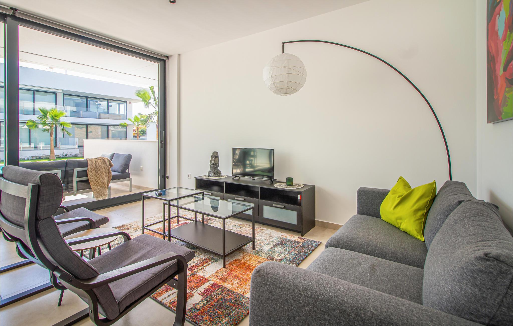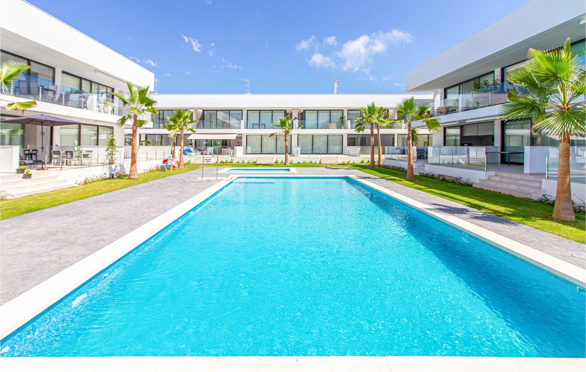 Denne moderne lejlighed vil opfylde alle jeres ønsker. Her finder I plads nok til en ferie med familien eller et vennepar. Møblerne er moderne og dekorative. Den flotte terrasse og det store udendørsområde er boligens force. Læn jer tilbage i liggestolene eller nyd en kølig drink i de herlige loungemøbler. Fra terrassen kan I hoppe direkte ud i den fælles pool, og efter en morgendukkert kan I spise en let morgenmad på terrassen og diskutere jeres aktiviteter for dagen.
