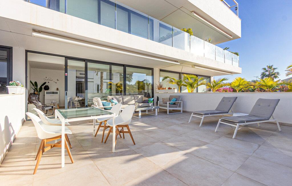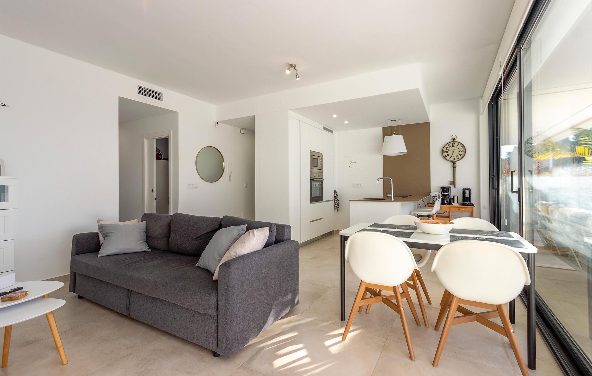 Denne smagfulde ferielejlighed byder jer velkommen med en åben opholdsstue, der takket være store vinduesfronter har masser af naturligt dagslys. Tilbered lækre tapas i det fuldt udstyrede, moderne køkken, og nyd jeres måltider ved det stilfulde spisebord. Find jer godt til rette i den hyggelige sofa om aftenen, og stream en spændende serie.