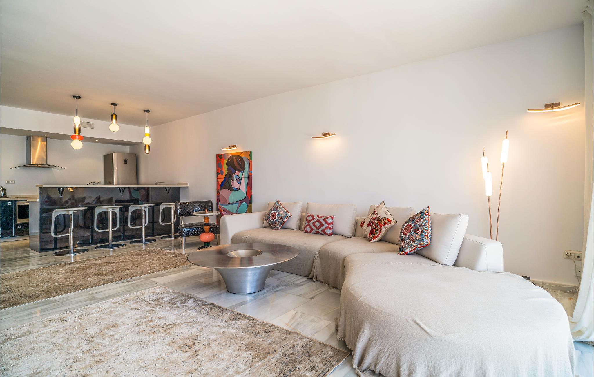 Drømmedejlig ferielejlighed på første sal med udsigt over yachthavnen ved Puerto Banús og kun et stenkast fra glans og glamour, boutiquer, stranden, biografer og restauranter. I kan køre ti Marbella på ti minutter i bil og lufthavnen kan nås på 45 minutters køretur. Selv kasinoet og golfparadiset ved Nueva Andaucia med mange former for underholdning, ligger blot få minutter væk. I lejligheden er der to soveværelser og to badeværelser. De ultramoderne køkken med bardisk er udstyret med alt, og i stuen er der en 46 tommers fladskærm. Nyd jeres måltider på altanen med udsigt ud over marinaen med mange kostbare fartøjer. Barer og diskoteker ligger i umiddelbar nærhed af lejligheden.
