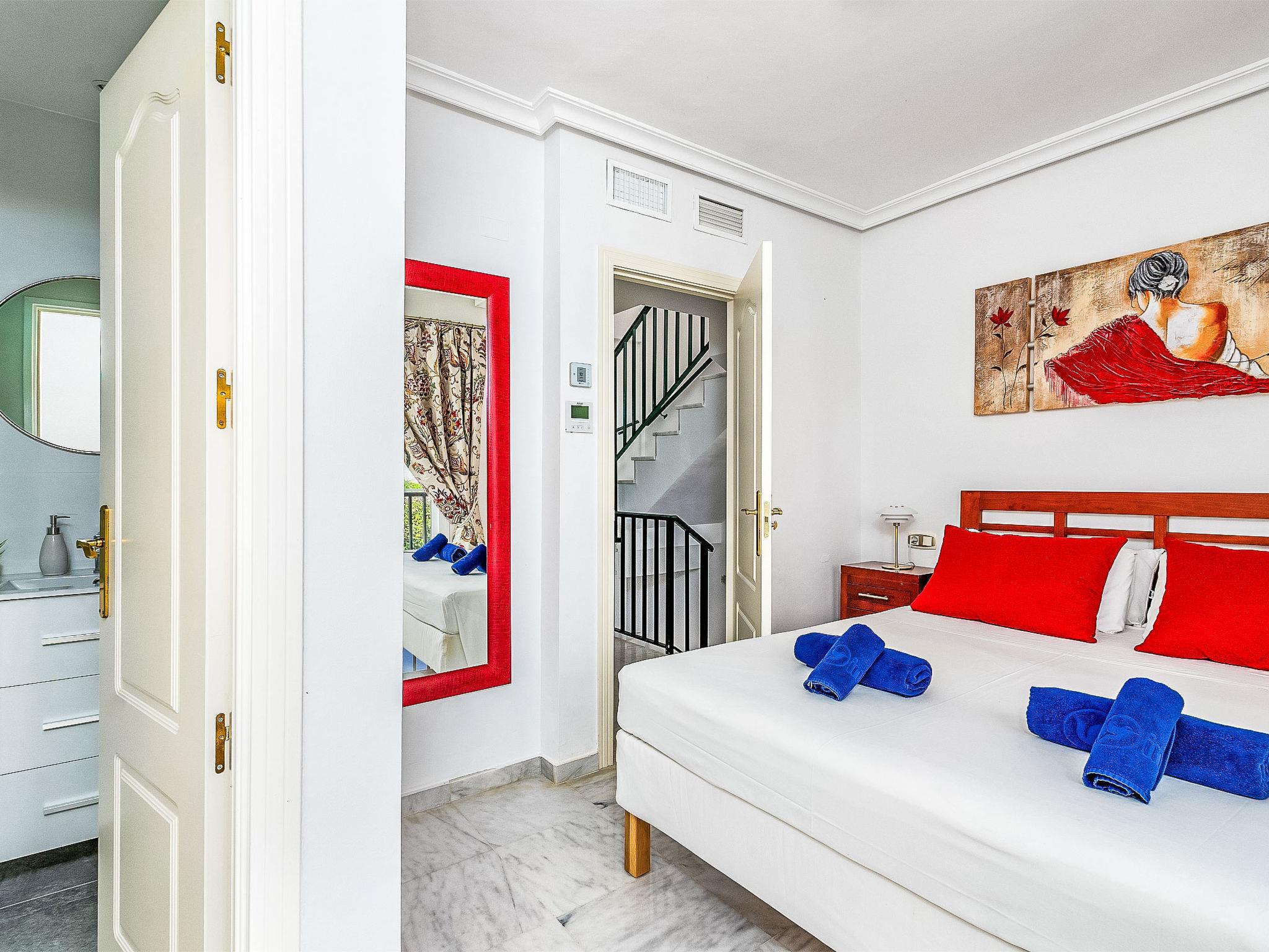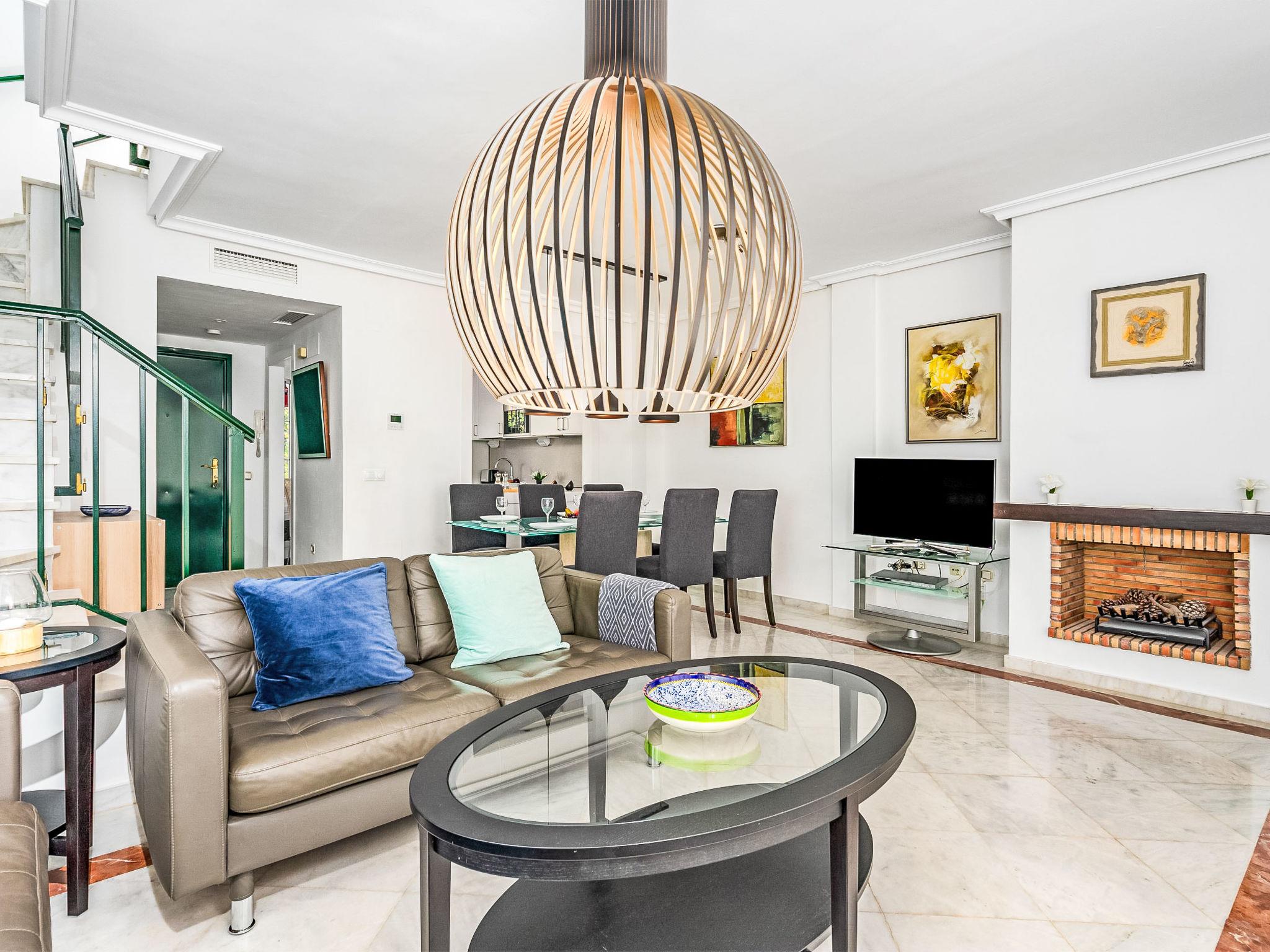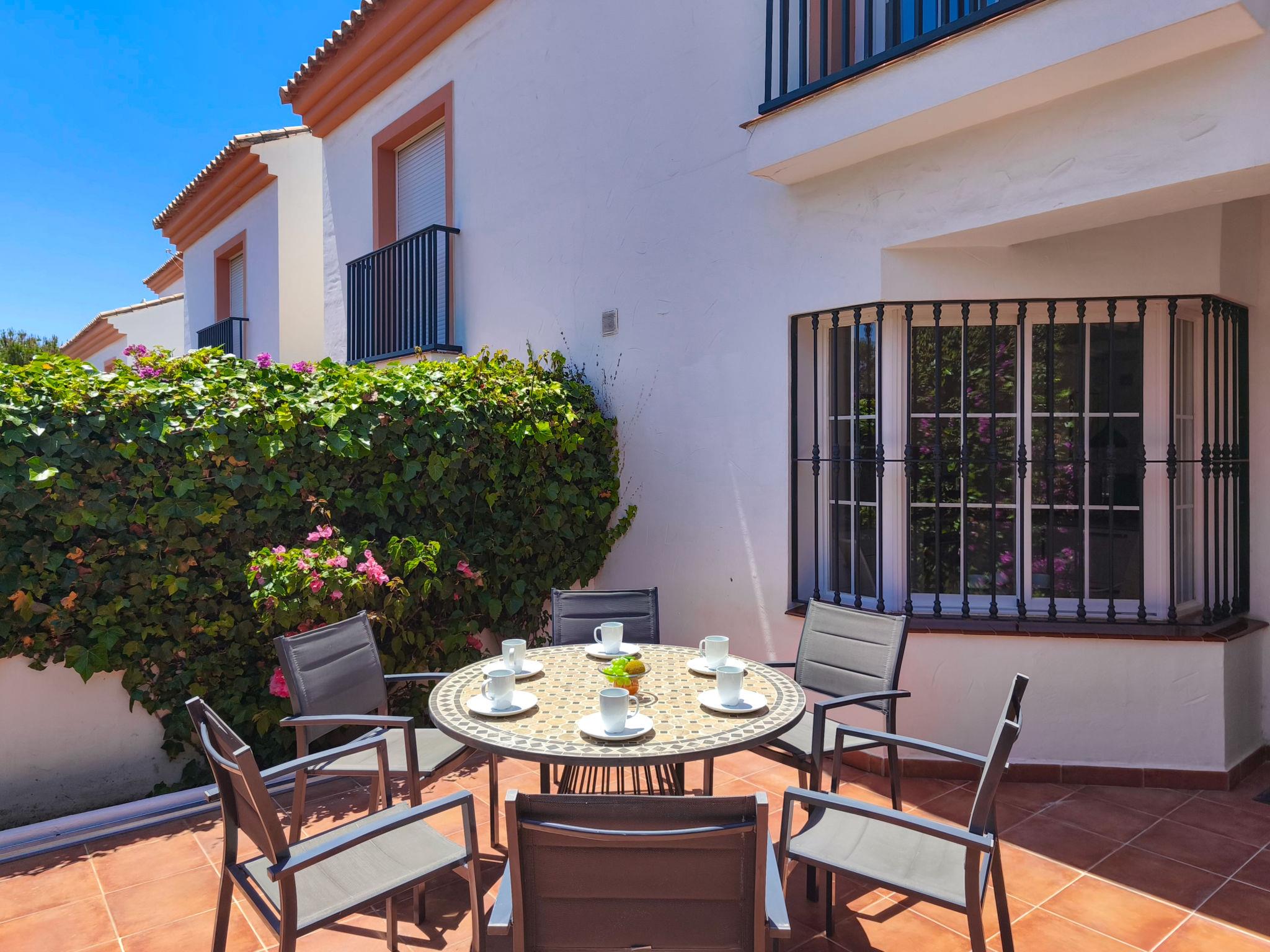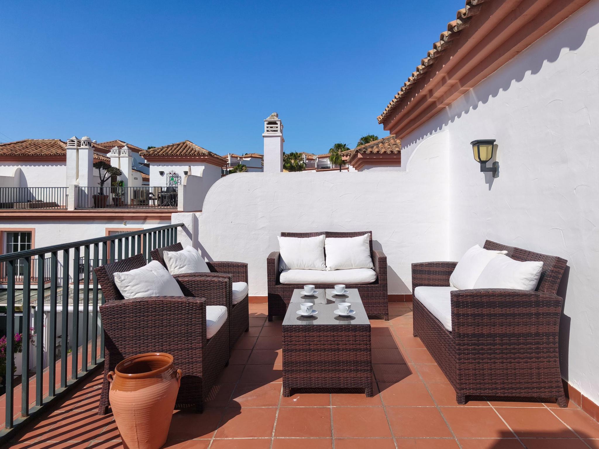Cabopino: Beautiful terraced house "Las lomas de Cabopino", built in 2002. 14 km from the centre of Marbella, 17 km from the centre of Fuengirola, in a quiet position, 1 km from the sea, 1 km from the beach. For shared use: garden with lawn, swimming pool (seasonal availability: 01.Jan. - 31.Dec. pool opening hours: 08:00-22:00). Children's pool, single garage. Shop 3 km, supermarket 3 km, restaurant 300 m, bus stop "Camping Cabopino" 250 m, sandy beach 1 km. Sports harbour 1 km, golf course (19 hole) 1.9 km. Please note: suitable for families. The owner does not accept any youth groups. Neighbourhood highly sensitive to noise. Quietness and good behaviour expected.