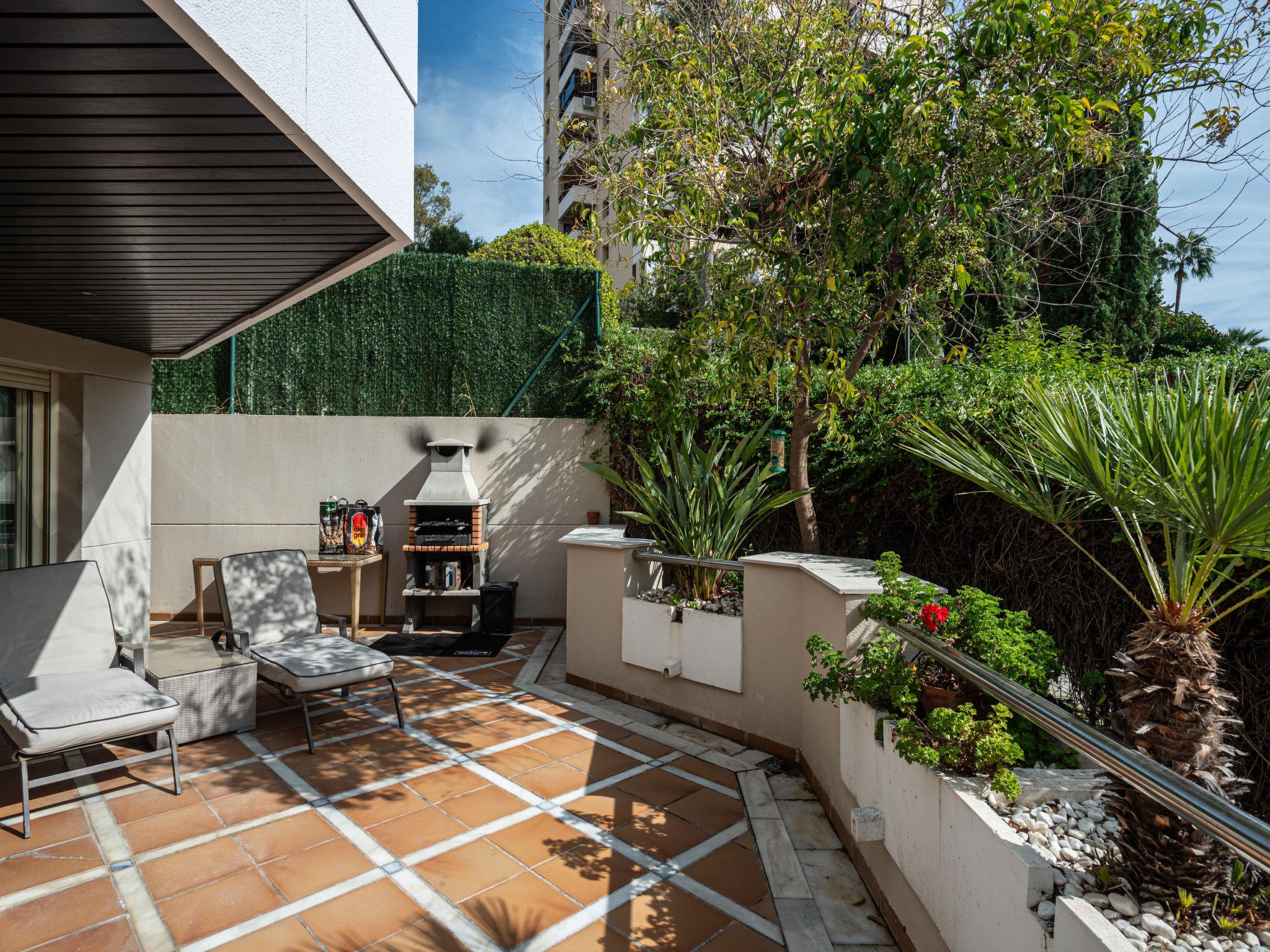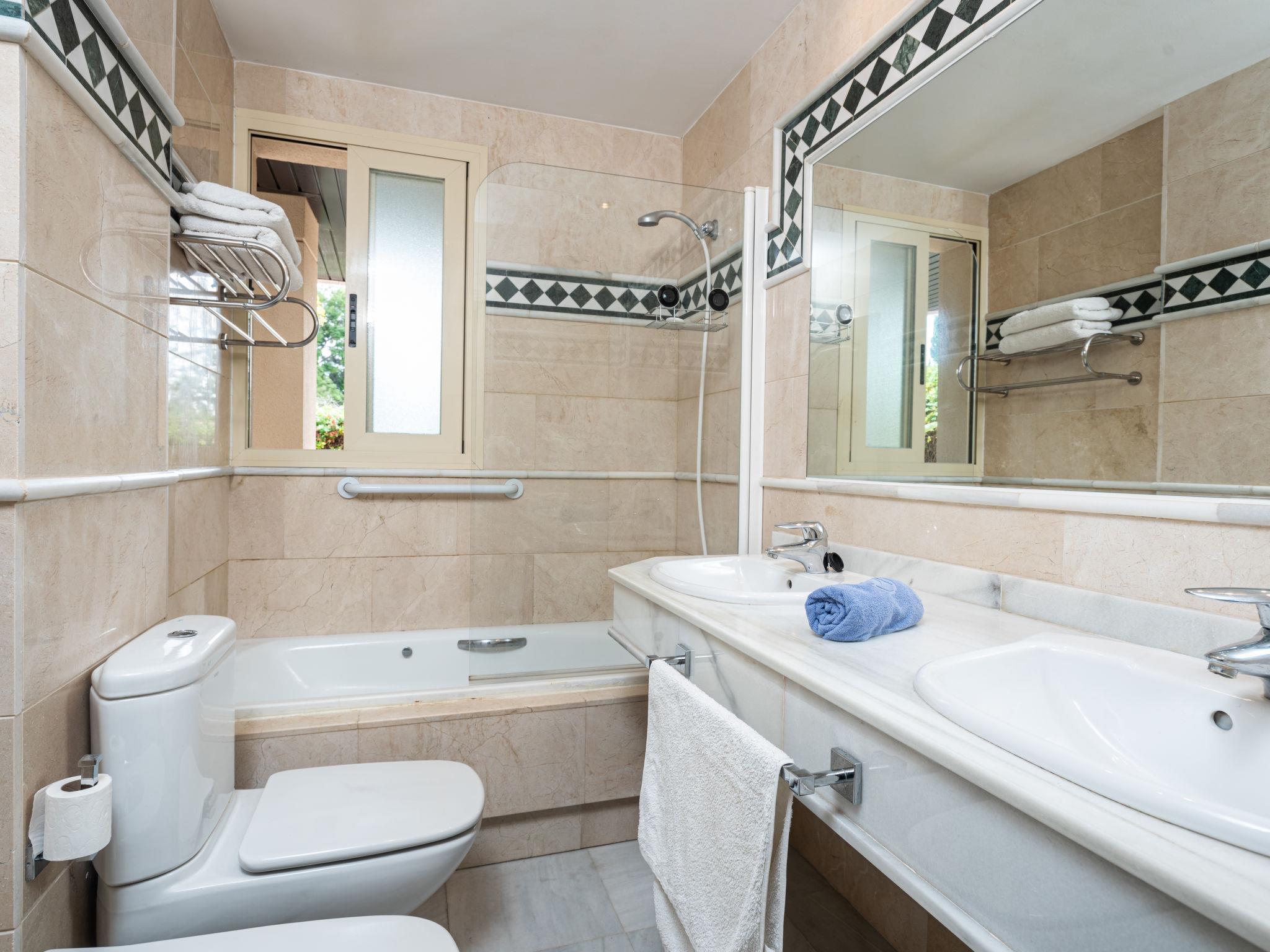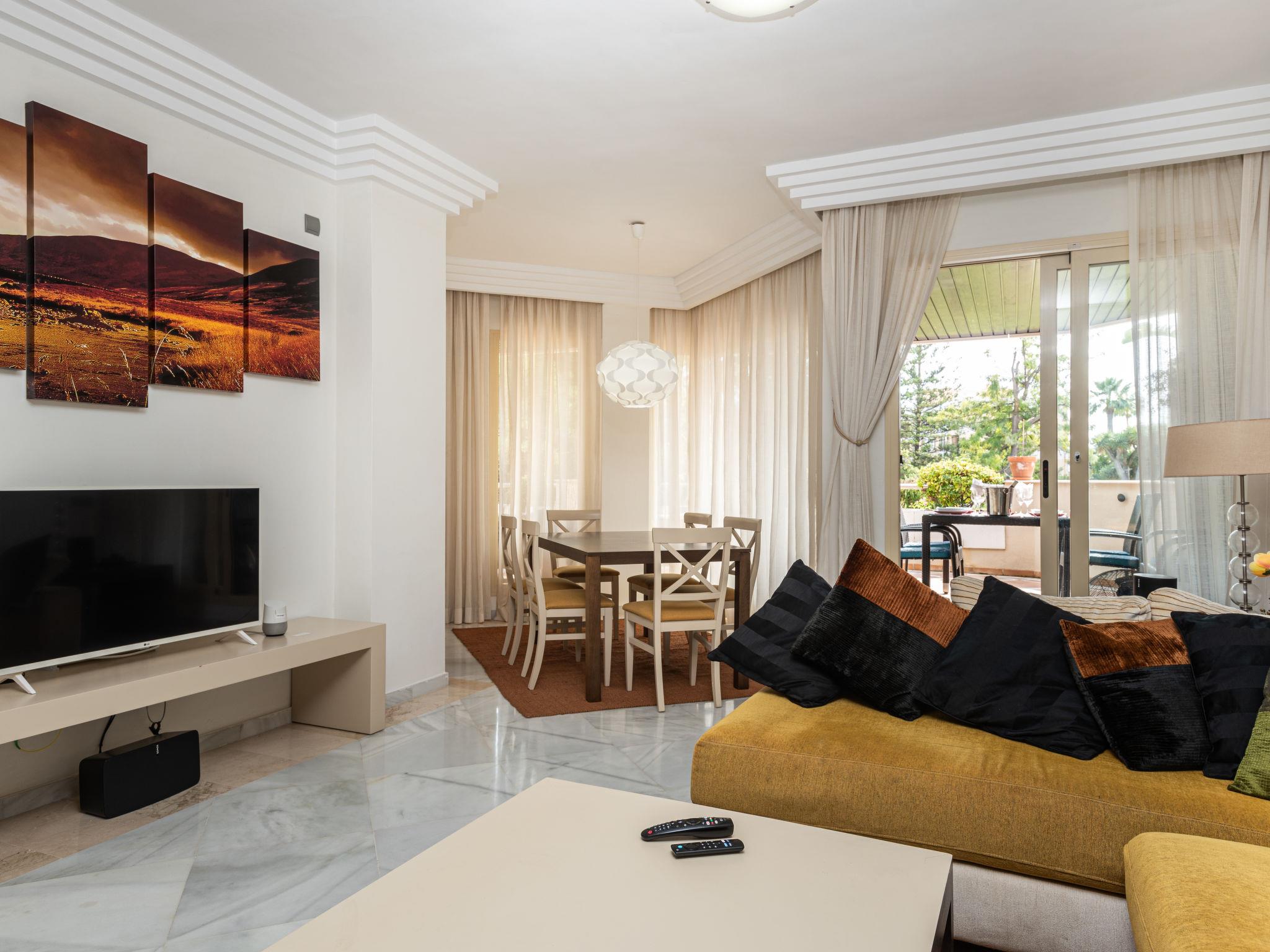 "Fuente Aloha", 3-room apartment 110 m2 on 1st floor. Spacious and bright, beautiful and tasteful furnishings: living/dining room with digital TV, air conditioning and forced-air heating. Exit to the terrace. 1 room with 1 french bed (150 cm, length 200 cm), air conditioning and forced-air heating. Exit to the terrace. 1 room with 2 beds (90 cm, length 190 cm), air conditioning and forced-air heating. Kitchen (oven, dishwasher, 3 ceramic glass hob hotplates, toaster, kettle, microwave, freezer, electric coffee machine). Exit to the balcony. Bath/bidet/WC, shower/WC. Terrace 28 m2. Terrace furniture, barbecue, deck chairs (2). View of the garden. Facilities: washing machine, iron, children's high chair, baby cot, hair dryer. Internet (WiFi, free). Garage space n 81. Please note: non-smokers only. VUT/MA/06324 // Reg. Nr.: ESFCTU0000290410006884660000000000000000VUT/MA/063246