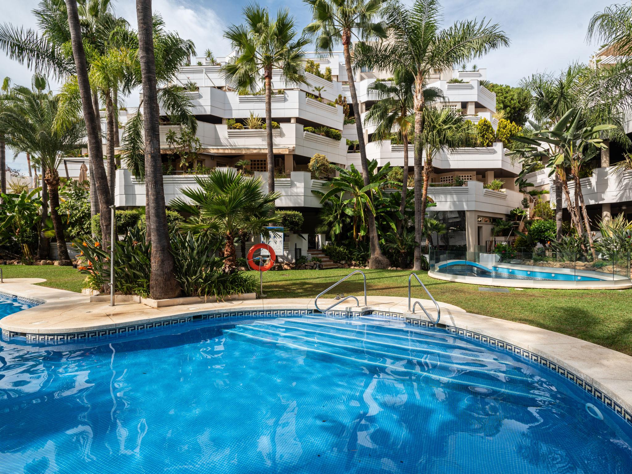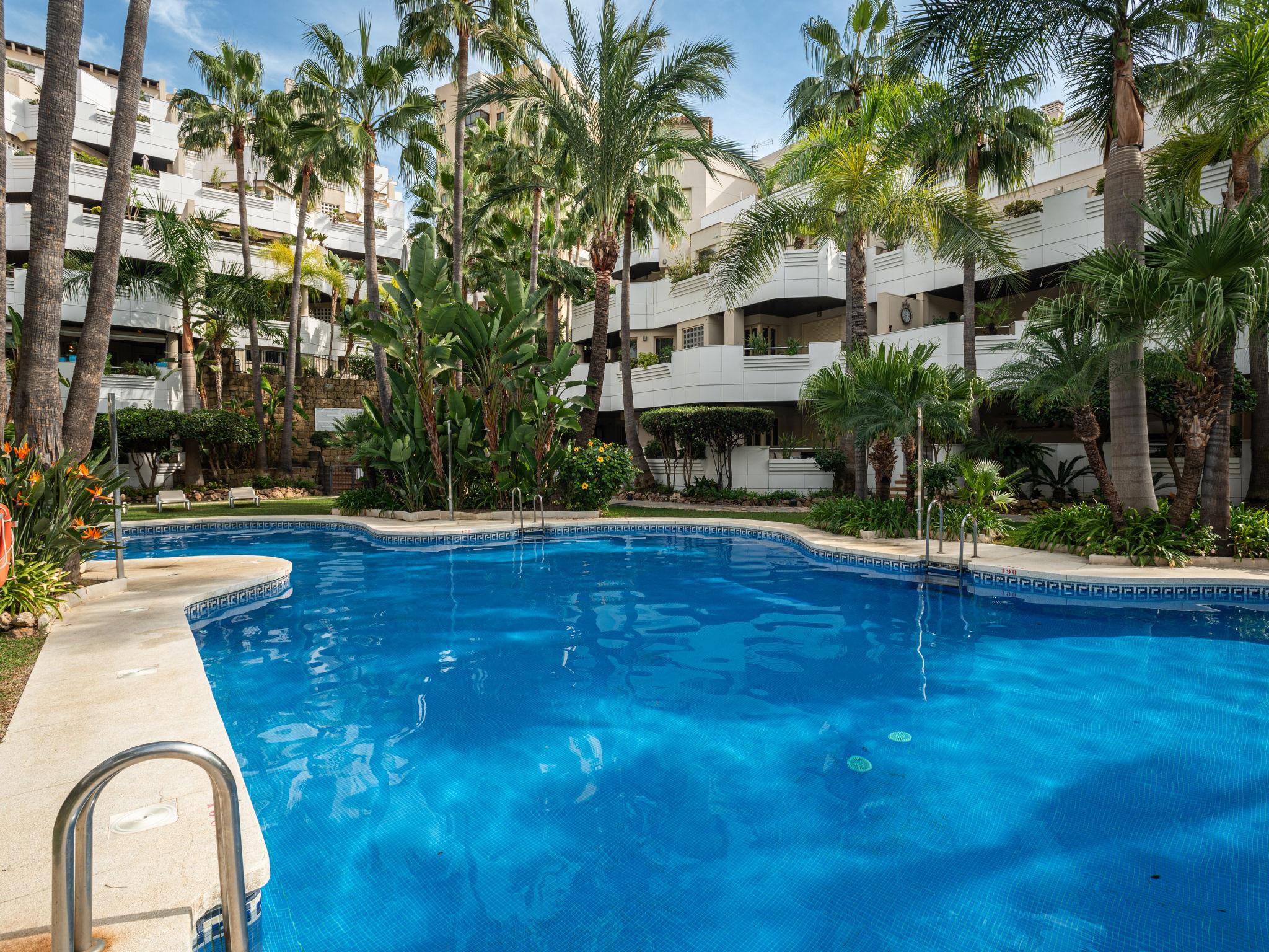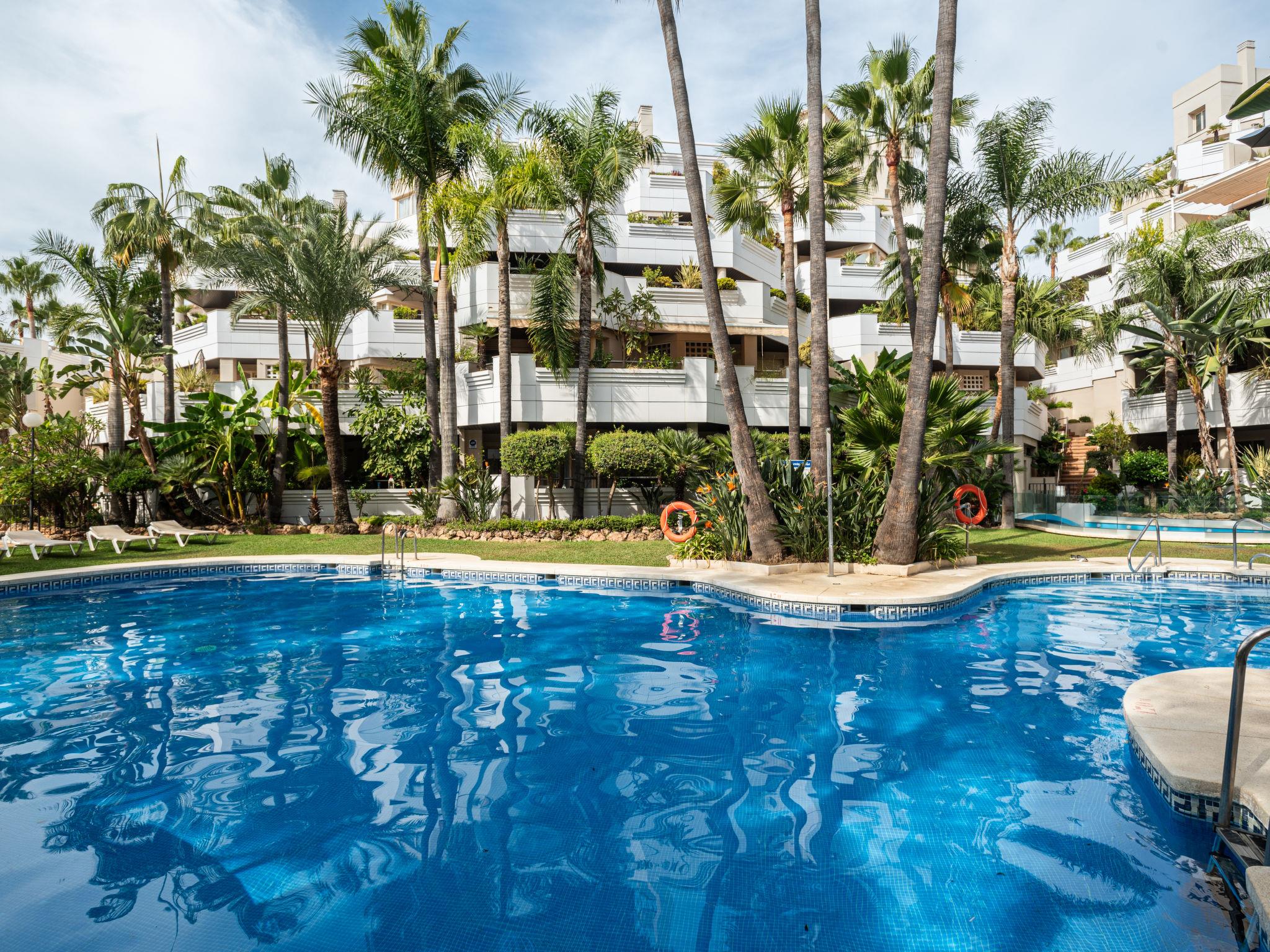 Nueva Andalucia: Cosy, comfortable apartment block "Fuente Aloha". In the resort Nueva Andalucía, 2 km from the centre of Puerto Banús, 7 km from the centre of Marbella, in a quiet, sunny position, 2.3 km from the sea, 2.3 km from the beach. For shared use: property (fenced), garden, 2 swimming pools heated (24 x 10 m, depth 130 - 210 cm, seasonal availability: 01.Jan. - 31.Dec.) with internal staircase. Outdoor shower. In the complex: sauna, fitness room, steam room, relaxation room, lift. Roofed, parking space n 81. Supermarket 500 m, restaurant 100 m, bus stop "Los Dragos" 650 m, sandy beach 1.2 km. Golf course (18 hole) 1.8 km. The owner does not accept any youth groups. There is a heated indoor pool size 8x4 m. depth: 0,8-1,5m.