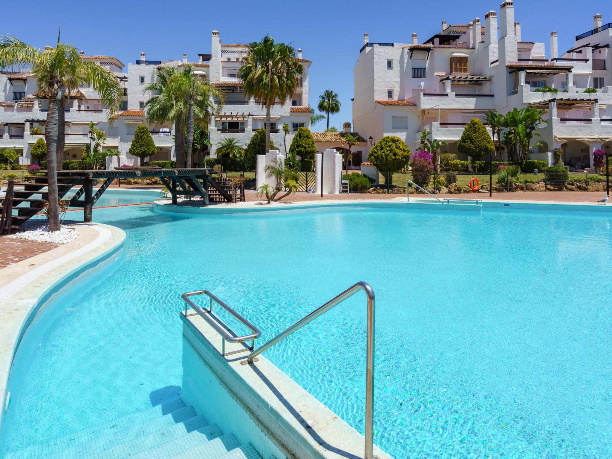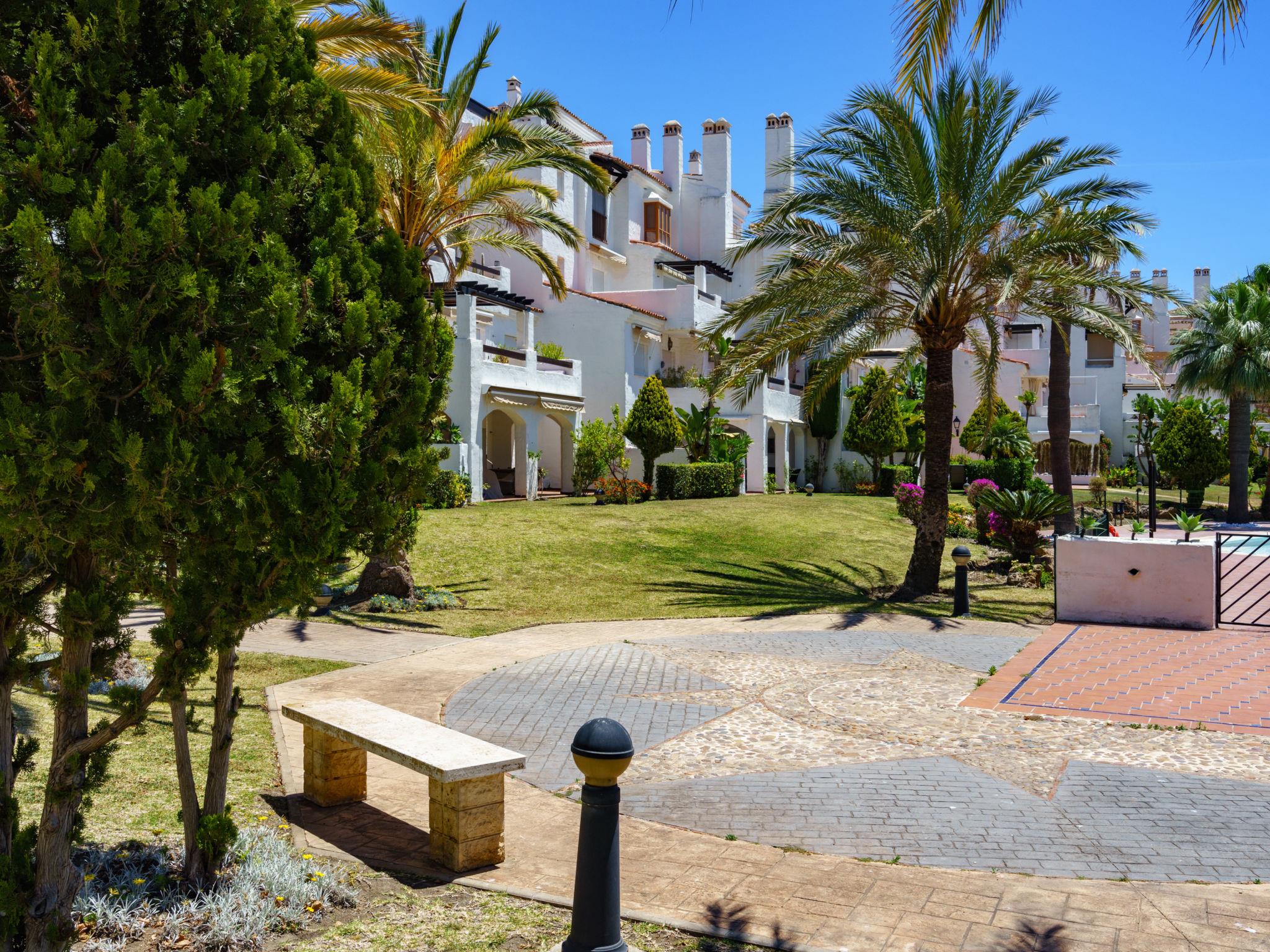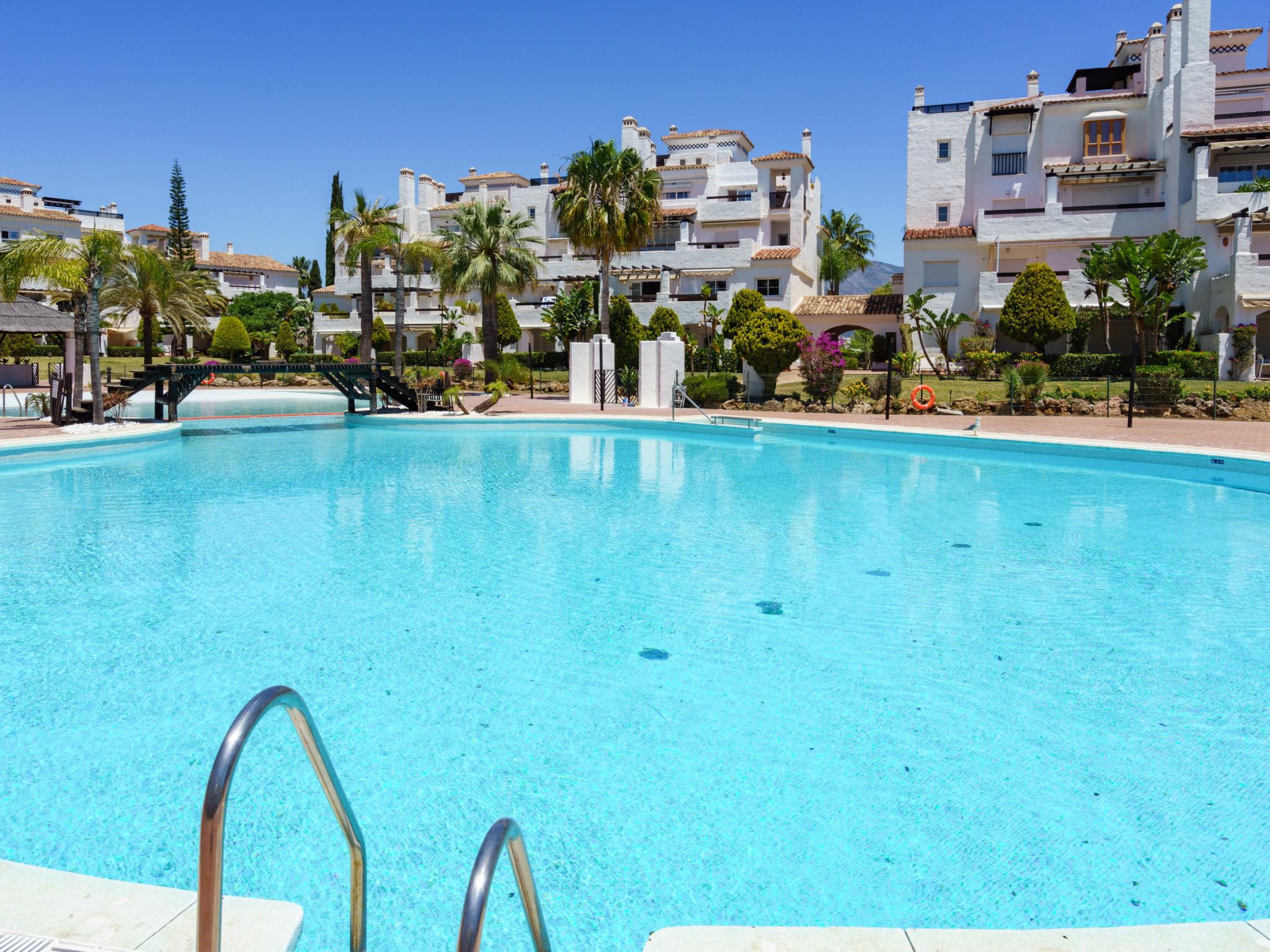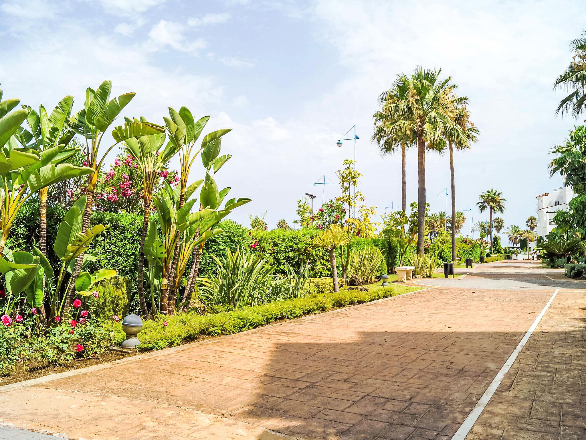 San Pedro playa: Beautiful apartment block "Las Adelfas". In the resort 400 m from the centre of San Pedro de Alcantara, 3 km from the centre of Puerto Banus, 7 km from the centre of Marbella, in a quiet, sunny position, 100 m from the sea, from the beach, road to cross. For shared use: beautiful garden to relax, 2 swimming pools (40 x 20 m, depth 5 - 220 cm, seasonal availability: 01.May. - 30.Sep.). Children's pool, outdoor shower. In the house: air conditioning, washing machine. Communal covered parking. Bus stop "Boulevard San Pedro" 900 m, sandy beach 100 m. Golf course (18 hole) 2 km. 24hr guard. Neighbourhood highly sensitive to noise. Quietness and good behaviour expected.