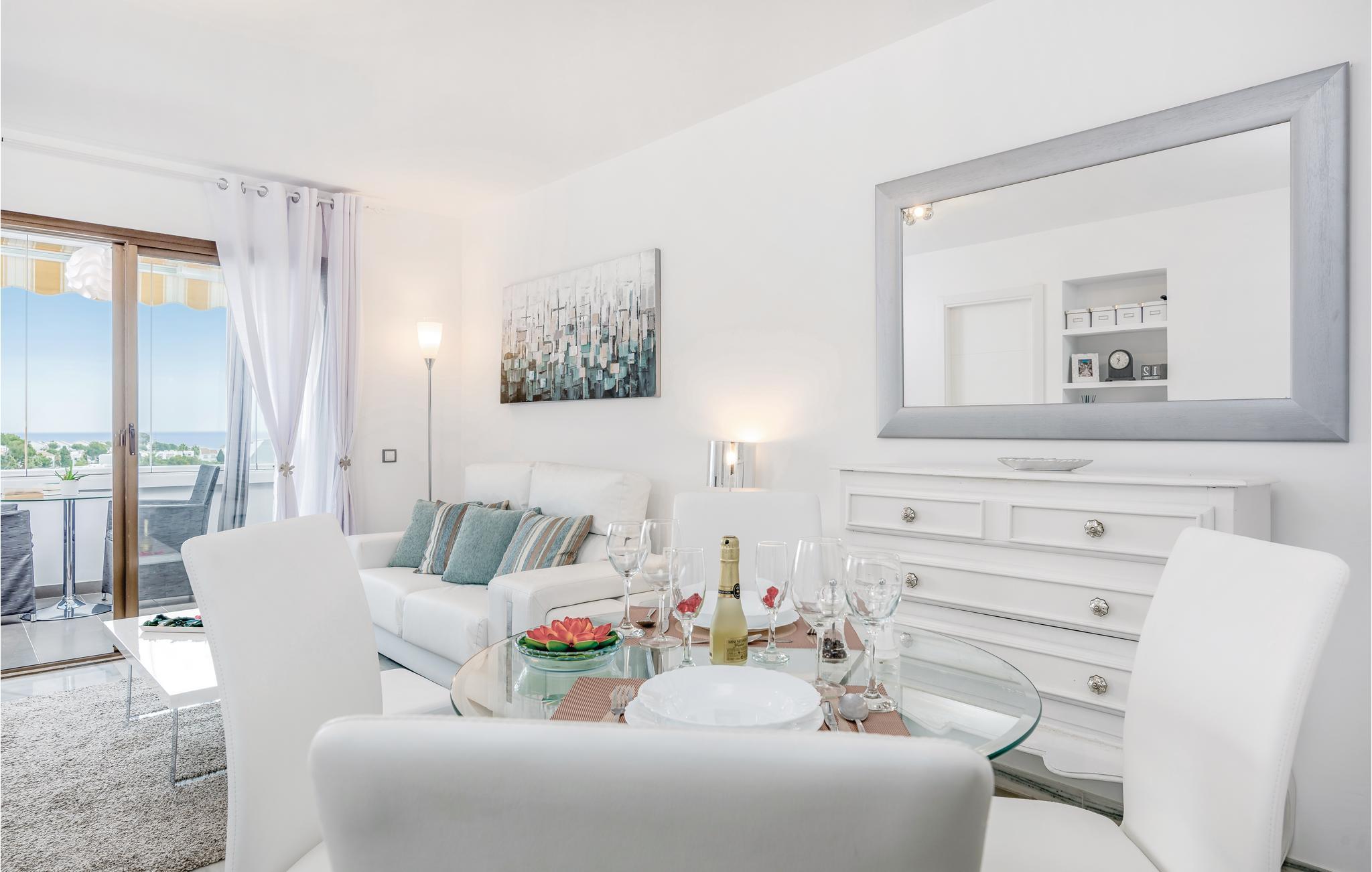 Luksuøs ferielejlighed der er stilfuldt indrettet med sans for små deltaljer. Gennem den store vinduesfront er der udsigt ud over både ferieanlægget og havet. I lejligheden er der to soveværelser og to badeværelser. Fra anlægget er der en fantastisk udsigt ud over både middelhavet og bjergene. Til dette anlæg hører en velplejet have og en fælles pool. Det tager kun få minutter at få til restauranter, supermarked osv. I kan parkere på en parkeringsplads med elektrisk port, der ligger i anlægget.