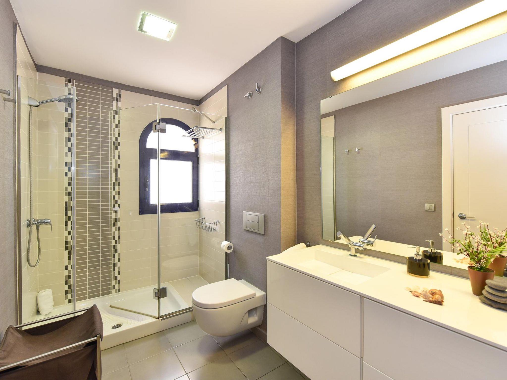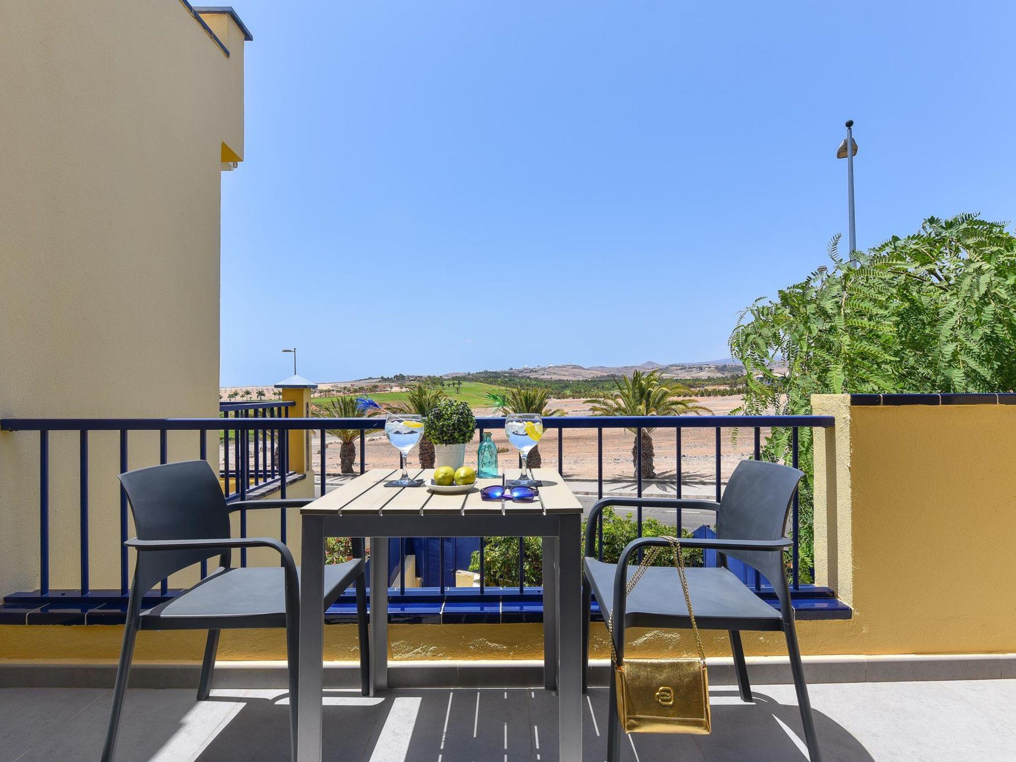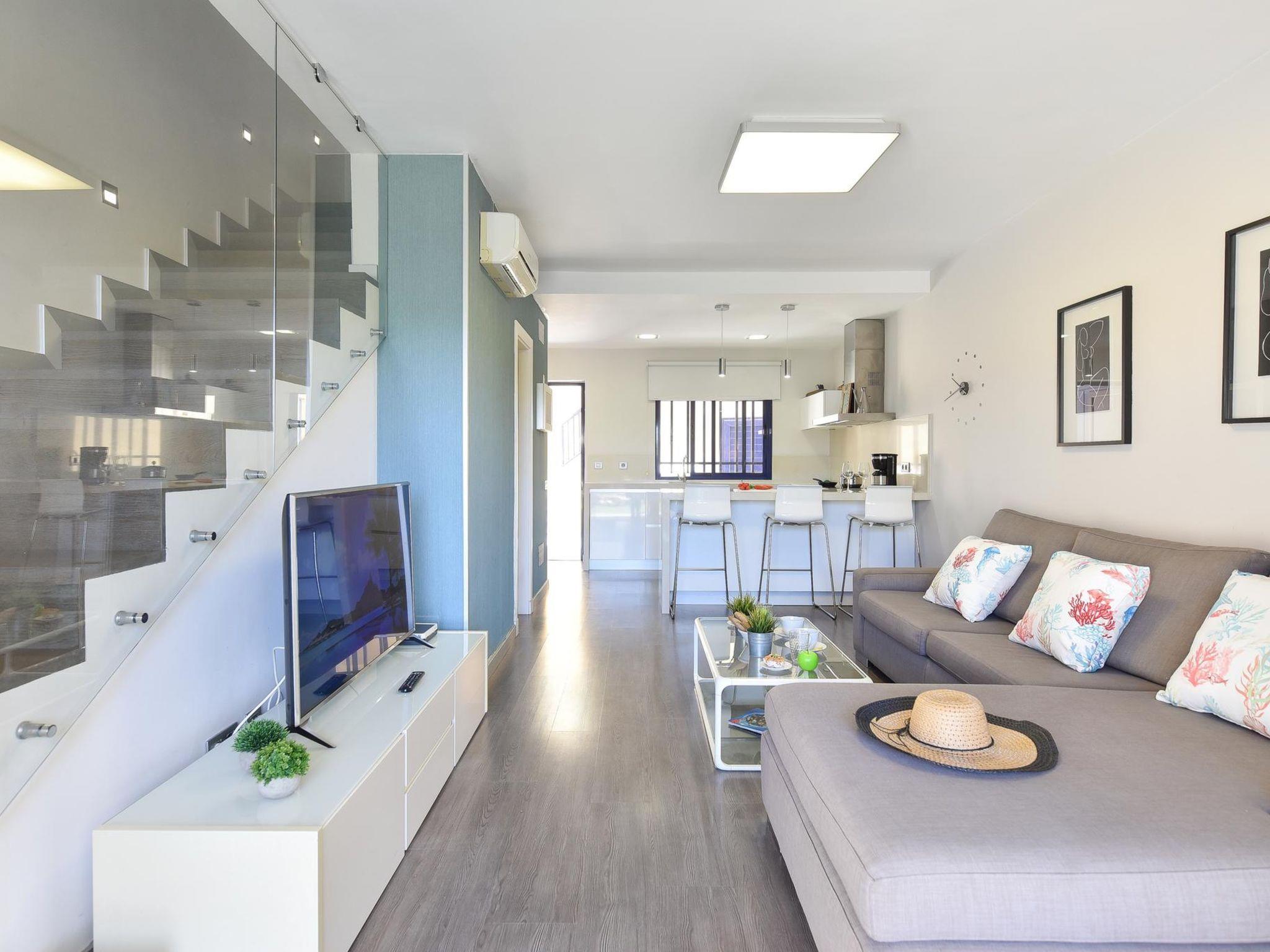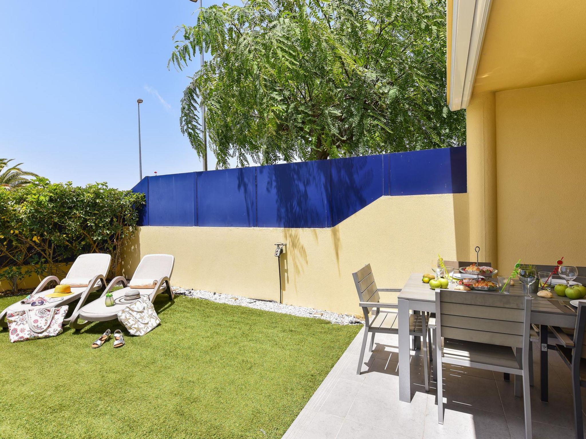 3-room house 95 m2 on 2 levels. Modern and luxurious furnishings: living/dining room with dining nook, digital TV, DVD and air conditioning. Exit to the patio. Open kitchen (oven, dishwasher, 4 ceramic glass hob hotplates, toaster, kettle, microwave, freezer, electric coffee machine). Shower/WC. Upper floor: 1 room with 1 french bed and air conditioning. Exit to the balcony. 1 room with 2 beds and air conditioning. Balcony, patio. Terrace furniture, balcony furniture, barbecue, deck chairs. View of the sea, the mountains, the garden and golf course. Facilities: washing machine, dryer, iron, children's high chair, baby cot for up to 2 year olds, hair dryer. Internet (WiFi, free). Please note: non-smoking house. 2021-T1110 // Reg. Nr.: ESFCTU0000350120003597630000000000000VV-35-1-00154840