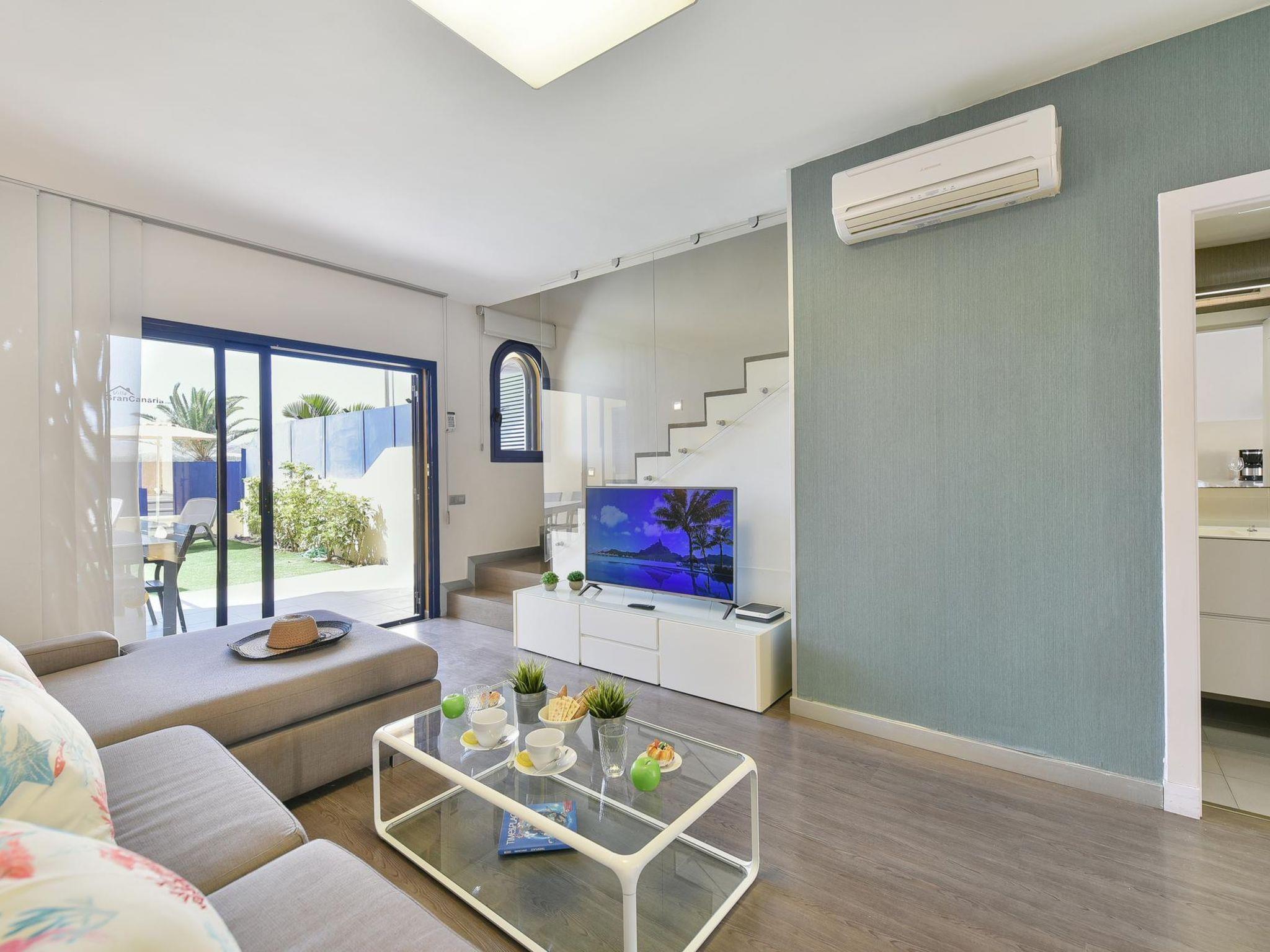 Comfortable, luxurious bungalow "Meloneras 7". In the centre of Meloneras, on the outskirts Maspalomas, in a quiet, sunny position, 350 m from the sea, 350 m from the beach. For shared use: swimming pool (seasonal availability: 01.Jan. - 31.Dec.). Children's pool, outdoor shower. Private: garden (fenced) with lawn. Barbecue. In the house: air conditioning. Public parking on the road. Shop, grocery, supermarket 400 m, restaurant 350 m, bus stop "Hospital Meloneras" 450 m, sandy beach 350 m. Golf course (18 hole) 1.5 km. The owner does not accept any youth groups. Please note: airfield 38 km from the property. Neighbourhood highly sensitive to noise. Quietness and good behaviour expected.
