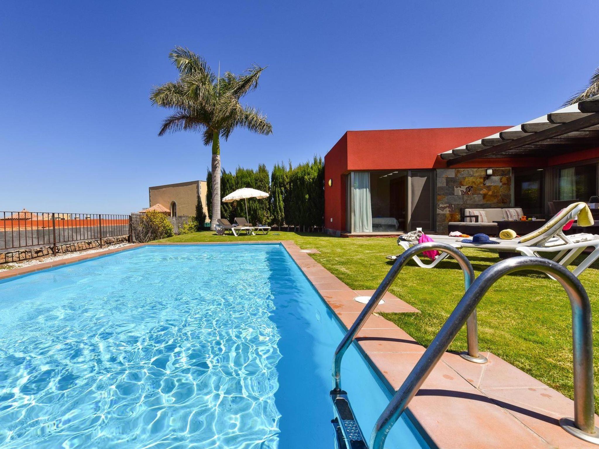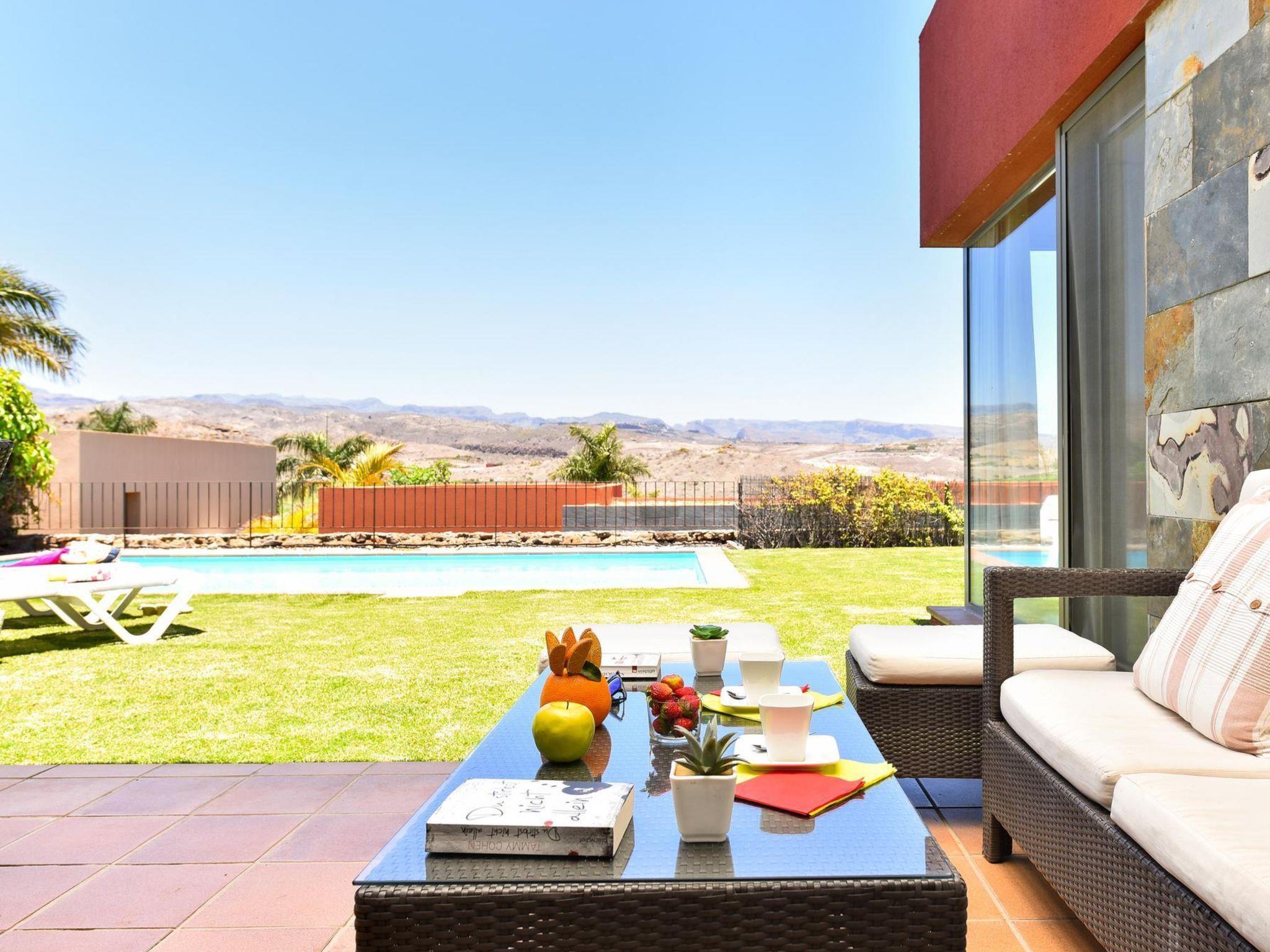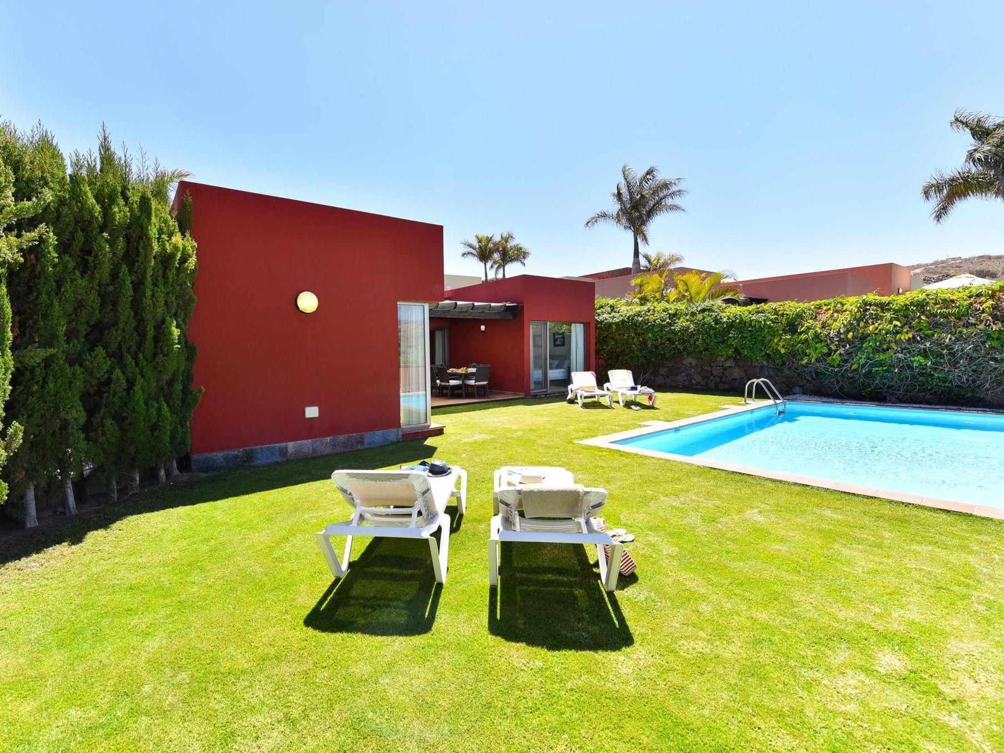 Modern, beautiful, comfortable villa "Par4 Villa 12". Salobre Golf Resort, in the centre Maspalomas 5 km Meloneras 7 km, in a sunny, elevated position, excellent location: right in the centre but still quiet. Private: property 380 m2 (fenced), garden 80 ha, lawn for sunbathing, swimming pool (8 x 4 m, seasonal availability: 01.Jan. - 31.Dec.). Patio, arbour, garden furniture, barbecue. In the house: WiFi, air conditioning, washing machine, tumble dryer. Shop 4 km, supermarket 3 km, restaurant 200 m, bus stop "Las Crucitas" 19 km, sandy beach "3000". Golf course (18 hole) 50 m. Please note: car recommended. Suitable for families, suitable for seniors baby equipment on request. The owner does not accept any youth groups. Airfield 25 km from the property.
