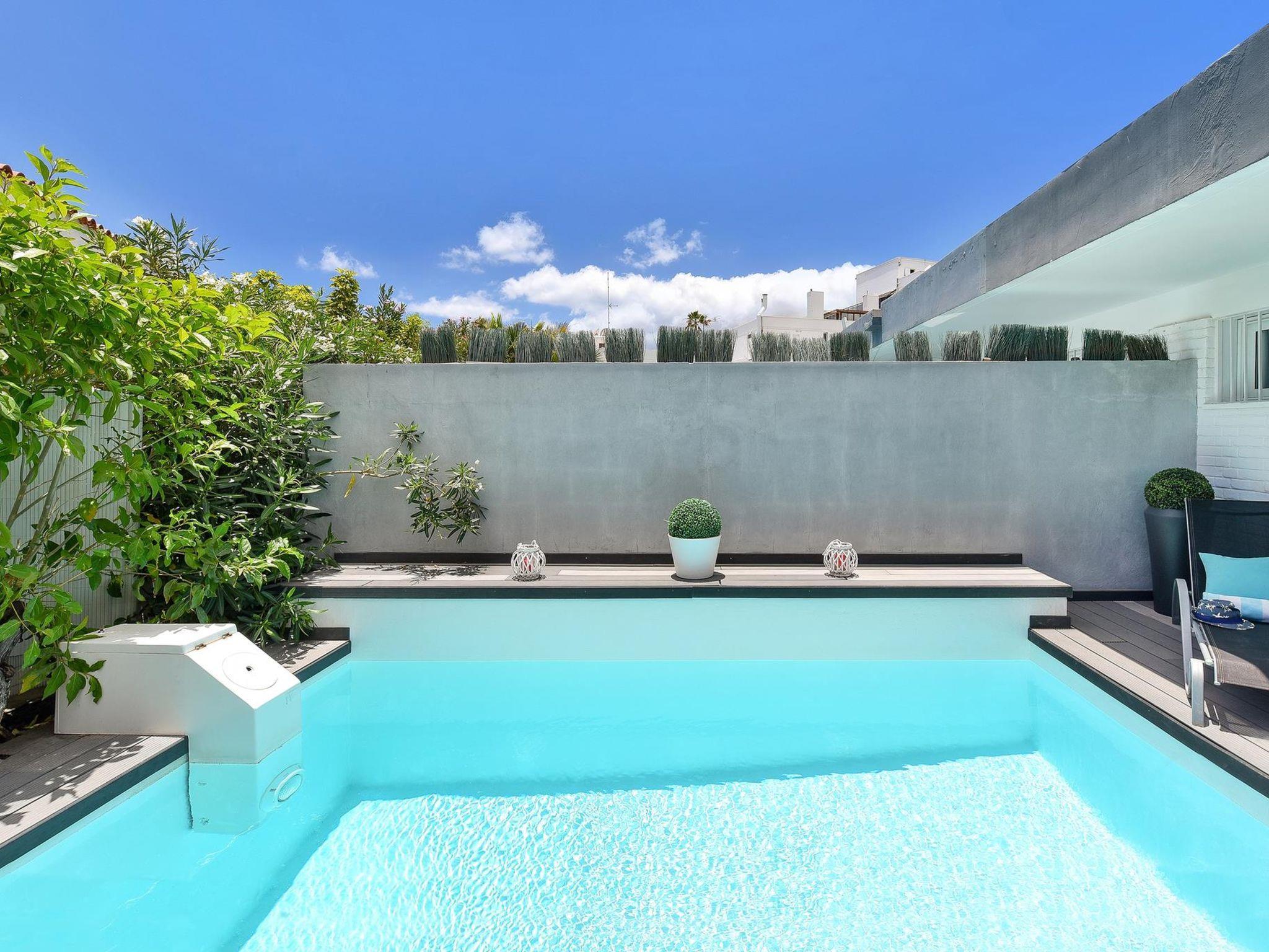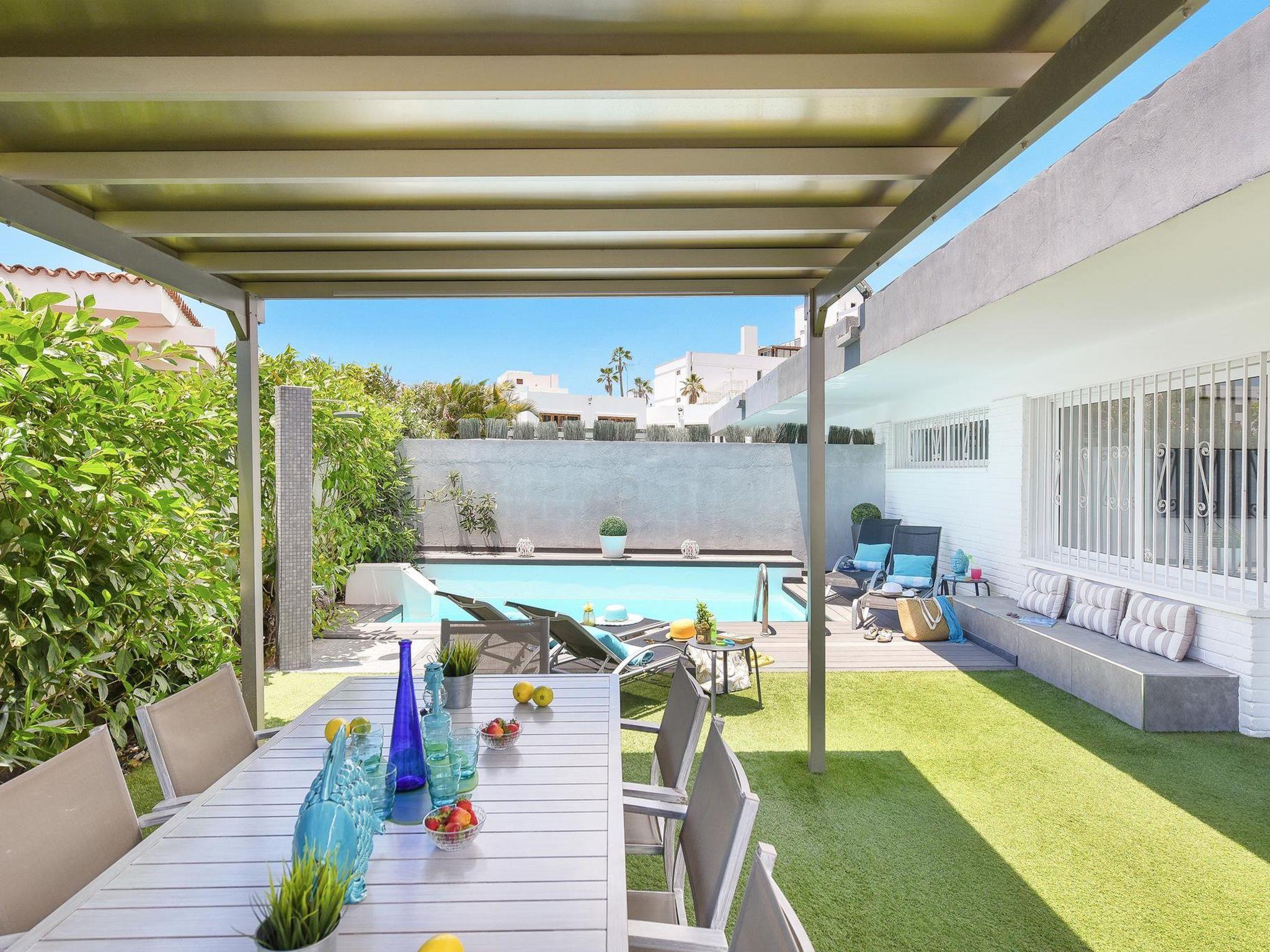 Modern bungalow "ET1 Beach house w/private pool", renovated in 2015. San Agustín, on the outskirts Maspalomas, excellent location: right in the centre but still quiet. Private: property (fenced), beautiful garden, swimming pool (seasonal availability: 01.Jan. - 31.Dec.). In the house: air conditioning, washing machine, tumble dryer. Public car park. Shop, grocery, supermarket, restaurant 100 m, bus stop "San Agustín" 600 m, sandy beach "300". Golf course (18 hole) 6 km, tennis 7.5 km. Please note: car recommended. Suitable for families, suitable for seniors baby equipment on request. The owner does not accept any youth groups. Neighbourhood highly sensitive to noise. Quietness and good behaviour expected.