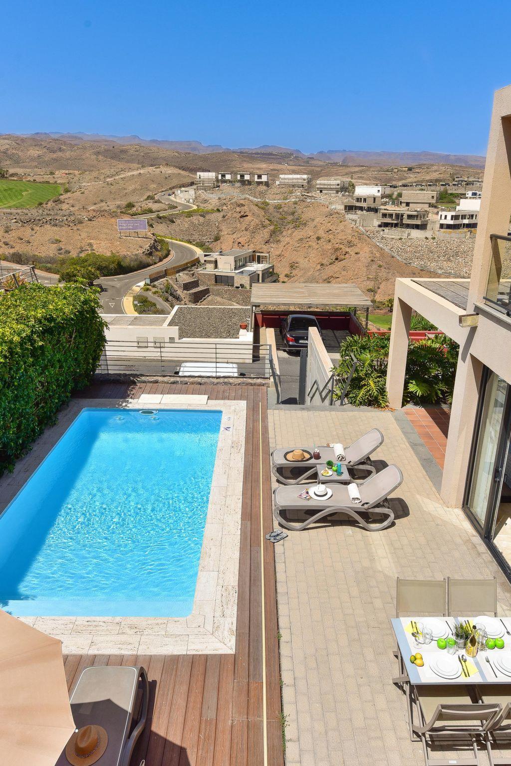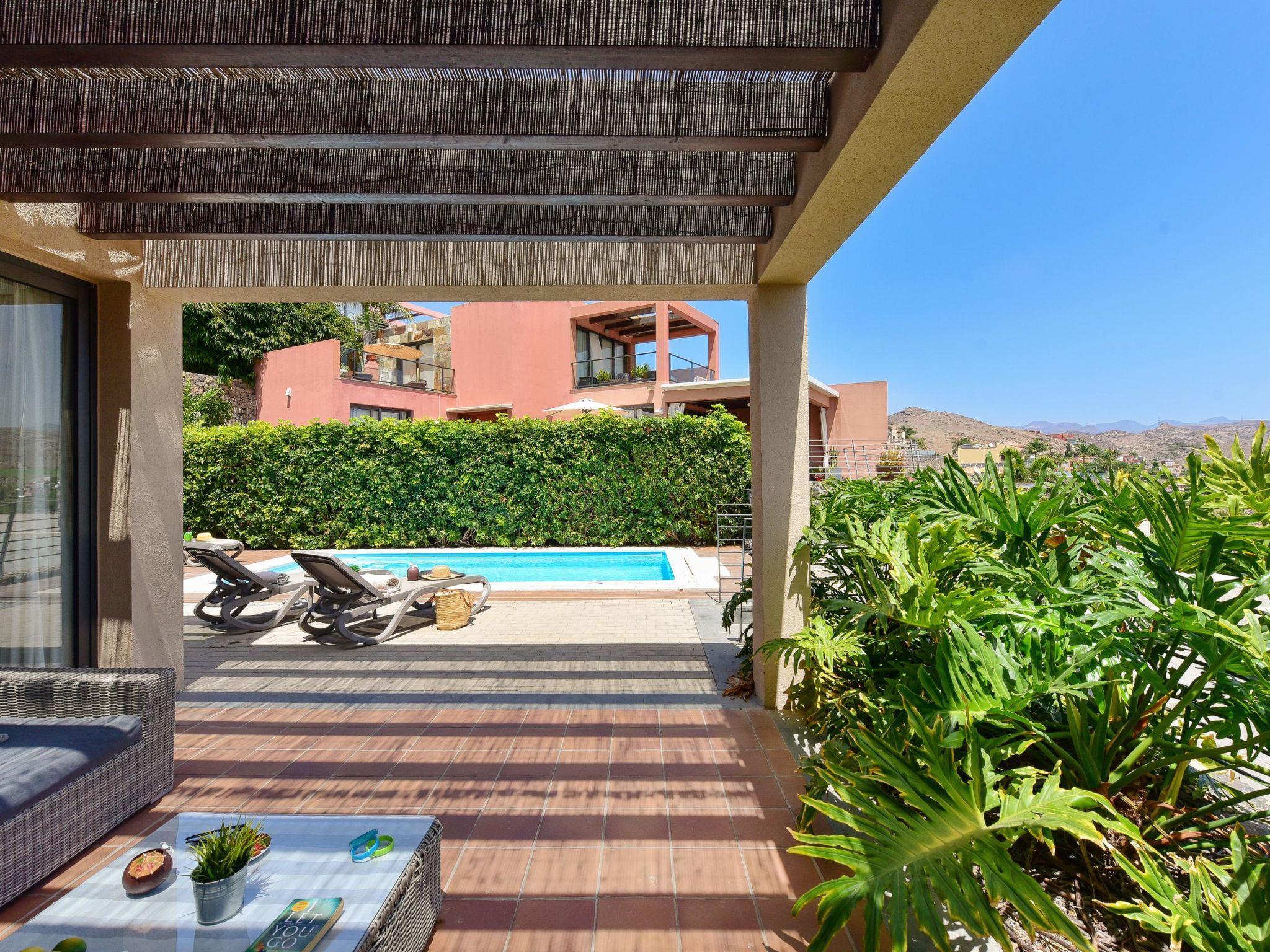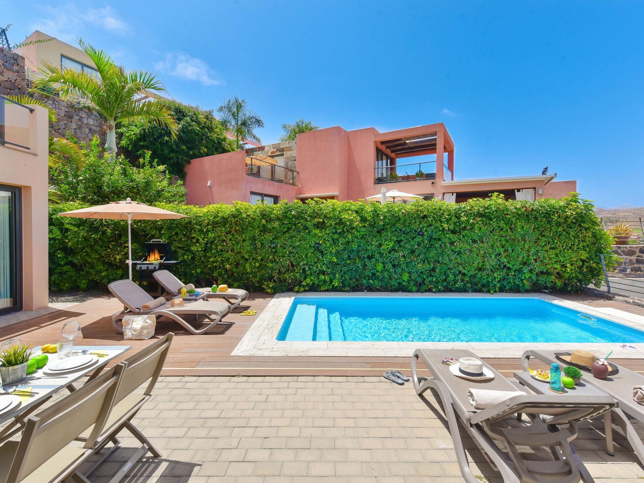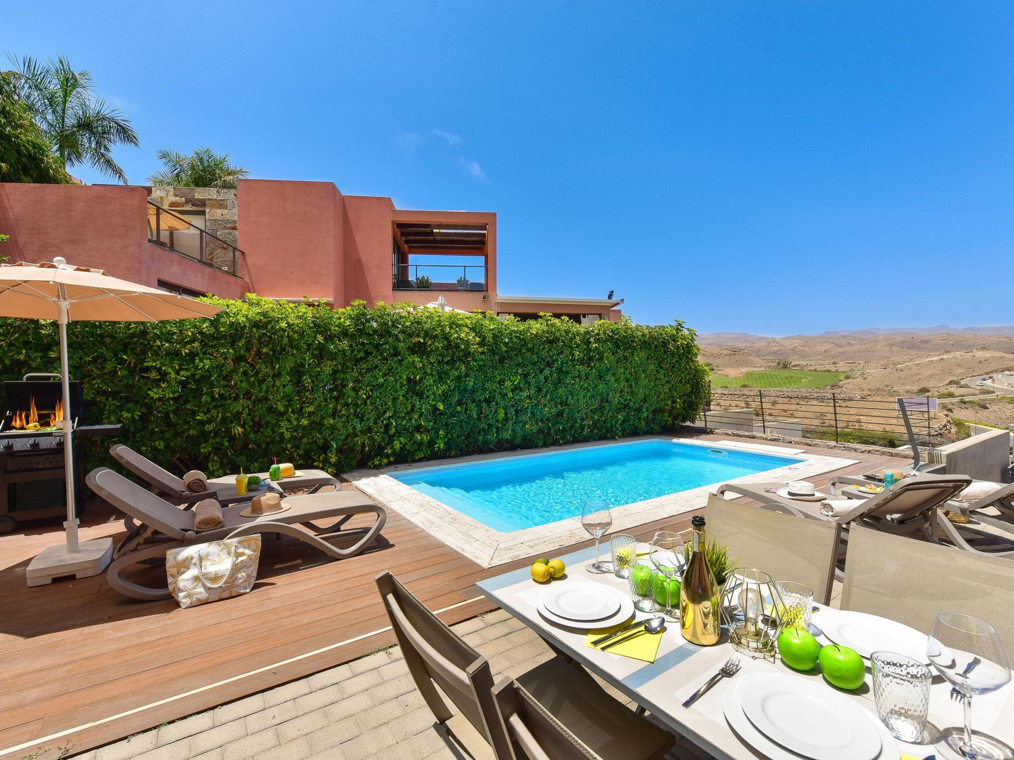 Cosy, luxurious villa "Las Terrazas 14". In the centre of Salobre Golf Resort, 1 km from the beach. Private: beautiful garden to relax, swimming pool angular (6 x 2 m, depth 140 cm, seasonal availability: 01.Jan. - 31.Dec.). Patio, arbour, pergola, garden furniture, barbecue. In the house: air conditioning. Parking at the house. Bus stop "Las Crucitas" 19 km. Please note: car recommended. On request. Object suitable for 4 adults. The owner does not accept any youth groups. Neighbourhood highly sensitive to noise. Quietness and good behaviour expected.