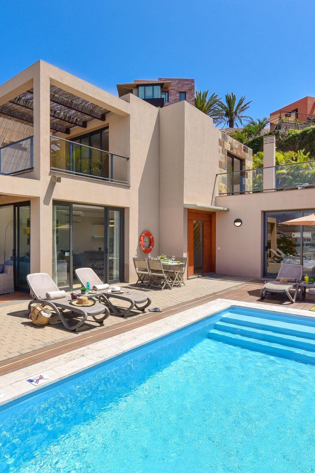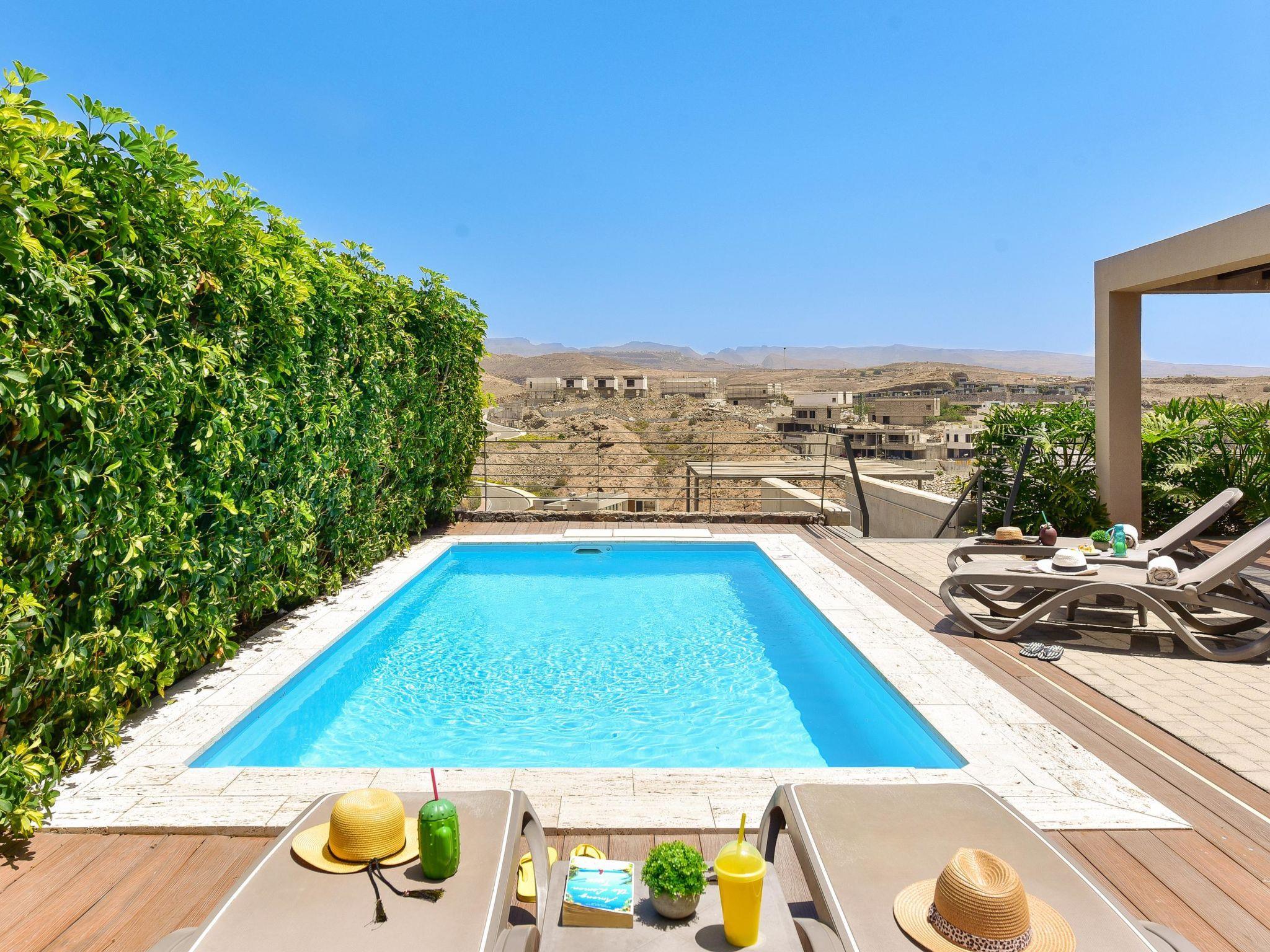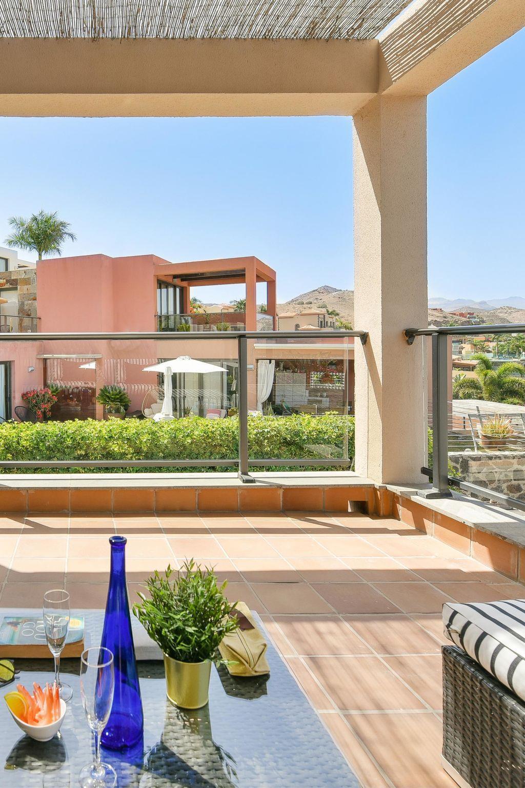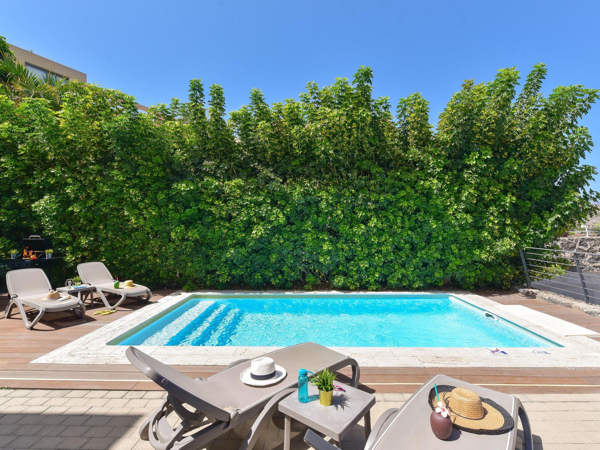 Cosy, luxurious villa "Las Terrazas 14". In the centre of Salobre Golf Resort, 1 km from the beach. Private: beautiful garden to relax, swimming pool angular (6 x 2 m, depth 140 cm, seasonal availability: 01.Jan. - 31.Dec.). Patio, arbour, pergola, garden furniture, barbecue. In the house: air conditioning. Parking at the house. Bus stop "Las Crucitas" 19 km. Please note: car recommended. On request. Object suitable for 4 adults. The owner does not accept any youth groups. Neighbourhood highly sensitive to noise. Quietness and good behaviour expected.