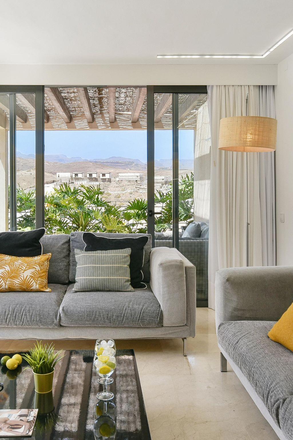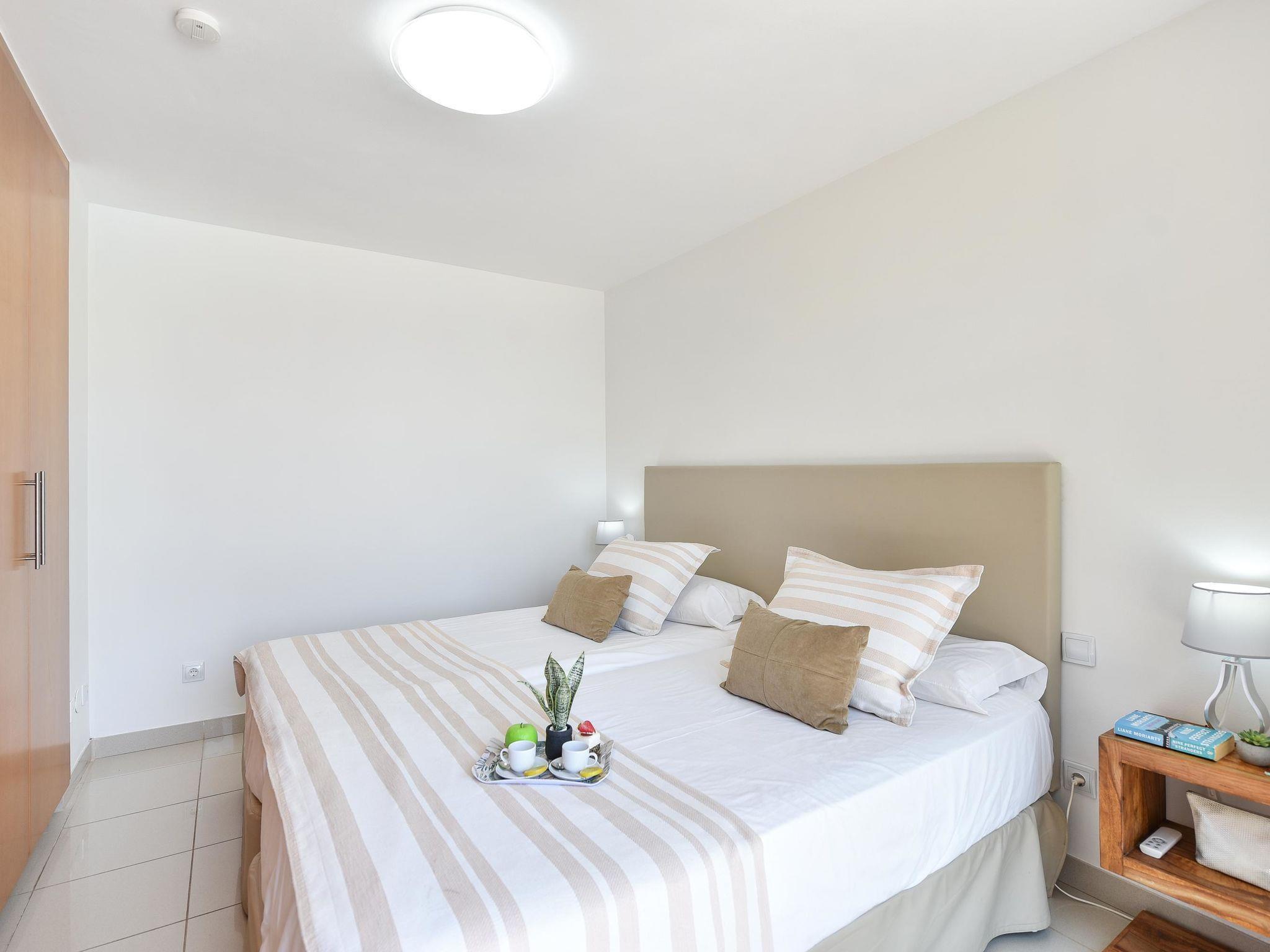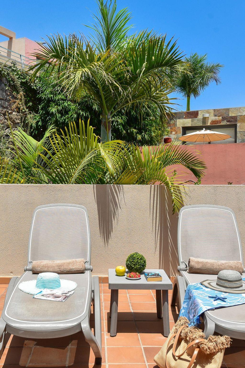 "Las Terrazas 14", 3-room villa 80 m2. Object suitable for 4 adults. Simple and luxurious furnishings: living/dining room with dining table, TV, flat screen and air conditioning. Exit to the patio. 1 room with 2 beds (90 cm, length 190 cm). 1 room with 1 double bed (135 cm, length 190 cm), air conditioning. Exit to the terrace. Open kitchen (oven, dishwasher, 4 ceramic glass hob hotplates, toaster, kettle, microwave, freezer, electric coffee machine) with dining table. 2 Baths/showers. Parquet floors. Porch. Terrace furniture, barbecue, deck chairs (4), covered balcony, sitting area. Beautiful view of the mountains. Facilities: washing machine, dryer, iron, children's high chair, baby cot for up to 2 year olds, hair dryer. Internet (WiFi, free). Parking at the house. Please note: suitable for families. Non-smokers only. Maximum 1 pet/ dog allowed. 2017/4185 // Reg. Nr.: ESFCTU00003501200031820300000000000000VV-35-1-0008972