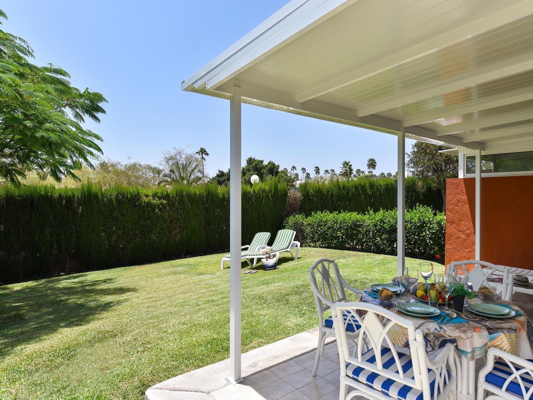 Very modern, comfortable 3-family house "Bungalow Melocotones PM49". In the resort Maspalomas, excellent location: right in the centre but still quiet. For shared use: beautiful garden to relax, swimming pool angular (seasonal availability: 01.Jan. - 31.Dec.). Outdoor shower, patio. Bus stop "AV. T.O. Neckermann" 300 m. Object suitable for 4 adults. The owner does not accept any youth groups. Neighbourhood highly sensitive to noise. Quietness and good behaviour expected.