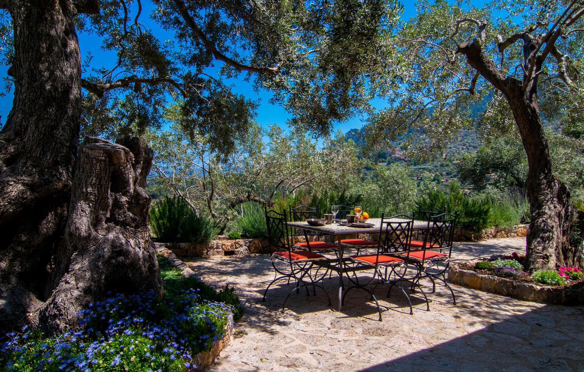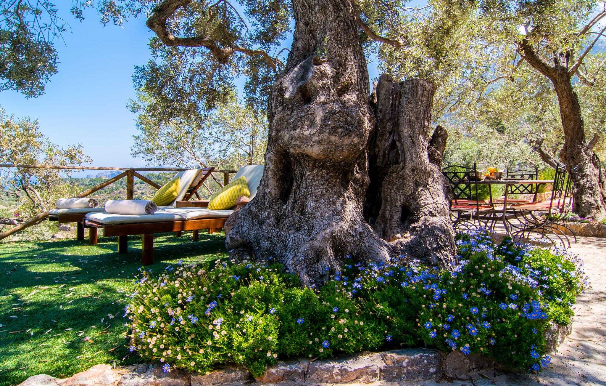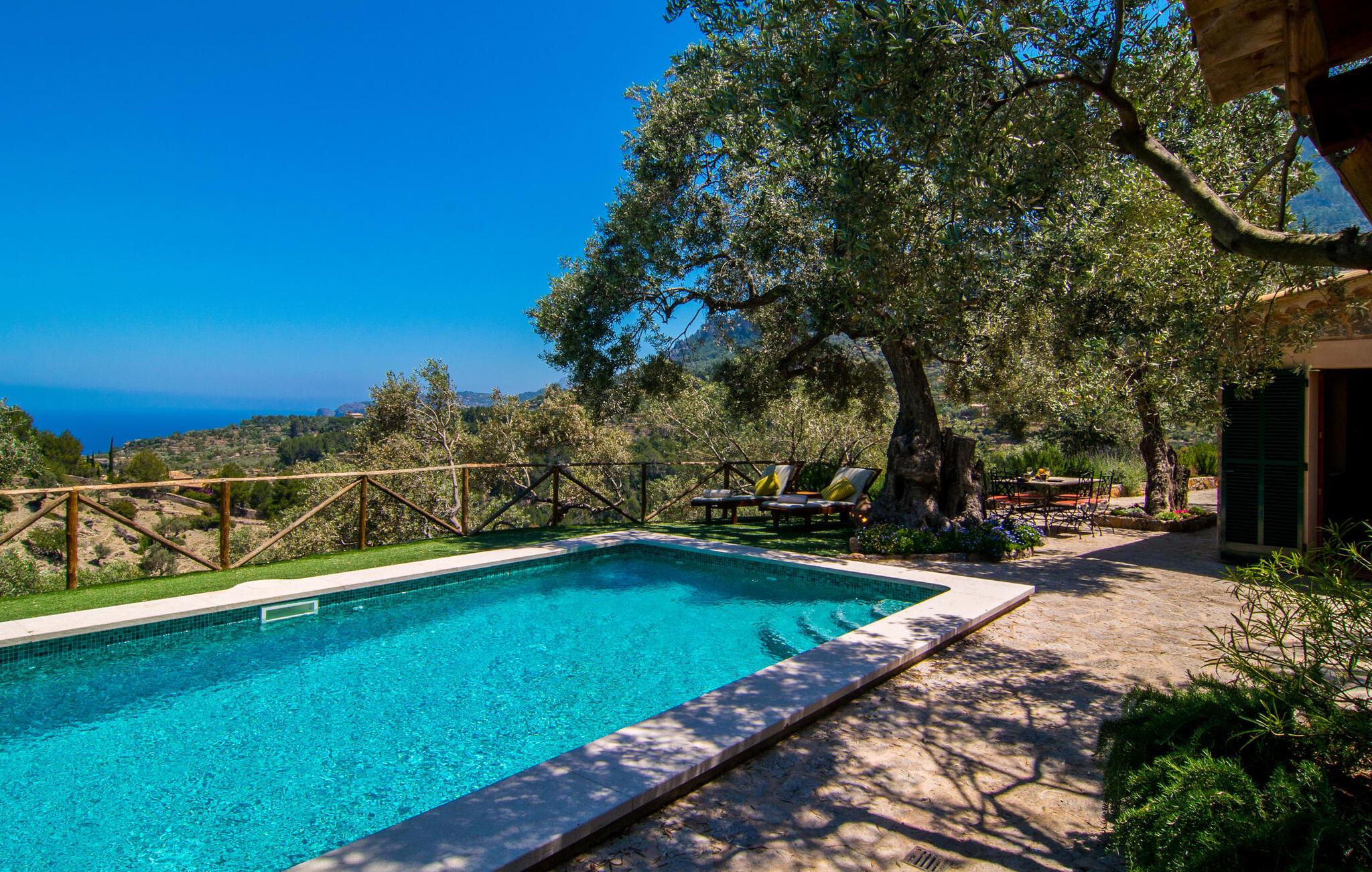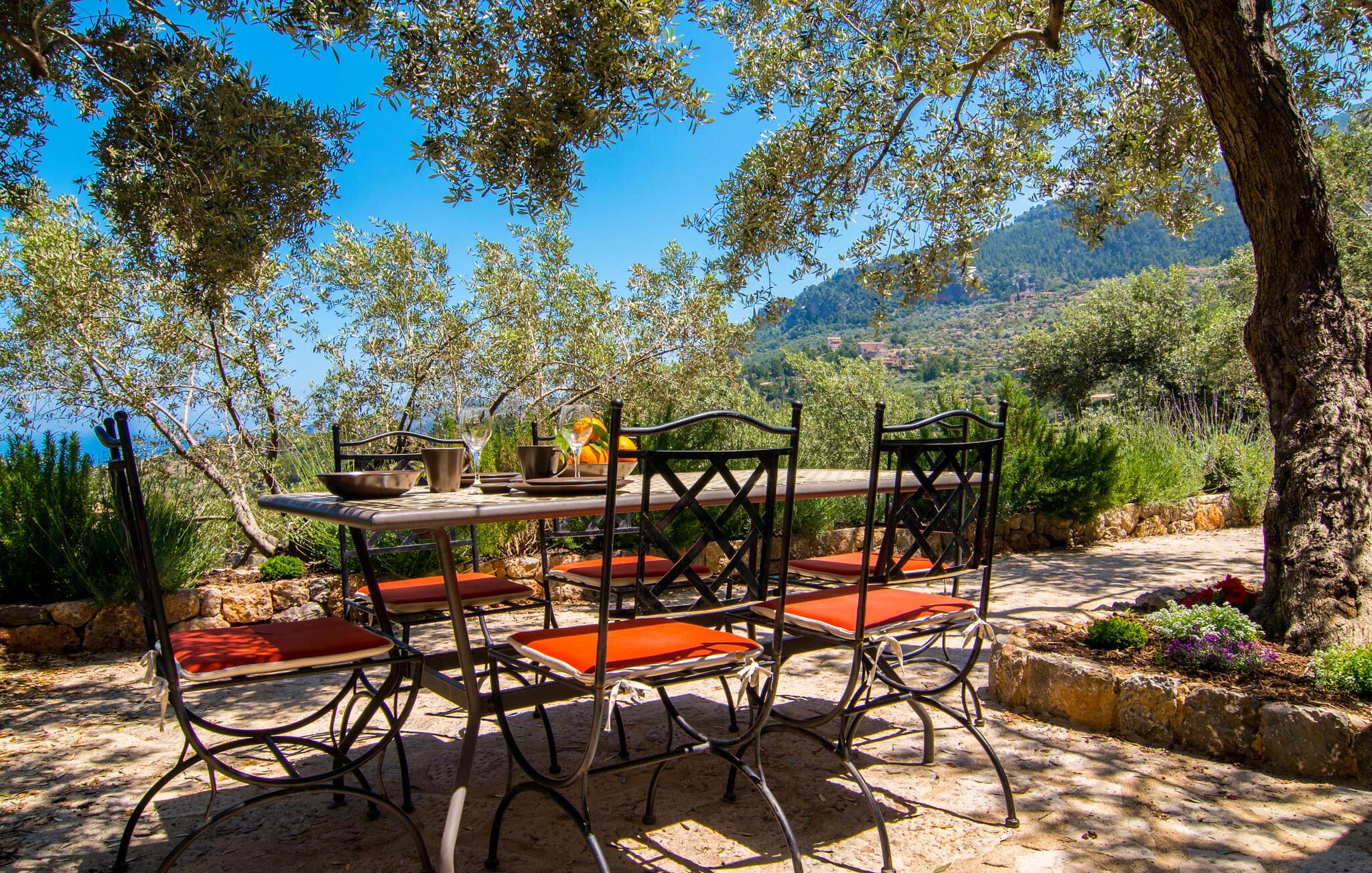 Villa "Maya" er den mest romantiske ejendom i vores portefølje. Dette lille feriehus ligger på en 1.000 m² stor grund midt i uberørt middelhavsnatur. Det tilbyder en sensationel udsigt over det omkringliggende landskab og Middelhavet. Intet står i vejen for en idyllisk ferie for to. Den lille ejendom, bygget i natursten, strækker sig over en etage og kan rumme to voksne og om nødvendigt en baby. Foran den er der en stor, skøn overdækket terrasse. På den ene side er den rektangulære pool, som er flisebelagt med smukke mosaikfliser og har en behagelig trinindgang på den ene side. Der er forskellige yderst indbydende siddepladser rundt om i huset. I kan nyde den unikke udsigt fra hvor som helst. Elegante havemøbler, rustikke oliventræer og anden middelhavsvegetation samt mange kærligt placerede detaljer gør dette sted særpræget og usædvanligt smukt. En frodig, naturlig træbestand omgiver villaen og gør det muligt at finde skønne steder med delvis skygge hist og her. I kan helt sikkert nyde en eksklusiv idyl her med en god bog eller en lækker drink om aftenen. Husets indretning sikrer frem for alt hygge og smagfuld komfort. De ekstremt komfortable sofaer i et kærligt designet, individuelt indrettet hjørne af den åbne stue/spisestue/køkken inviterer jer til at slappe af. Herfra har I en fantastisk udsigt over haven. Samtidig er fjernsynet også bekvemt placeret her. Måltider kan indtages ved det rustikke spisebord. Hvis I beslutter jer for andet, kan I nyde det udenfor, når vejret er godt. Det lille, delvist murede køkken er lyst og rummeligt og indeholder køleskab, ovn, komfur, mikroovn med mere. Et fjernsyn er også tilgængeligt; Den modtager dog kun spanske transmissioner, da satellitforbindelser ikke er tilladt i dette naturreservat. Subtile farver og massive loftsbjælker afrunder harmonisk den hyggelige atmosfære i denne hovedstue. Soveværelset byder gæsten velkommen i en hjemlig, men elegant atmosfære. Varme elementer som lyset og træet i loftet, vinduer og møbler skaber en behagelig atmosfære. Også unik herfra: den fantastiske udsigt fra vinduet. Dagslysebadeværelset er ligeledes moderne og funktionelt og indrettet i muntre farver. Kunstnerbyen Deiá ligger i umiddelbar nærhed. Valldemossa med sine barer, restauranter og indkøbsmuligheder ligger kun omkring 8 km væk, mens stranden Cala Deiá, som er en af de smukkeste bugter på hele Mallorcas vestkyst, ligger omkring 5 km væk. Da huset ligger på en vej, der forbinder begge byer (Deiá og Valldemossa), kan alt nås hurtigt. Vejen er genkendelig afhængig af vindretningen. Ikke desto mindre er det stadig en af vores mest eftertragtede to-personers ejendomme. Villa "Maya" er en af de bedste små ejendomme: der er kun få ejendomme, der kan findes på denne usædvanligt smukke kyststrækning på Mallorca. Af denne grund modtager huset vores enestående anbefaling. Villaen "Maya" er en meget romantisk drømmevilla til to personer, hvis beliggenhed byder på et højt niveau af privatliv og samtidig opfylder eksklusive feriekrav. Det ligger i den nordvestlige ende af den lille kunstnerby Deiá, med udsigt over byen. Fra en høj position kan I gøre jeres daglige indkøb.
