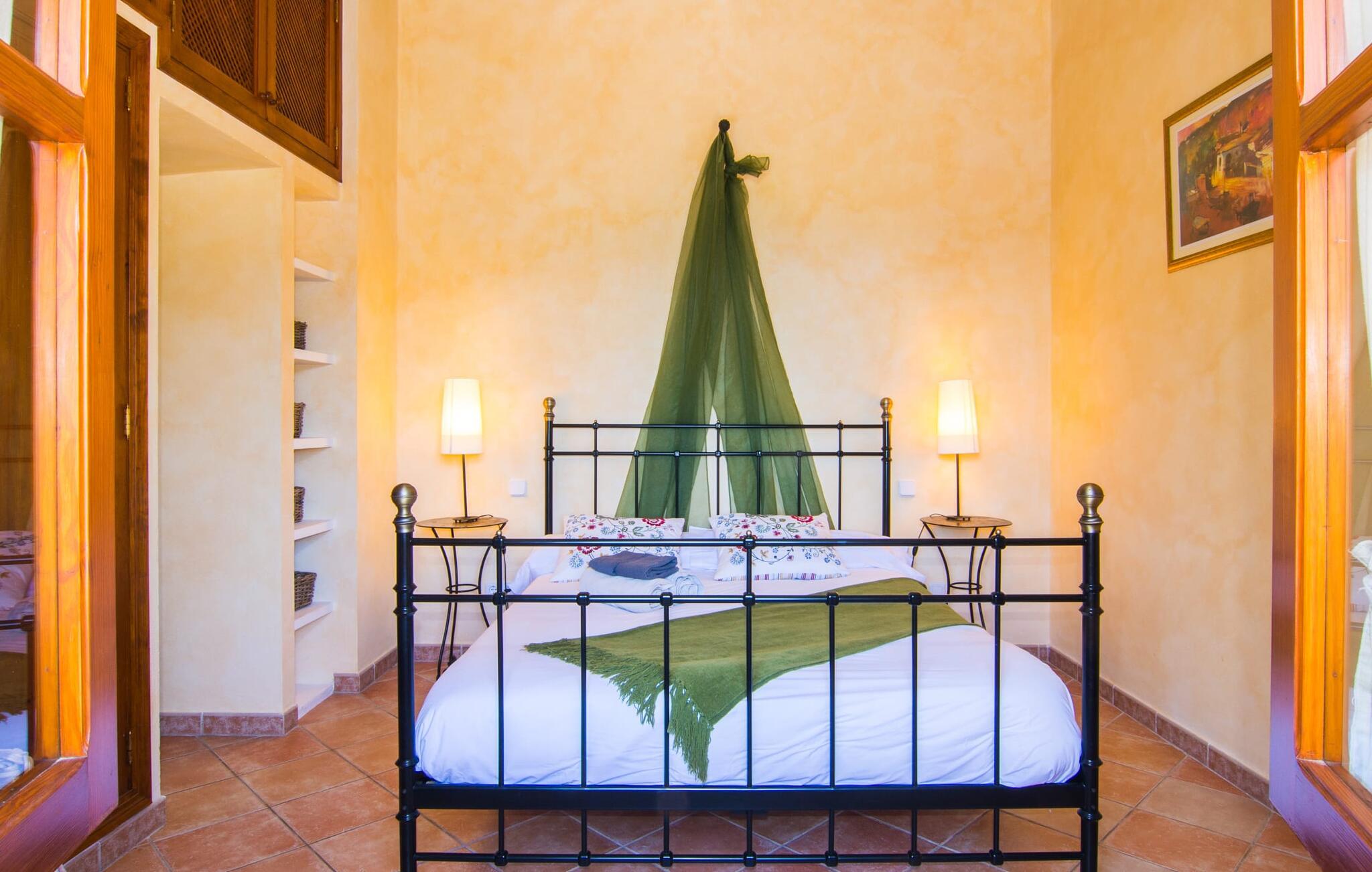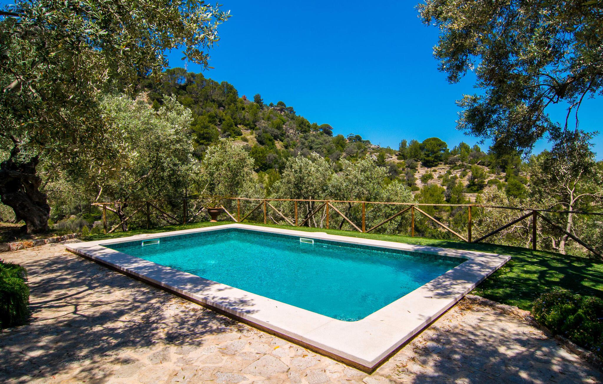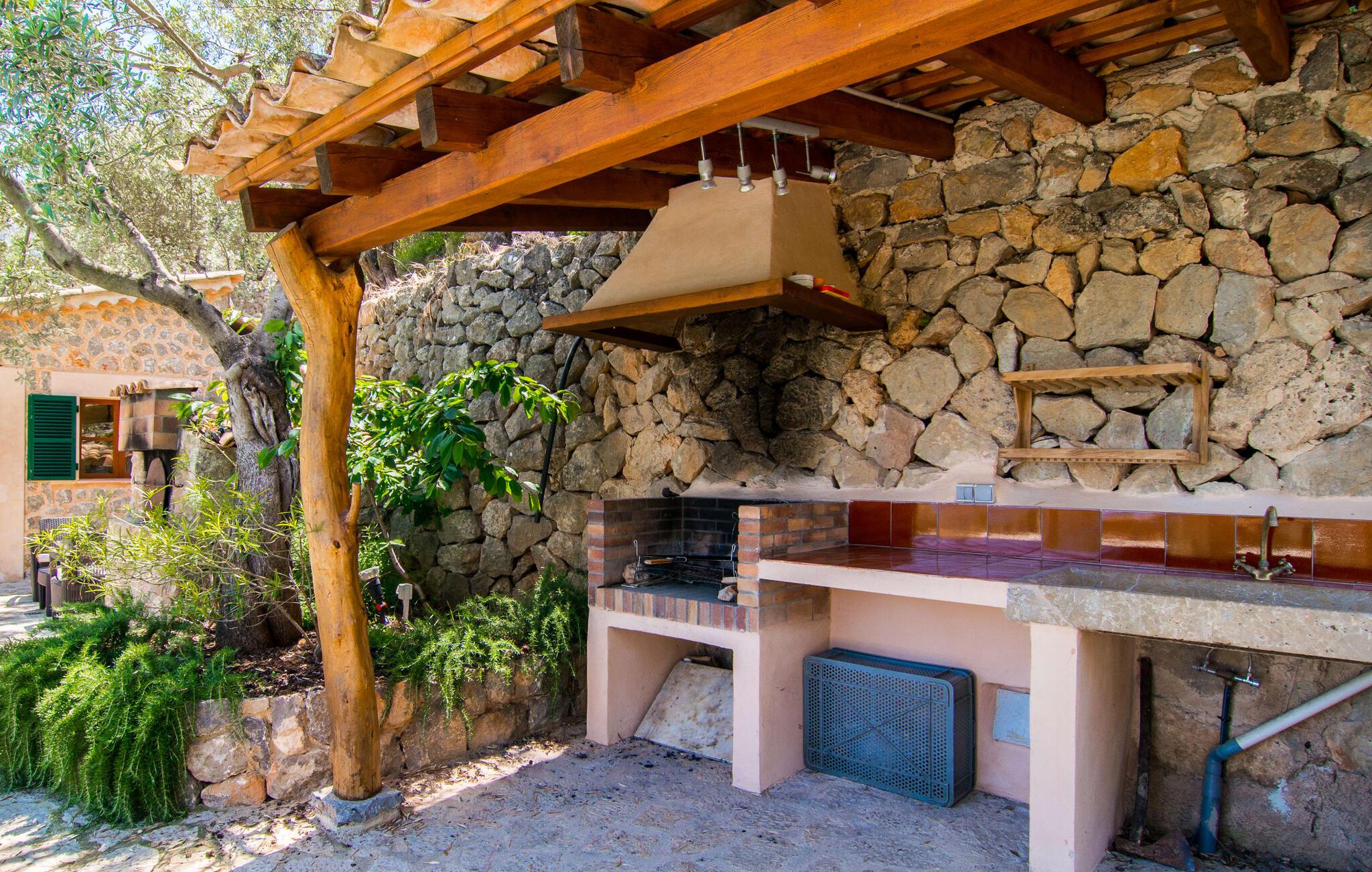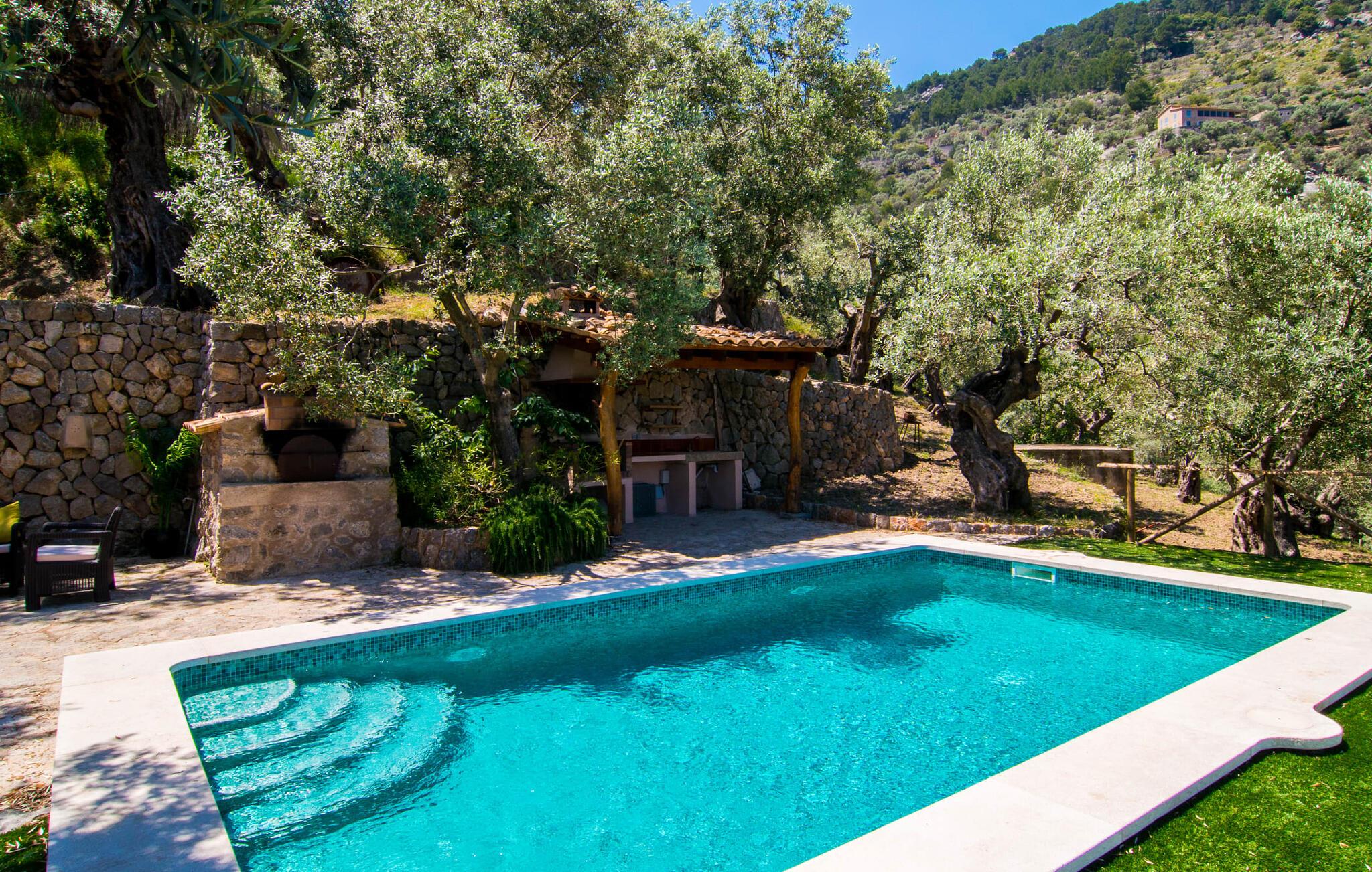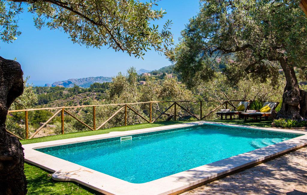 Villa "Maya" er den mest romantiske ejendom i vores portefølje. Dette lille feriehus ligger på en 1.000 m² stor grund midt i uberørt middelhavsnatur. Det tilbyder en sensationel udsigt over det omkringliggende landskab og Middelhavet. Intet står i vejen for en idyllisk ferie for to. Den lille ejendom, bygget i natursten, strækker sig over en etage og kan rumme to voksne og om nødvendigt en baby. Foran den er der en stor, skøn overdækket terrasse. På den ene side er den rektangulære pool, som er flisebelagt med smukke mosaikfliser og har en behagelig trinindgang på den ene side. Der er forskellige yderst indbydende siddepladser rundt om i huset. I kan nyde den unikke udsigt fra hvor som helst. Elegante havemøbler, rustikke oliventræer og anden middelhavsvegetation samt mange kærligt placerede detaljer gør dette sted særpræget og usædvanligt smukt. En frodig, naturlig træbestand omgiver villaen og gør det muligt at finde skønne steder med delvis skygge hist og her. I kan helt sikkert nyde en eksklusiv idyl her med en god bog eller en lækker drink om aftenen. Husets indretning sikrer frem for alt hygge og smagfuld komfort. De ekstremt komfortable sofaer i et kærligt designet, individuelt indrettet hjørne af den åbne stue/spisestue/køkken inviterer jer til at slappe af. Herfra har I en fantastisk udsigt over haven. Samtidig er fjernsynet også bekvemt placeret her. Måltider kan indtages ved det rustikke spisebord. Hvis I beslutter jer for andet, kan I nyde det udenfor, når vejret er godt. Det lille, delvist murede køkken er lyst og rummeligt og indeholder køleskab, ovn, komfur, mikroovn med mere. Et fjernsyn er også tilgængeligt; Den modtager dog kun spanske transmissioner, da satellitforbindelser ikke er tilladt i dette naturreservat. Subtile farver og massive loftsbjælker afrunder harmonisk den hyggelige atmosfære i denne hovedstue. Soveværelset byder gæsten velkommen i en hjemlig, men elegant atmosfære. Varme elementer som lyset og træet i loftet, vinduer og møbler skaber en behagelig atmosfære. Også unik herfra: den fantastiske udsigt fra vinduet. Dagslysebadeværelset er ligeledes moderne og funktionelt og indrettet i muntre farver. Kunstnerbyen Deiá ligger i umiddelbar nærhed. Valldemossa med sine barer, restauranter og indkøbsmuligheder ligger kun omkring 8 km væk, mens stranden Cala Deiá, som er en af de smukkeste bugter på hele Mallorcas vestkyst, ligger omkring 5 km væk. Da huset ligger på en vej, der forbinder begge byer (Deiá og Valldemossa), kan alt nås hurtigt. Vejen er genkendelig afhængig af vindretningen. Ikke desto mindre er det stadig en af vores mest eftertragtede to-personers ejendomme. Villa "Maya" er en af de bedste små ejendomme: der er kun få ejendomme, der kan findes på denne usædvanligt smukke kyststrækning på Mallorca. Af denne grund modtager huset vores enestående anbefaling. Villaen "Maya" er en meget romantisk drømmevilla til to personer, hvis beliggenhed byder på et højt niveau af privatliv og samtidig opfylder eksklusive feriekrav. Det ligger i den nordvestlige ende af den lille kunstnerby Deiá, med udsigt over byen. Fra en høj position kan I gøre jeres daglige indkøb.