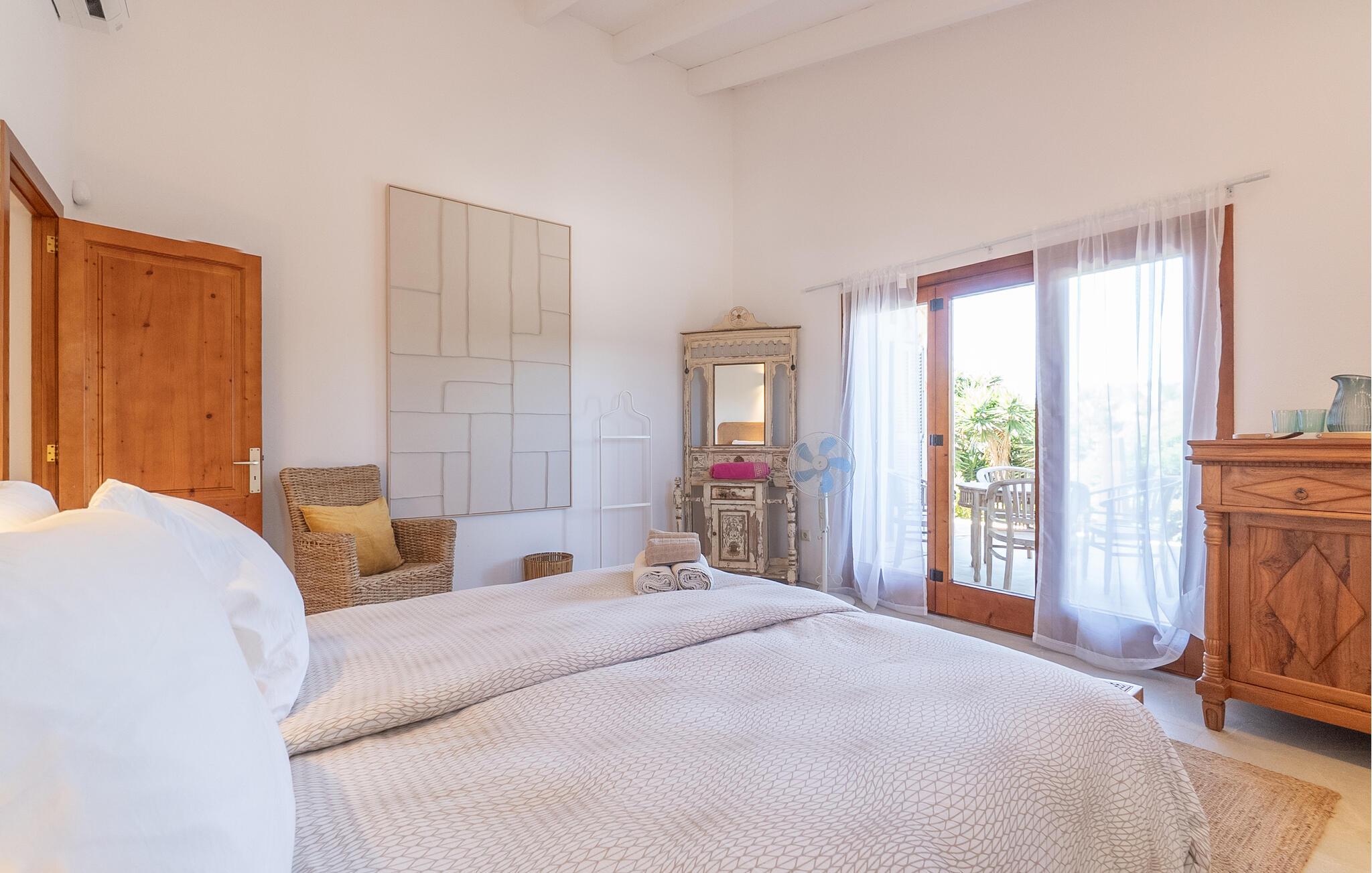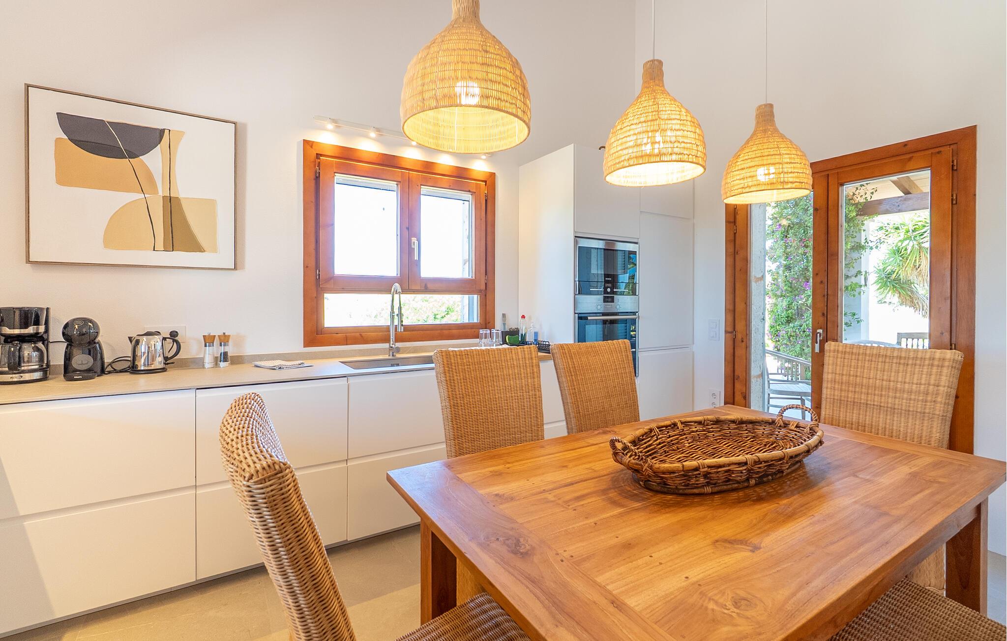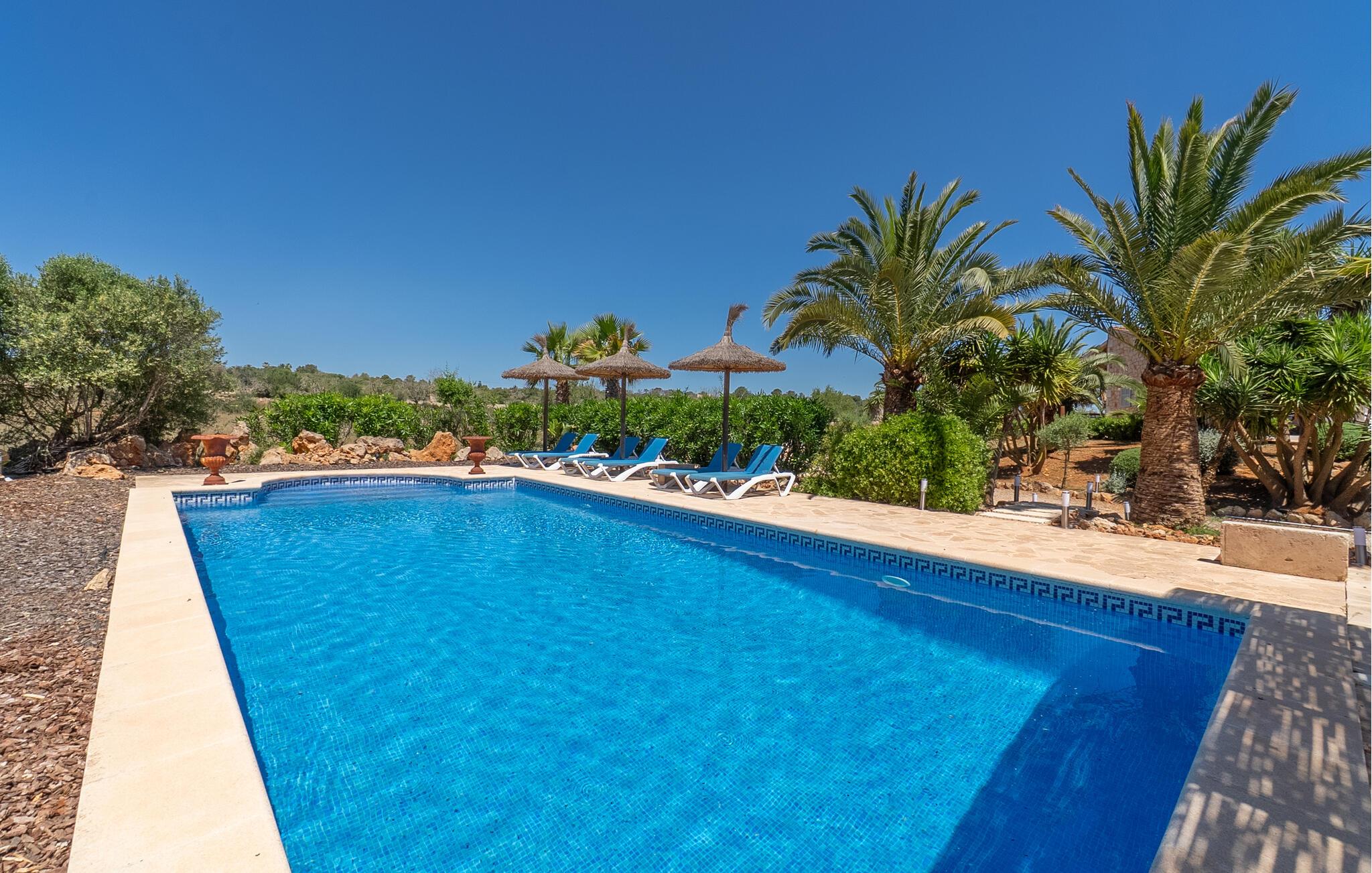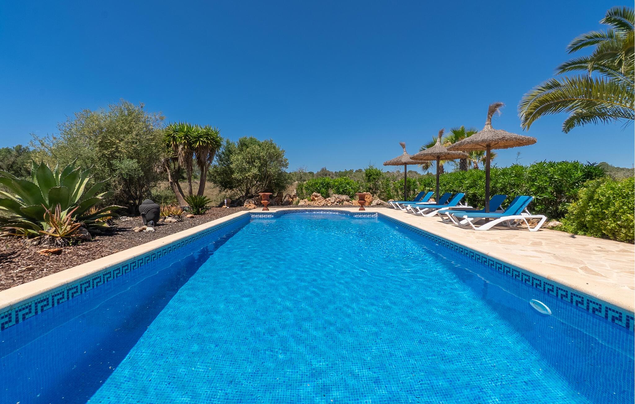 "Mi Vida" er en rigtig opdagelse. Det lyder næsten som ædle smykker, en ædelsten eller en perle – og denne utroligt smukke villa er en sand perle. Det er beliggende i en landbrugsregion, hvor der er tonsvis af mandel- og oliventræer. I kan høre de fritgående fårs klokker og andre naturlyde - men I bliver bestemt ikke forstyrret af nogen støj. Det er det perfekte sted at slappe af, en følelse I vil føle, så snart I når den bekvemme indkørsel til denne vidtstrakte ejendom. Kæmpe kaktusser og agaver samt palmer i forskellige størrelser ligger langs haven, som også byder på masser af siddepladser. Hvert soveværelse har adgang til en individuel terrasse, selvom den store veranda, der støder op til køkkenet og opholdsstuen, er et vidunderligt sted at bringe familien eller en gruppe venner sammen. Efter en dagstur kan I slentre langs den smalle stensti, der fører jer gennem middelhavshaven til poolen. At køle af i vandet efter en cykeltur med de cykler, der er til rådighed i villaen, er lige noget for jer. I kan også døse eller drømme på en liggestol i denne utrolige atmosfære. Der tilbydes også et fælles spil bordtennis. Hvad med en grilleftermiddag ved poolen eller på en af terrasserne? Nyd den varme aften og den klare nattehimmel i timevis i det afslappede loungeområde, langt væk fra enhver lysforurening, måske ledsaget af et glas lokal rødvin - jeres ophold på "Mi Vida" tilbyder jer alt dette. I ved ikke, hvor I skal starte! Denne villa blev bygget i 2006 og er dekoreret med traditionelle brosten på ydersiden og har adskillige gulv-til-loft-vinduer. Det byder på utrolig smukt interiør i landlig stil, der passer smukt sammen. Komfortable sofaer er kombineret med kurvemøbler i den store åben-plan stue med integreret køkken. Det åbne design af køkkenområdet er L-formet, men køkkenøen strækker sig ind i rummet og giver dermed en visuel adskillelse. Skinnende hvide møbler og upåklagelig teknisk komfort kombineres kærligt med et rustikt spisebord i træ og komfortable højryggede kurvestole. De lyse flisebelagte overflader overalt, væggenes lyse hvide og lejlighedsvise, men slående dekorationsgenstande skaber en afslappet atmosfære, en ægte æstetisk fornøjelse, der med garanti vil sætte et smil på læben. Pejsen giver behagelig varme, især i de køligere måneder. Dobbeltværelserne har senge, der er mindst 1,60 m brede Et strejf af nostalgi, kombineret med shabby chic og masser af plads - I vil føle, at I er i Abrahams skød. To badeværelser med brusekabine, specialdesignet og imponerende små detaljer fuldender dette inspirerende hjem. Hvis I ønsker at opleve den milde baleariske vinter, kan vi tilbyde jer fantastiske priser med alt inklusive langtidsophold. Den rolige natur i denne kystregion i den sydøstlige del af øen vil helt sikkert forbedre jeres fred og afslapning. “Mi Vida” ligger i de landlige omgivelser i Santanyí, et af øens smukkeste feriesteder med gyldenbrune brostenshuse. Oplev den afslappede ro på de mange små pladser i regionens små byer, hvor I møder flere lokale end turister. Markederne, for eksempel om søndagen i Felanitx, er meget livlige og livlige. Der kan I købe tøj og smagfulde souvenirs samt mad. Saltfladerne i Ses Salines, naturparken Mondragó, og ikke at forglemme de smukke bugter med krystalklart vand og fint sand, der skinner næsten gyldent i lyset, fuldender det lokale tilbud. "Mi Vida" - "Mit liv" - livet her er virkelig smukt, synes I ikke? I vil med garanti blive forelsket i landstedet "Mi Vida", omgivet af en tilsyneladende fortryllet have i virkelig smukke omgivelser med fænomenal panoramaudsigt. Ejendommen ligger lige sydvest for Santanyí, hvor I kan gøre jeres indkøb. Hvorfor ikke besøge de ugentlige markeder i de omkringliggende små byer eller tilbringe en dag ved havet. Cala Santanyi byder på en fjordlignende bugt, der er ideel til svømning og har krystalklart vand.