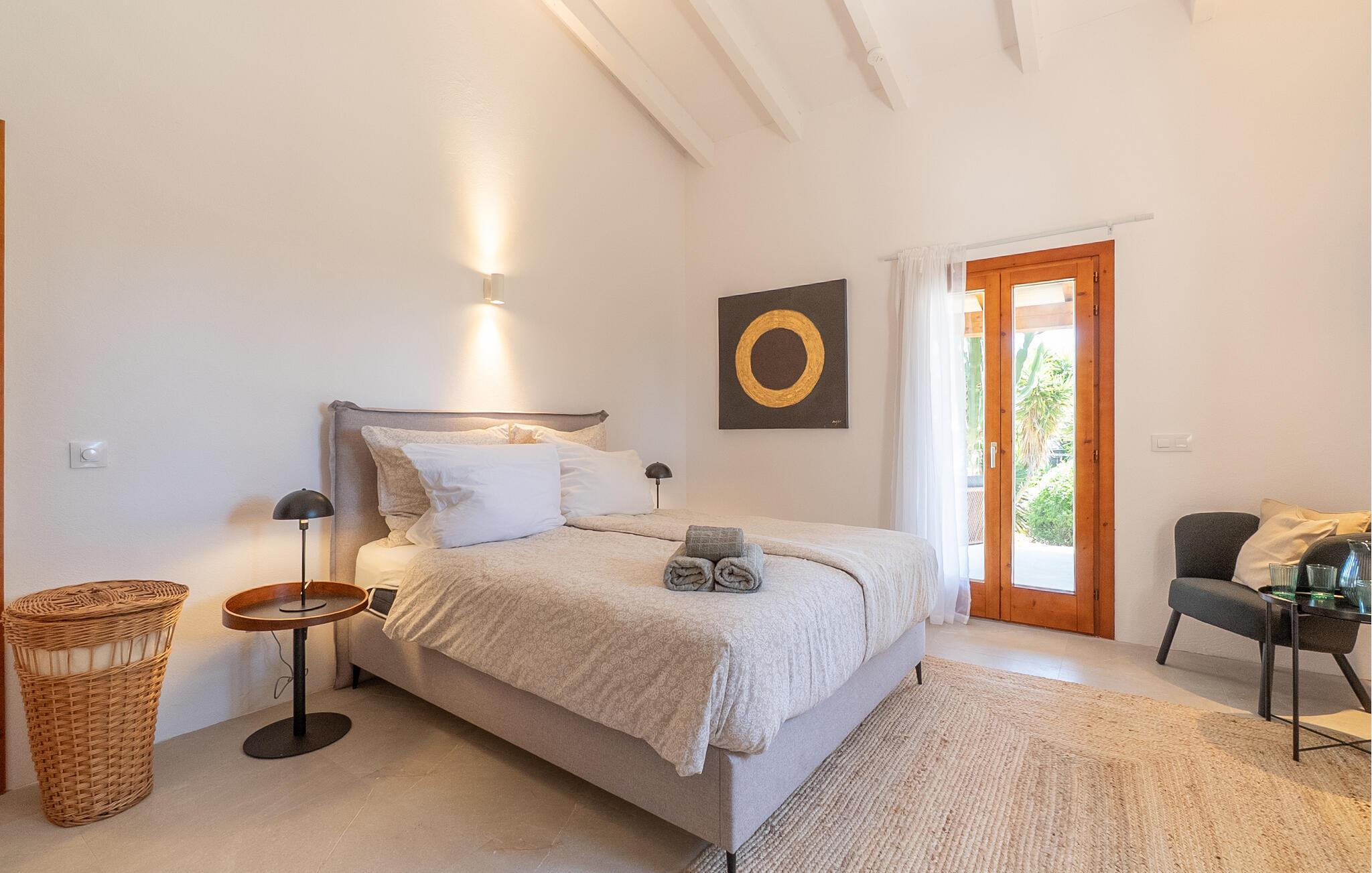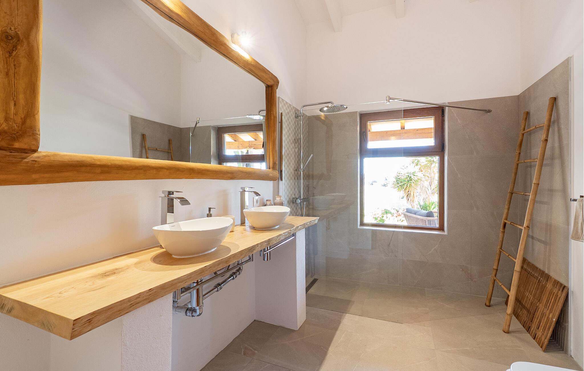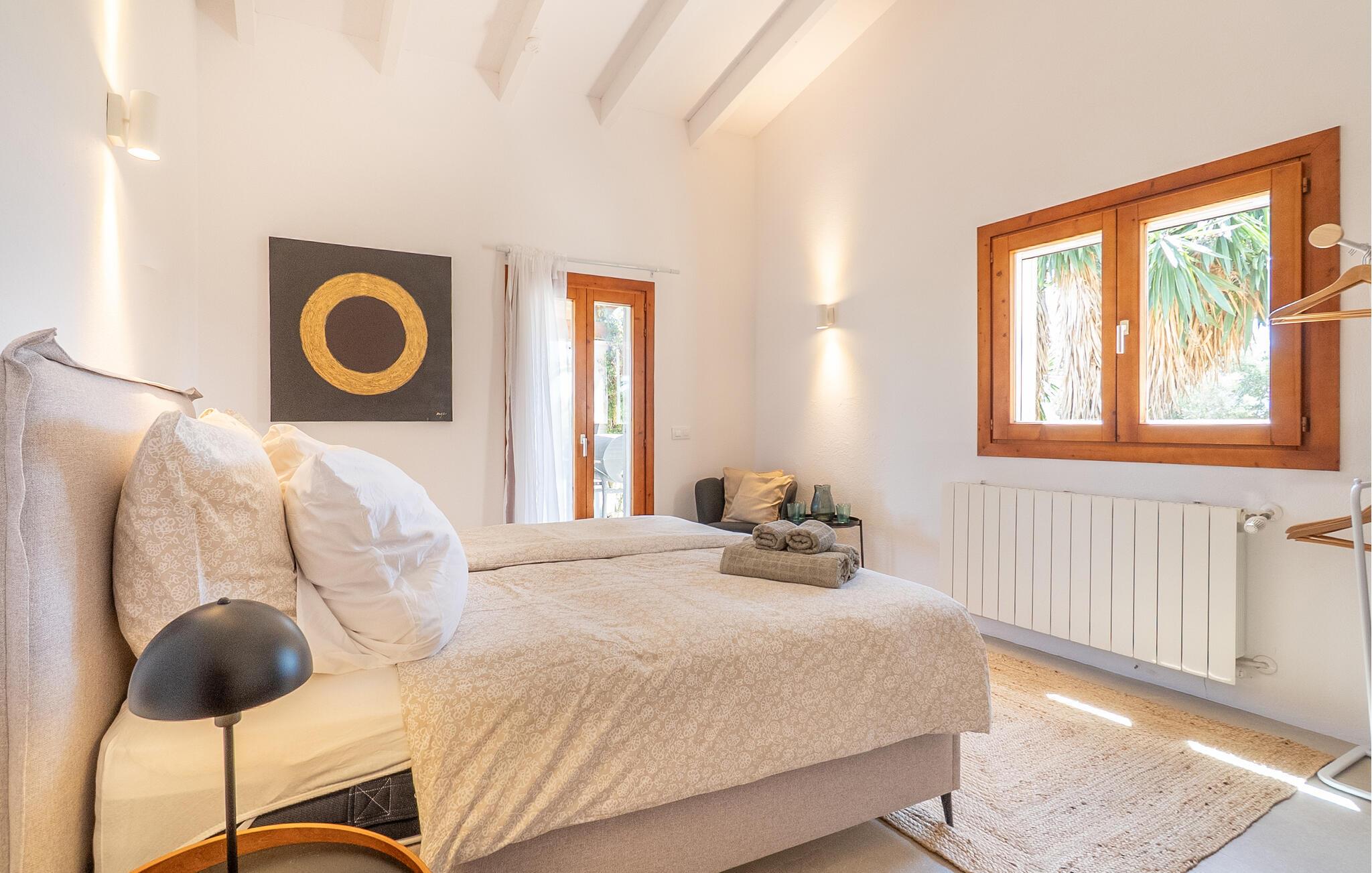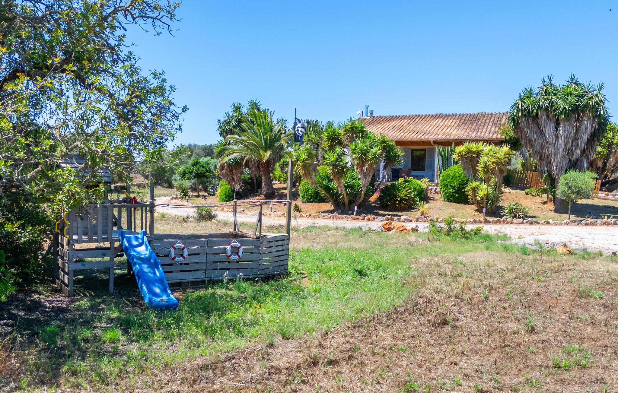"Mi Vida" er en rigtig opdagelse. Det lyder næsten som ædle smykker, en ædelsten eller en perle – og denne utroligt smukke villa er en sand perle. Det er beliggende i en landbrugsregion, hvor der er tonsvis af mandel- og oliventræer. I kan høre de fritgående fårs klokker og andre naturlyde - men I bliver bestemt ikke forstyrret af nogen støj. Det er det perfekte sted at slappe af, en følelse I vil føle, så snart I når den bekvemme indkørsel til denne vidtstrakte ejendom. Kæmpe kaktusser og agaver samt palmer i forskellige størrelser ligger langs haven, som også byder på masser af siddepladser. Hvert soveværelse har adgang til en individuel terrasse, selvom den store veranda, der støder op til køkkenet og opholdsstuen, er et vidunderligt sted at bringe familien eller en gruppe venner sammen. Efter en dagstur kan I slentre langs den smalle stensti, der fører jer gennem middelhavshaven til poolen. At køle af i vandet efter en cykeltur med de cykler, der er til rådighed i villaen, er lige noget for jer. I kan også døse eller drømme på en liggestol i denne utrolige atmosfære. Der tilbydes også et fælles spil bordtennis. Hvad med en grilleftermiddag ved poolen eller på en af terrasserne? Nyd den varme aften og den klare nattehimmel i timevis i det afslappede loungeområde, langt væk fra enhver lysforurening, måske ledsaget af et glas lokal rødvin - jeres ophold på "Mi Vida" tilbyder jer alt dette. I ved ikke, hvor I skal starte! Denne villa blev bygget i 2006 og er dekoreret med traditionelle brosten på ydersiden og har adskillige gulv-til-loft-vinduer. Det byder på utrolig smukt interiør i landlig stil, der passer smukt sammen. Komfortable sofaer er kombineret med kurvemøbler i den store åben-plan stue med integreret køkken. Det åbne design af køkkenområdet er L-formet, men køkkenøen strækker sig ind i rummet og giver dermed en visuel adskillelse. Skinnende hvide møbler og upåklagelig teknisk komfort kombineres kærligt med et rustikt spisebord i træ og komfortable højryggede kurvestole. De lyse flisebelagte overflader overalt, væggenes lyse hvide og lejlighedsvise, men slående dekorationsgenstande skaber en afslappet atmosfære, en ægte æstetisk fornøjelse, der med garanti vil sætte et smil på læben. Pejsen giver behagelig varme, især i de køligere måneder. Dobbeltværelserne har senge, der er mindst 1,60 m brede Et strejf af nostalgi, kombineret med shabby chic og masser af plads - I vil føle, at I er i Abrahams skød. To badeværelser med brusekabine, specialdesignet og imponerende små detaljer fuldender dette inspirerende hjem. Hvis I ønsker at opleve den milde baleariske vinter, kan vi tilbyde jer fantastiske priser med alt inklusive langtidsophold. Den rolige natur i denne kystregion i den sydøstlige del af øen vil helt sikkert forbedre jeres fred og afslapning. “Mi Vida” ligger i de landlige omgivelser i Santanyí, et af øens smukkeste feriesteder med gyldenbrune brostenshuse. Oplev den afslappede ro på de mange små pladser i regionens små byer, hvor I møder flere lokale end turister. Markederne, for eksempel om søndagen i Felanitx, er meget livlige og livlige. Der kan I købe tøj og smagfulde souvenirs samt mad. Saltfladerne i Ses Salines, naturparken Mondragó, og ikke at forglemme de smukke bugter med krystalklart vand og fint sand, der skinner næsten gyldent i lyset, fuldender det lokale tilbud. "Mi Vida" - "Mit liv" - livet her er virkelig smukt, synes I ikke? I vil med garanti blive forelsket i landstedet "Mi Vida", omgivet af en tilsyneladende fortryllet have i virkelig smukke omgivelser med fænomenal panoramaudsigt. Ejendommen ligger lige sydvest for Santanyí, hvor I kan gøre jeres indkøb. Hvorfor ikke besøge de ugentlige markeder i de omkringliggende små byer eller tilbringe en dag ved havet. Cala Santanyi byder på en fjordlignende bugt, der er ideel til svømning og har krystalklart vand.