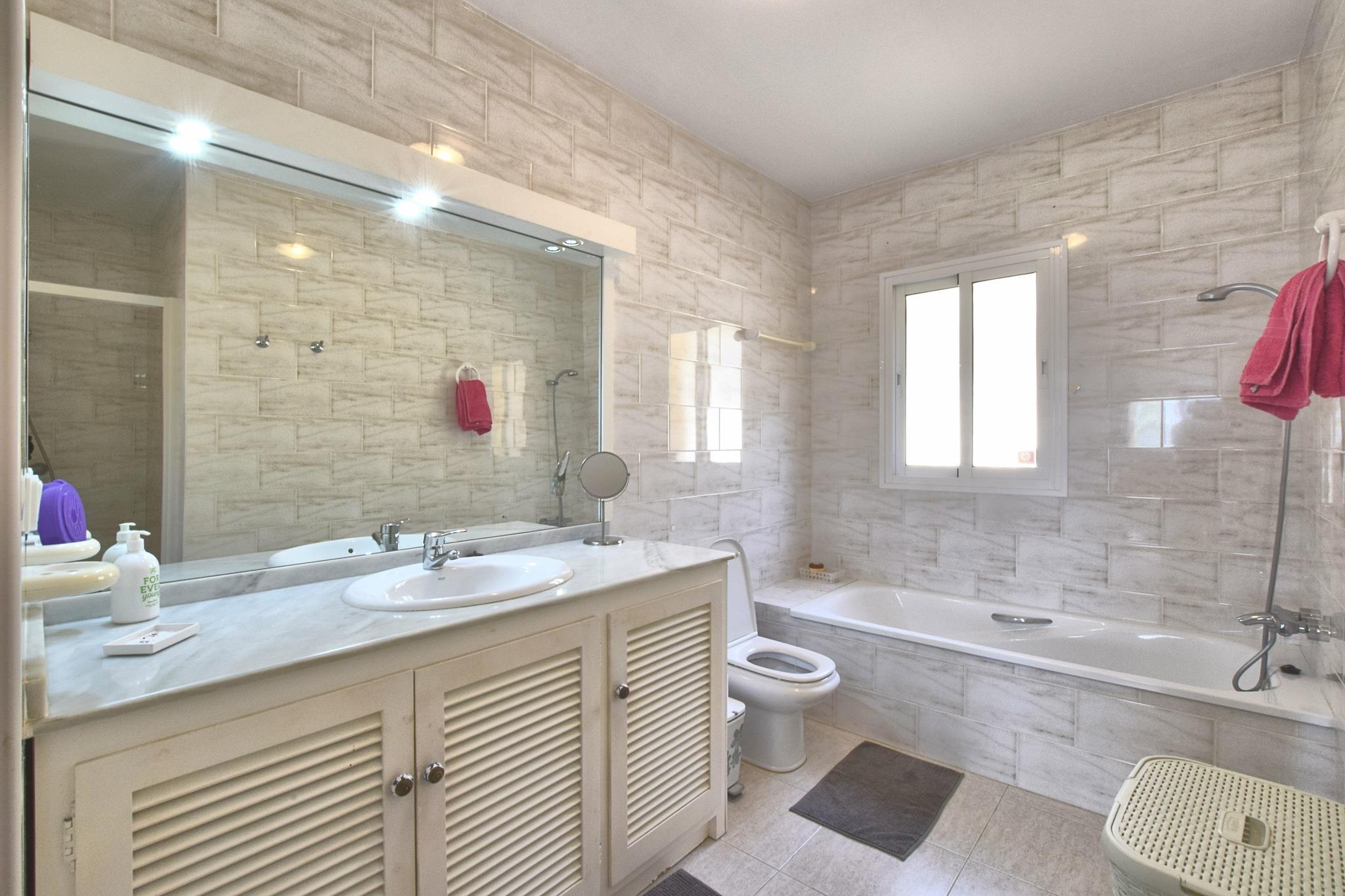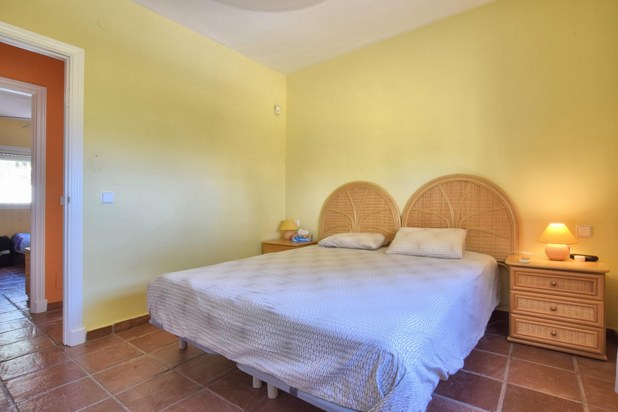 Charmerende kystvilla Denne villa i andalusisk stil i Mijas Costa tilbyder en privat 7x3 m pool og komfortabel indkvartering for familier eller grupper. Indenfor finder du et fuldt udstyret åbent køkken med moderne apparater, en stue/spisestue med pejs, aircondition og et tv med internationale kanaler. Tre soveværelser tilbyder afslappende sovemuligheder, inklusive en køjeseng til børn, og to badeværelser sikrer bekvemmelighed. En overdækket terrasse og en indhegnet have med liggestole og spisemøbler skaber indbydende rum til udendørs afslapning. Aktiviteter og nærliggende attraktioner Villaen ligger kun 1,5 km fra stranden og er ideel til at nyde sol, sand og havudsigt. Golfentusiaster kan nå Miraflores Golf på 400 m, mens butikker, supermarkeder og restauranter ligger inden for 900 m. La Cala de Mijas ligger 4 km væk, perfekt til naturskønne gåture, og kystlinjen byder på muligheder for vandsport eller afslappende gåture. Kæledyr er ikke tilladt. Bekvemmelighed og tilgængelighed Spisemuligheder, lokale butikker og supermarkeder ligger alle inden for gåafstand. Villaen tilbyder parkering i nærheden og nem adgang til motorvejen, hvilket gør Malaga Lufthavn kun 38 km væk. Indenfor er der Wi-Fi, vaskemaskine og solopvarmet varmt vand.