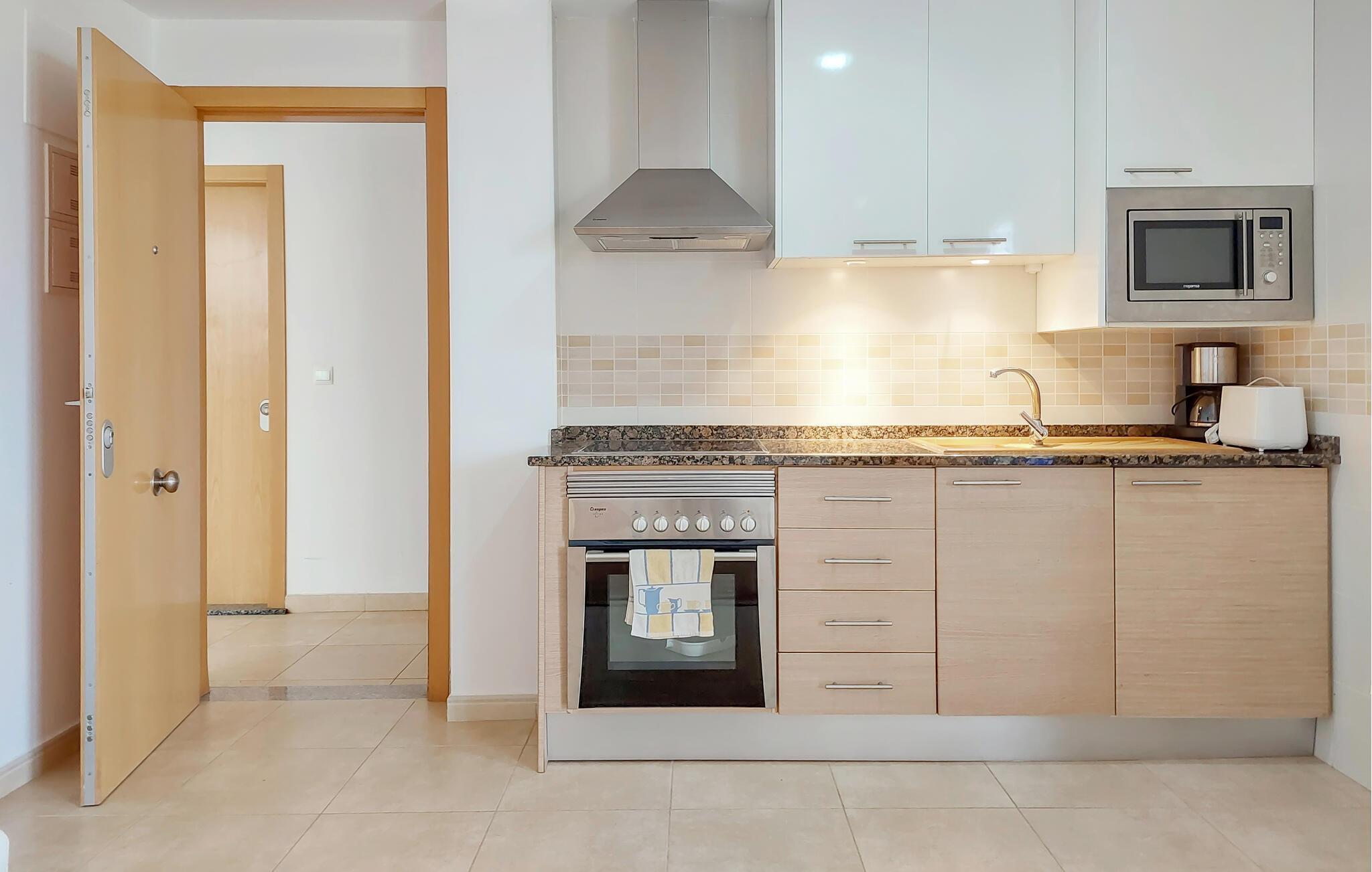 Er I på udkig efter en lækker lejlighed med en fremragende beliggenhed til en badeferie for to? Så er denne bolig lige noget for jer! Lejligheden er fin og gennemtænkt, og i det åbne køkken-alrum kan I give jer god tid til at kræse om jeres livretter, inden I nyder et romantisk måltid på terrassen med havudsigt. På terrassen bør I også tillade jer selv en siesta i middagsheden med en kold drink, inden I trasker mod havet.