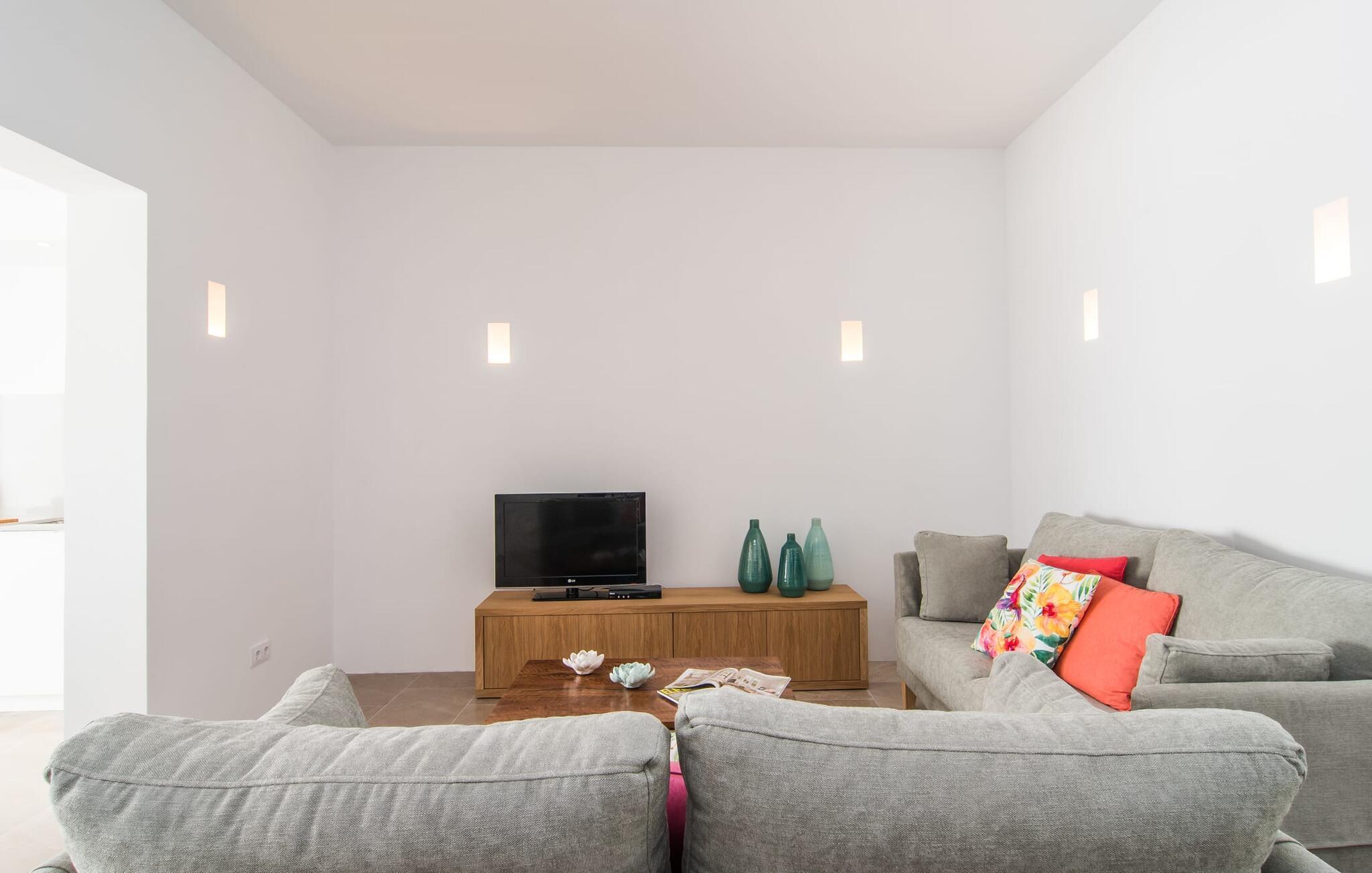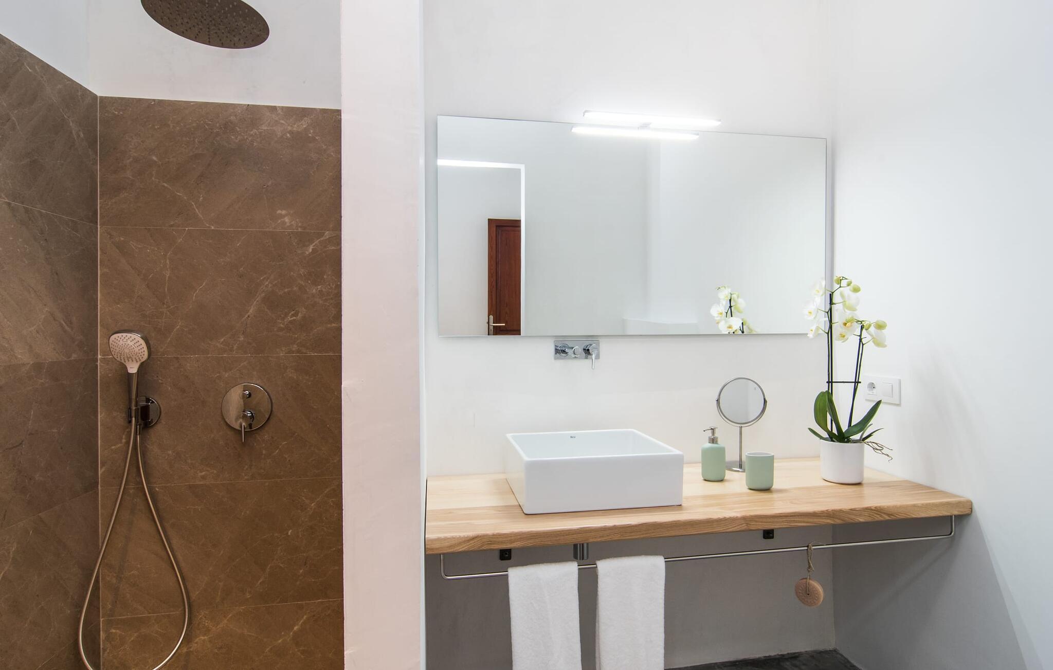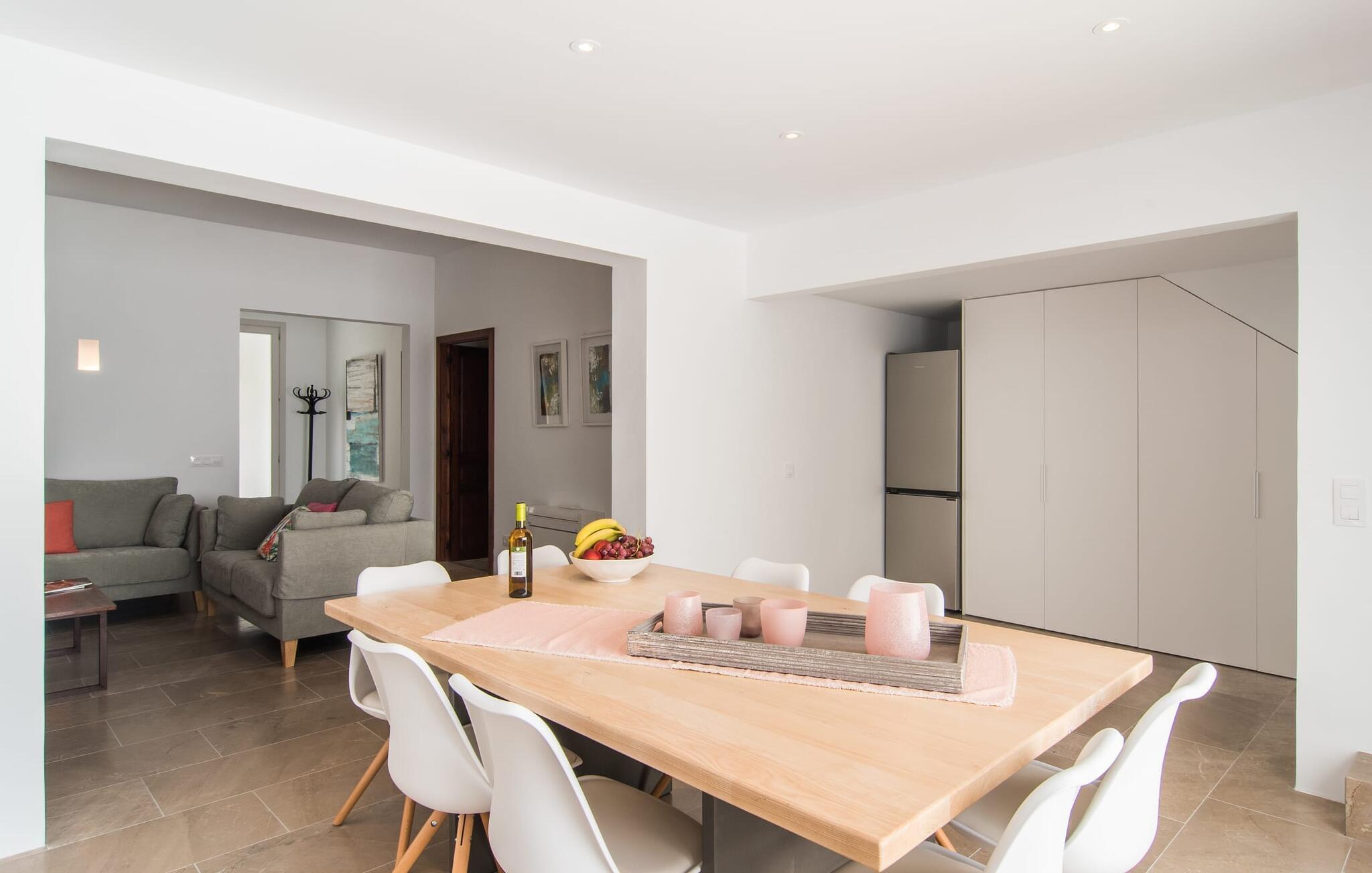 Enhver, der kan lide at komme rundt til fods, har alle de nødvendige faciliteter i nærheden og nyder at slentre gennem små byer, er heldige med dette rækkehus, især da det ligger midt i Artà - et gammelt, fremadstormende feriested, der stadig har små butikker og et livligt liv har et ugentligt marked og fremragende restauranter. Bilen kan parkeres på gaden og er derfor altid klar til den korte køretur til stranden. Selvom du er omgivet af naboer, tilbyder den hvide, fuldstændig renoverede ejendom "Na Valenta" dig en masse privatliv: den smukke lille gårdhave med den højkvalitets minipool, som sikrer, at du kan køle af i ny og næ, er beskyttet af høje mure. En moderne gasgrill er tilgængelig for at tilføje kød og fisk til den markedsfriske salat; Der er ingen nemmere måde at lave noget på, når du ikke har lyst til at gå ud. Den rummelige altanterrasse har en ekspansiv markise, så du kan få uhindret udsyn til handlingen. Dette er et Fincallorca feriehus. Og enhver, der kan lide enkelhed, elsker minimalistisk design og ønsker et behageligt køligt rum, især i varmt vejr, vil helt sikkert føle sig godt tilpas inden for "Na Valentas vægge". De to etager formidler et indtryk af sommerfriskhed og byder på møbler af høj kvalitet og værelser med aircondition. Du kan også inkludere og tage en eller to andre personer med. Skub glasdøren op til terrassen i gården og forvandl den moderne cocina med mikroovn og opvaskemaskine til et udekøkken. En frisk brise blæser også fra det hyggelige sofaområde til indgangspartiet, som er muliggjort af de ekstra døråbninger. To soveværelser med dobbeltsenge (separate madrasser) deler badeværelset i stueetagen, mens et walk-in-closet og rummeligt bruseniche giver ekstra komfort. Trappen fører op til yderligere to værelser, hver med eget badeværelse og udgang til altan. Det åbne vaskerum gør disse rum ideelle som enkeltværelser. Dette totalrenoverede rækkehus med minimalistisk design, pool og balkonterrasse ligger i centrum af dette populære område i Artà, hvor Golgata ligger. Et ugentligt marked, et supermarked og et indkøbscenter samt restauranter og charmerende caféer er (næsten) lige uden for døren. Dit strandparadis på østkysten ligger kun 10 til 15 km væk, og Capdepera med sit slot og førsteklasses golfbane, Coves d'Artà og vandreområdet omkring Colònia de Sant Pere og Betlem er også kun en kort køretur væk . Bemærk venligst, at denne ejendom ikke accepterer ungdomsgrupper eller polterabender. En ungdomsgruppe på denne ejendom består af personer på 25 år eller derunder. Book ikke denne ejendom, hvis du er en ungdomsgruppe eller polterabend, da din reservation vil blive afvist, når den er booket, hvilket også kan være tilfældet ved ankomst til ejendommen eller under dit ophold, og du vil ikke modtage en refusion