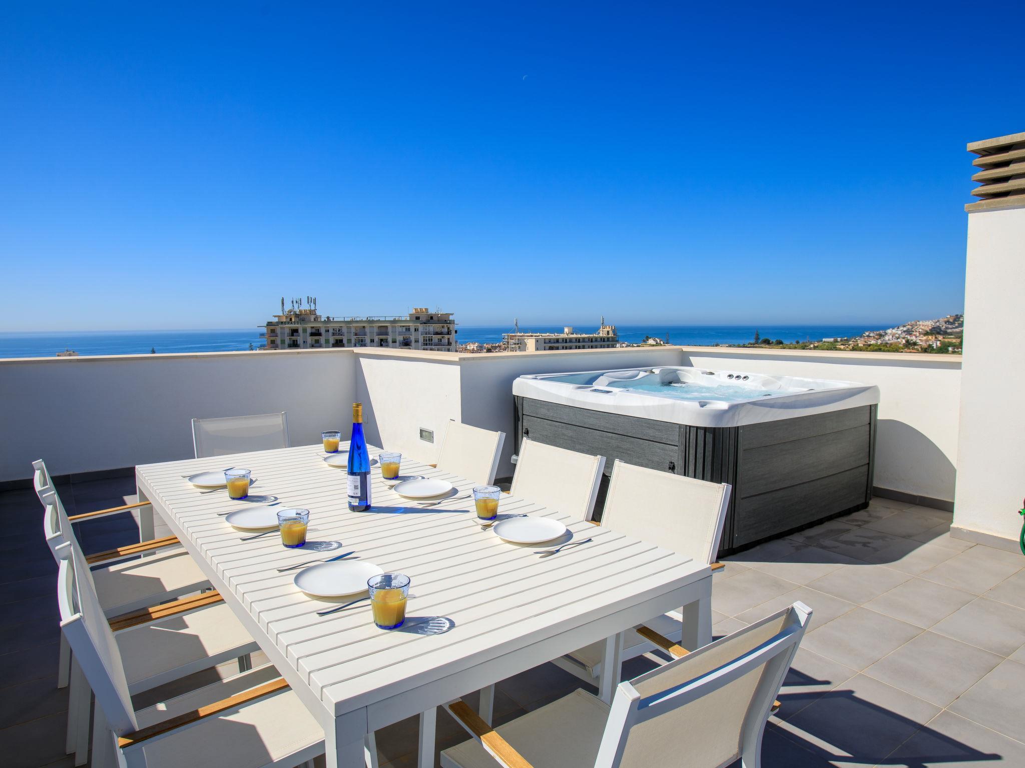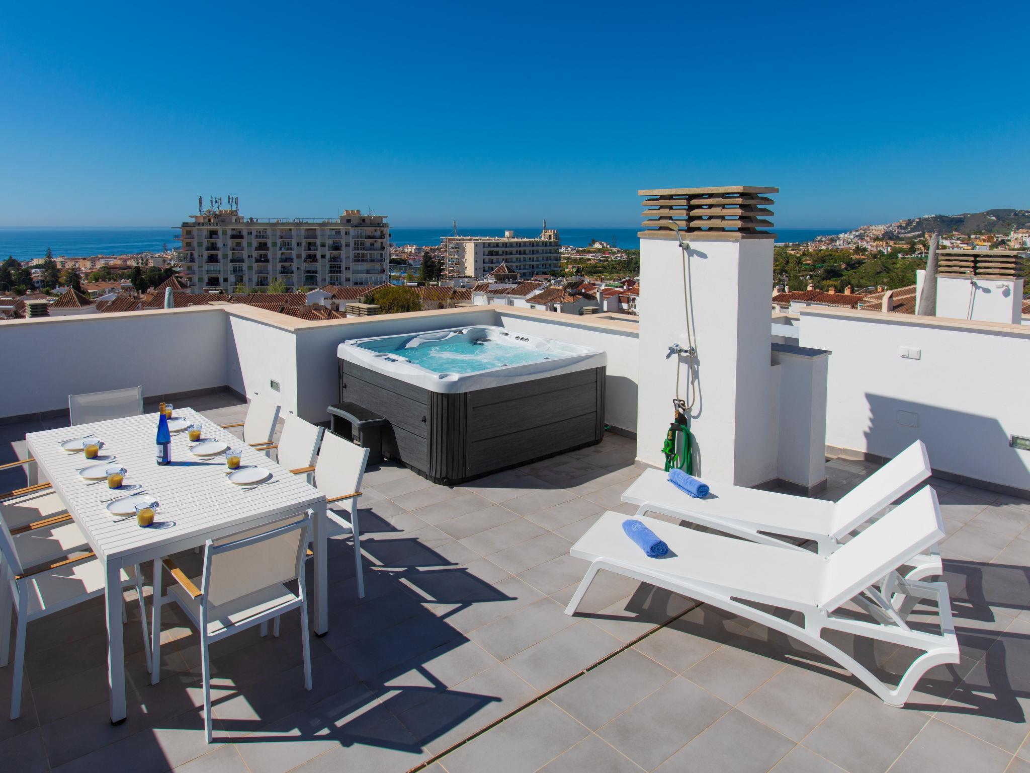 Modern, beautiful, comfortable terraced house "Skyhill", 3 storeys. In the resort Nerja, in a quiet position in the residential district, 1.5 km from the sea, 1.5 km from the beach. For shared use: swimming pool angular (10 x 5 m, depth 100 - 175 cm, seasonal availability: 01.Jan. - 31.Dec., extra 31 per day). Outdoor shower. Private: hot tub, arbour, terrace, garden furniture, barbecue. In the house: solarium. Supermarket 200 m, shopping centre 23 km, restaurant, pub garden, bus stop 200 m, railway station 52 km, sandy beach "Burriana", diving center 900 m. Sports harbour 17 km, marina 17 km, golf course (18 hole) 20 km. Nearby attractions: Frigiliana, La Herradura, Malaga, Competa, Maro, Cuevas de Maro. Well-known ski regions can easily be reached: Sierra Nevada. Hiking paths: Sierra Almijara, Sierra Tejeda. Please note: no lift. The owner does not accept any youth groups. Loading and unloading of baggage is possible at the holiday house.