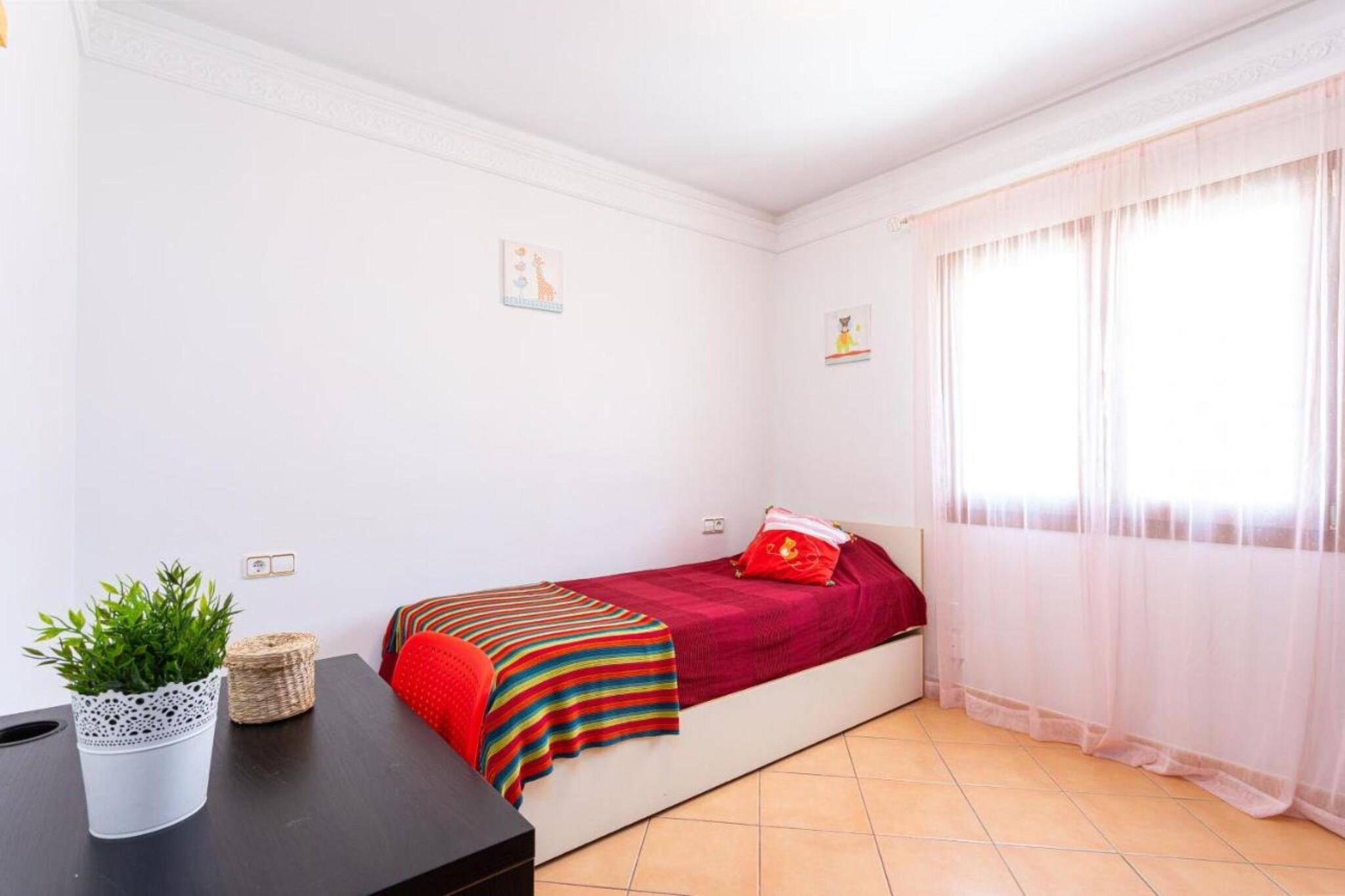 Stueetage: (køkken-alrum(brødrister, emhætte, kaffemaskine, mikrobølgeovn, køle-fryseskab), Stue/soveværelse(enkeltsovesofa, dobbeltsovesofa, Fjernsyn, spisebord), soveværelse(halvandenmandsseng, Fjernsyn), soveværelse(enkelthøjseng), soveværelse(enkelthøjseng), badeværelse(badekar eller bruser, toilet, vaskemaskine), balkon, klimaanlæg) parkering