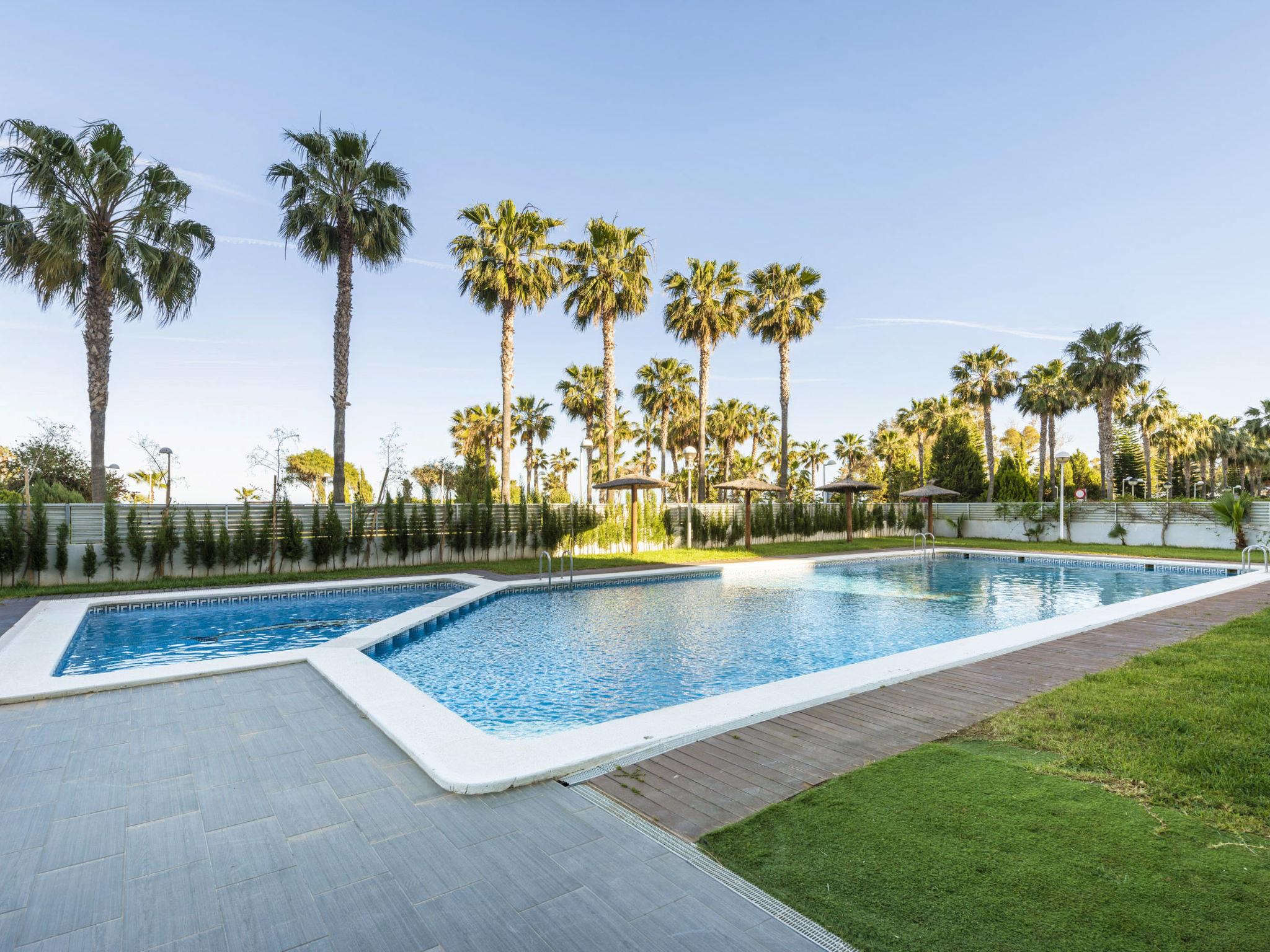 Marina d'Or: Comfortable residence "Mondrian". In a sunny position, 20 m from the sea, 20 m from the beach, road to cross. For shared use: garden, swimming pool angular (20 x 10 m, depth 70 - 270 cm, seasonal availability: 15.May. - 15.Sep. pool opening hours: 10:00-18:00 and 10:00-22:00). WC in the pool area, children's playground. In the house: lift. Roofed, parking at the house. Parking space or garage only for small to medium-sized cars. Grocery 100 m, supermarket 500 m, restaurant, bar, café, bus stop 100 m, railway station 2.8 km. Neighbourhood highly sensitive to noise. Quietness and good behaviour expected.