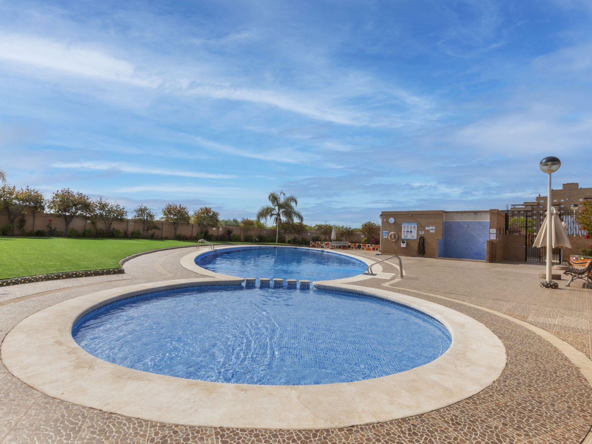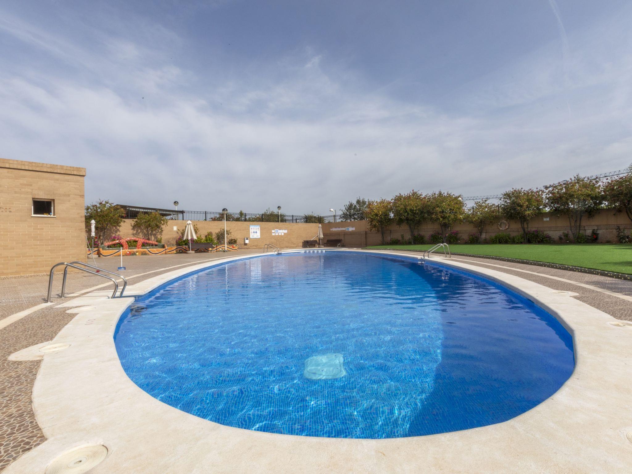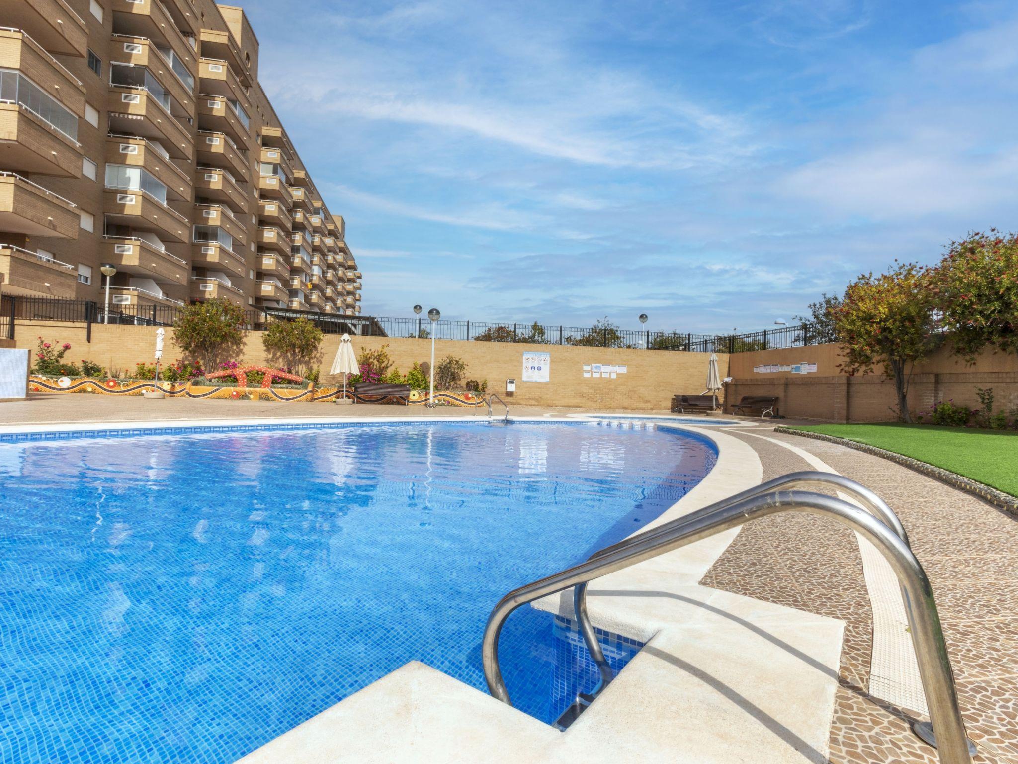 Marina D'or: Comfortable apartment block "Jardines del Mar III". On the outskirts, 3.5 km from the centre of Oropesa del Mar, in the district Marina D´or, in a busy, sunny position, 300 m from the sea, 300 m from the beach, on a main road. For shared use: property, garden, swimming pool round (20 x 10 m, depth 70 - 270 cm, seasonal availability: 01.Jun. - 15.Sep. pool opening hours: 10:00-14:00 and 16:00-20:00). Children's pool, outdoor shower, children's playground. In the house: lift. Communal covered parking. Supermarket, restaurant, bar, café 200 m, bus stop 1.2 km, railway station "Oropesa de Mar" 3 km, sandy beach 300 m. Sports harbour 6 km, golf course 22 km. Nearby attractions: Parque Acuatico 1 km. Groups of teenagers on request only. Please note: motorway 900 m from the property. Main road 300 m from the property. Railway line 300 m from the property. Nightclub/disco 300 m from the property. Additional accommodations can be booked. Property ref. ES9653.8 is situated on the same property. Neighbourhood highly sensitive to noise. Quietness and good behaviour expected.