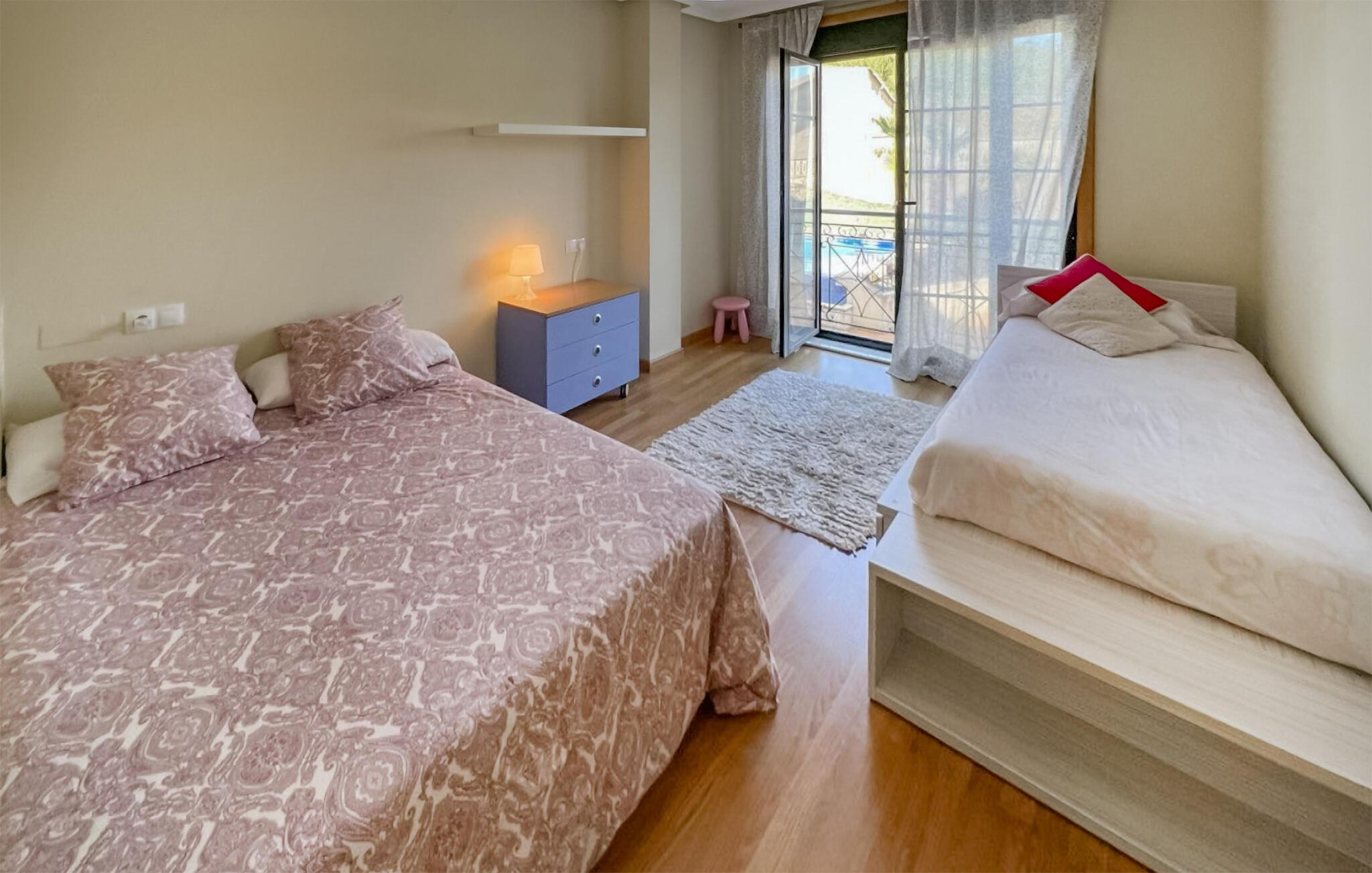 Velkommen til den galiciske kyst, hvor I som familie kan se frem til en skøn ferie i denne store og indbydende lejlighed, der ligger i et moderne boligkompleks. Lejligheden er flot indrettet og udstyret med al den komfort, I behøver for at lade skuldrene falde og slappe af med det samme, I stiller kufferterne. Rund en aktiv feriedag af med en hyggelig filmaften i sofaen og begynd dagen med en kop kaffe på den franske altan, inden I trasker ned for dagens første dyp i poolen.