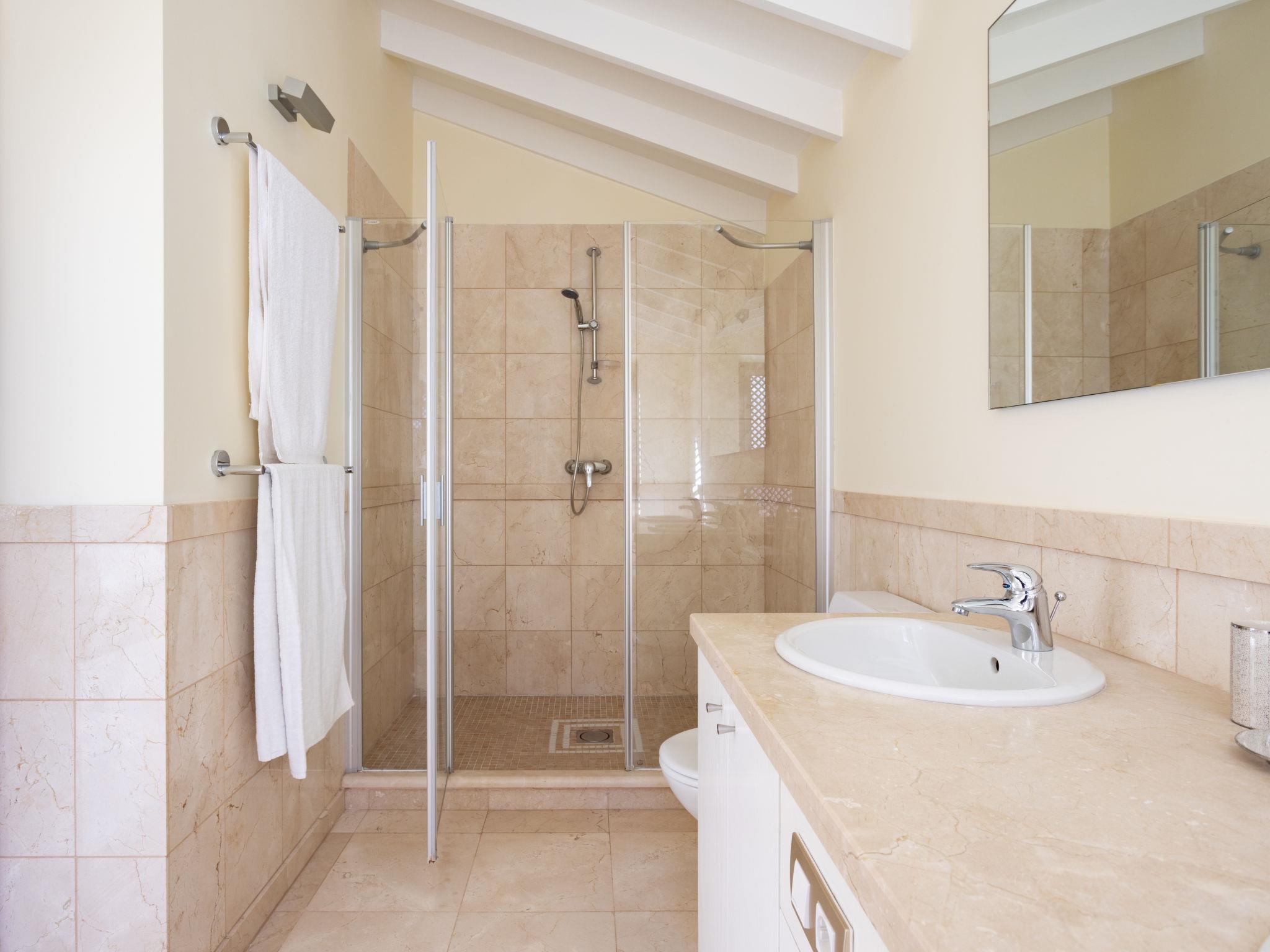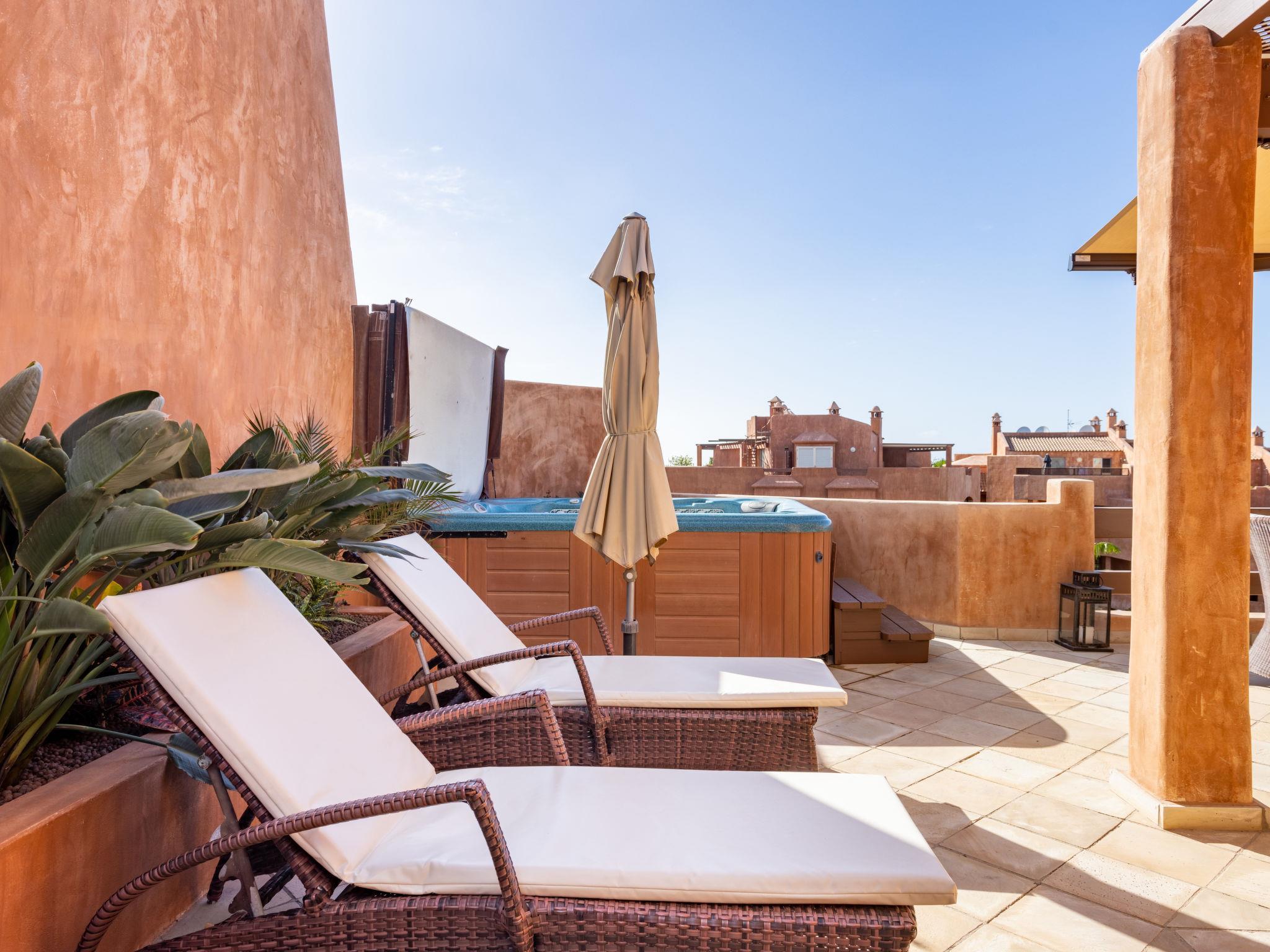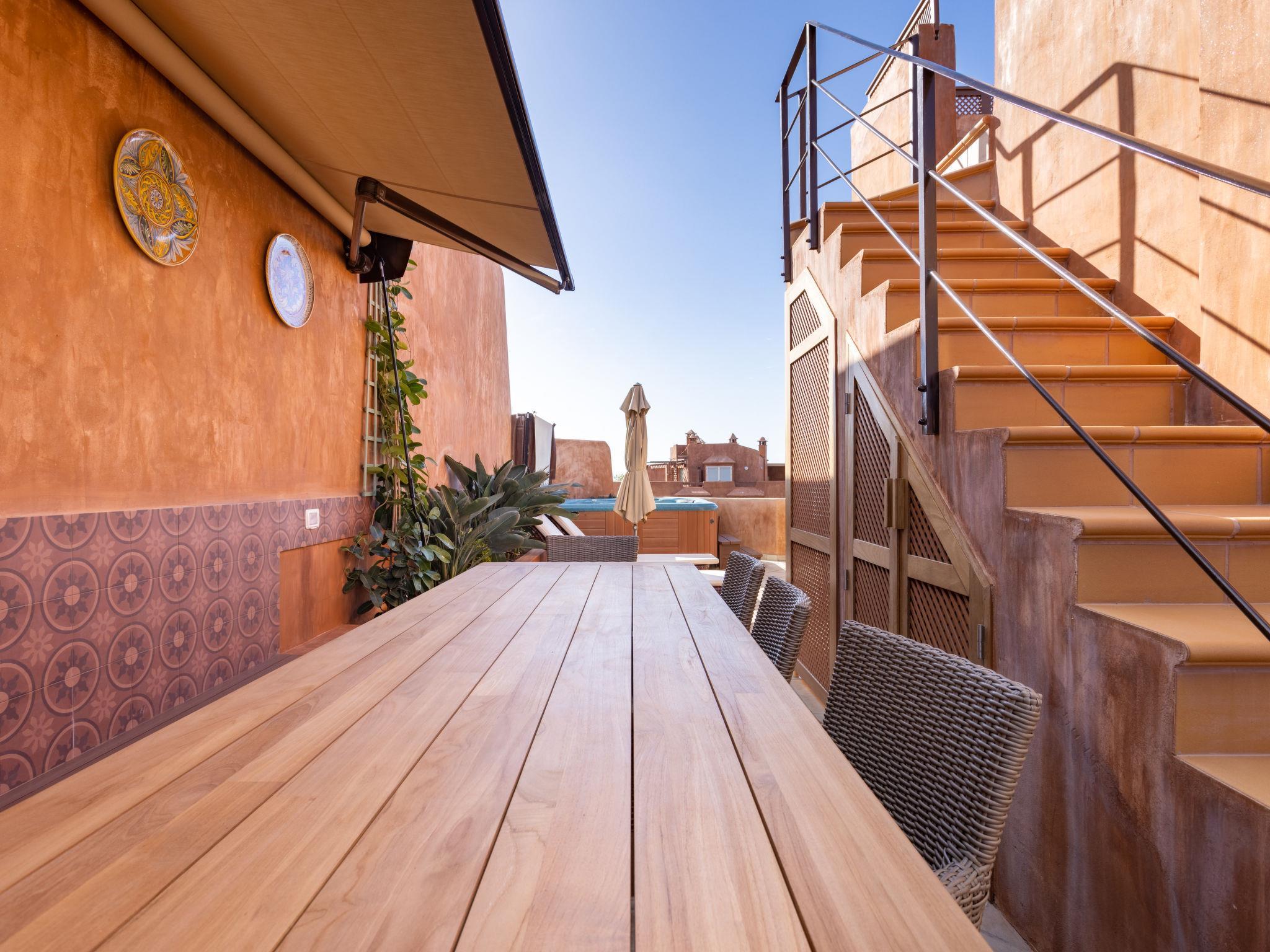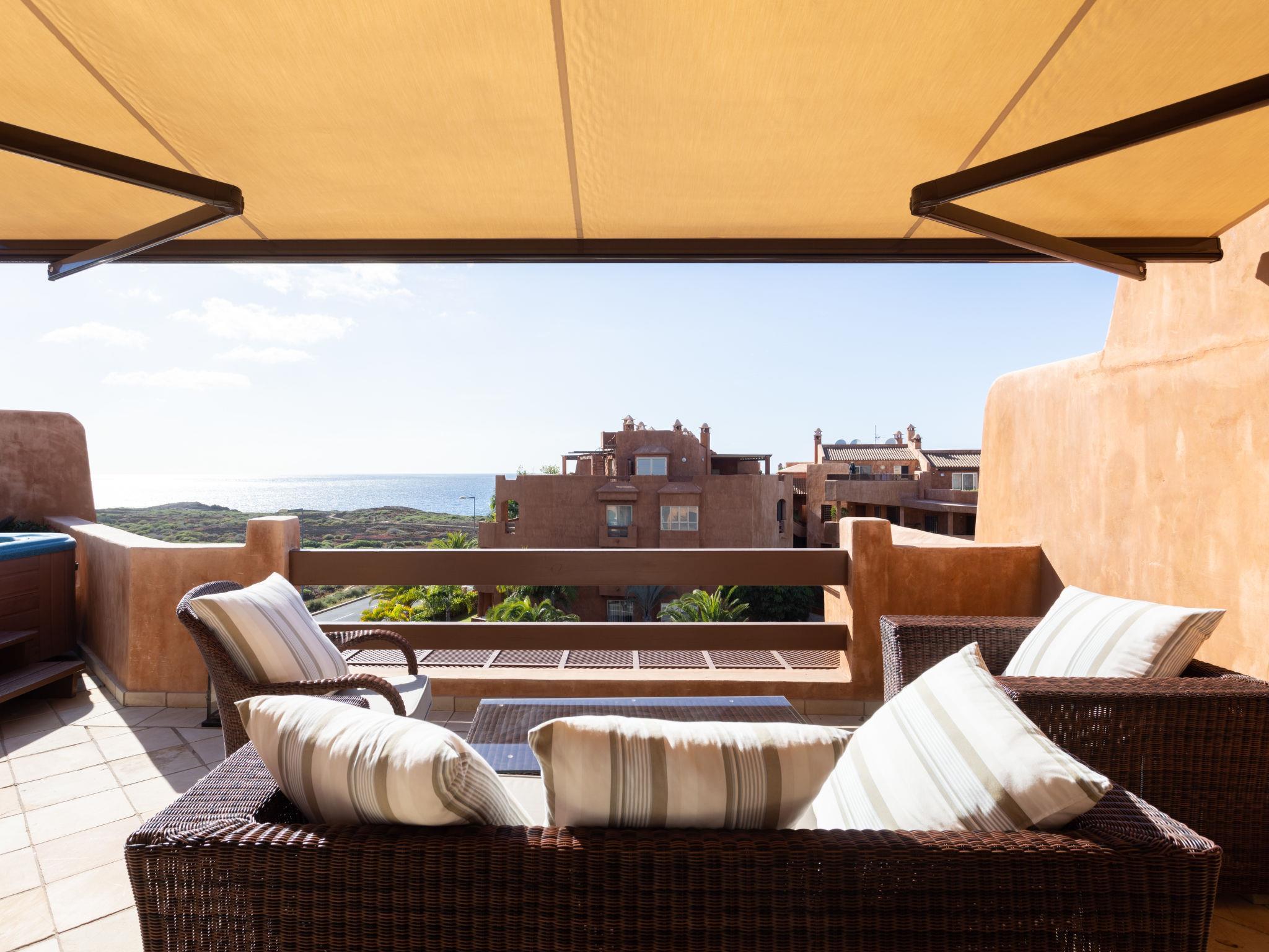 3-room maisonette 100 m2 on 2 levels, on the top floor. Bright, modern and luxurious furnishings: living/dining room with 1 double sofabed and satellite TV (flat screen). Exit to the terrace. 1 double bedroom with 1 french bed (160 cm, length 200 cm), bath/shower/WC and hydro massage bath. Exit to the terrace. Kitchen (oven, dishwasher, 4 ceramic glass hob hotplates, microwave, freezer). Sep. WC. No heating option. Upper floor: 1 double bedroom with 1 french bed (180 cm, length 200 cm), bath/shower/WC. Small terrace 22 m2, large terrace 60 m2. Terrace furniture, deck chairs. View of the sea, the countryside and the resort. Facilities: washing machine, iron, hair dryer. Internet (WiFi, free). Suitable for families. There is a additional roof top terrace with 360 degree view. VV-38-4-0091219