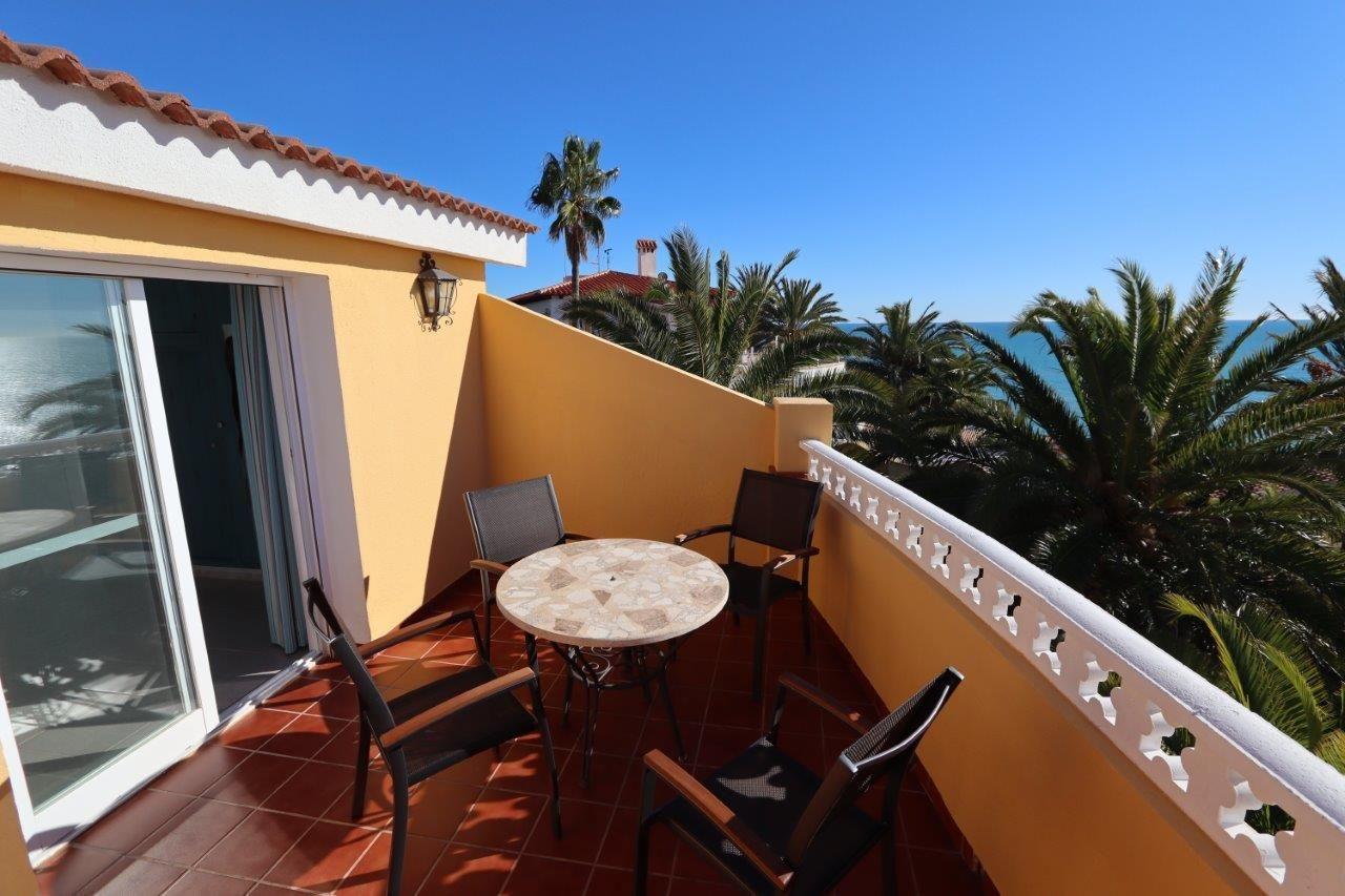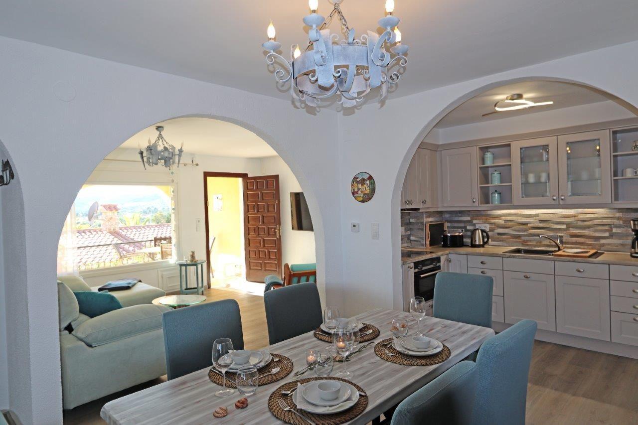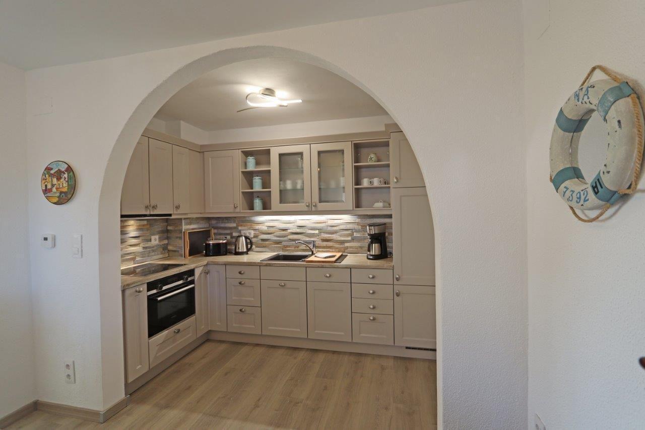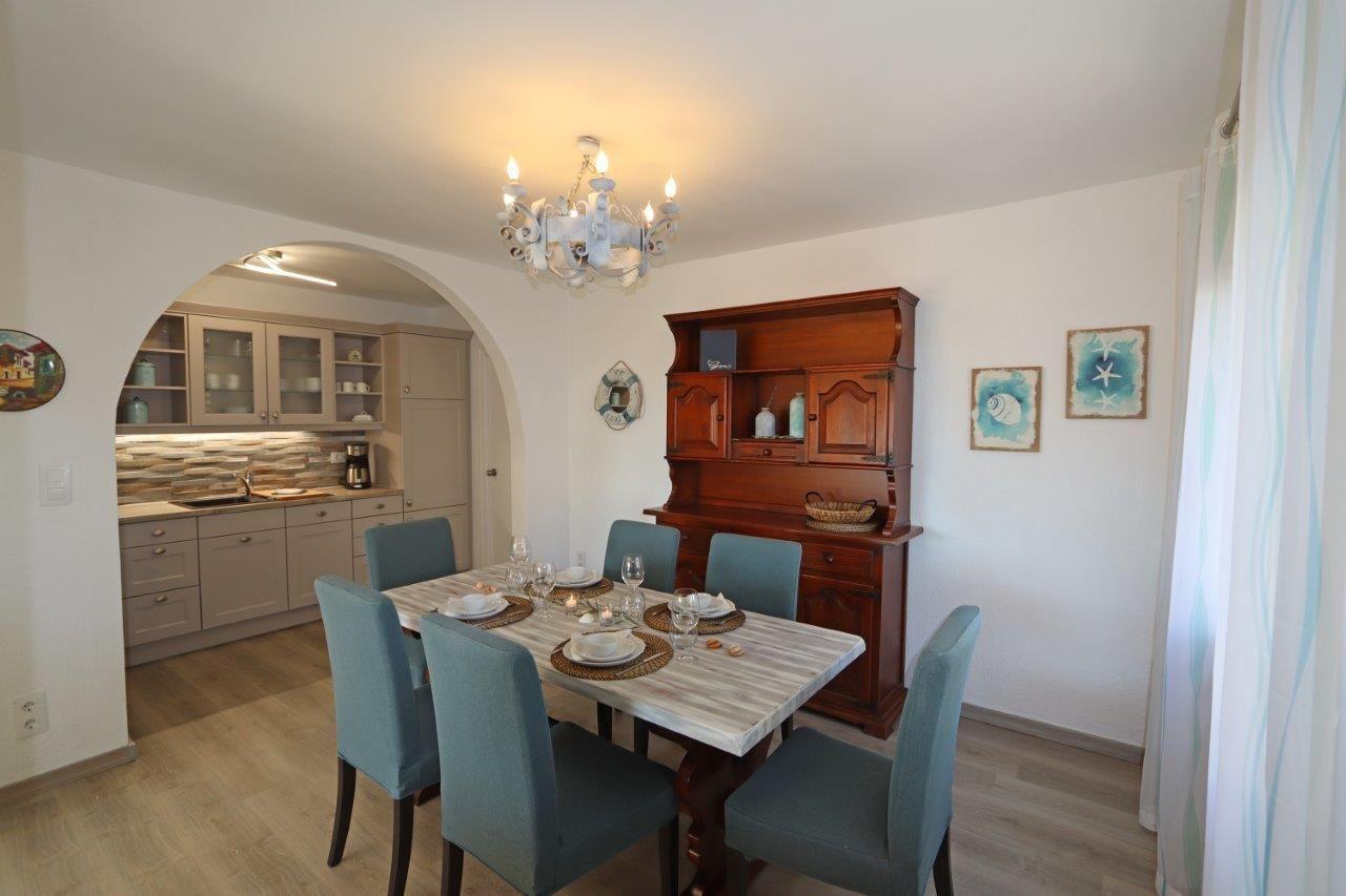 Welcome to our comfortable 2-storey holiday flat Geminis 1. The upscale furnishings are designed for a maximum of 5 people (4 adults + 1 infant). The spacious living area on the ground floor with panoramic window and fireplace invites you to linger. Let yourself be enchanted by the wonderful view of the sea and the mountains of the Serra d'Irta. The covered terrace with comfortable seating area is directly adjacent to the living room. The high-quality kitchen (with dishwasher, oven, microwave, freezer) is also located on the ground floor and offers plenty of space for dining or a cosy games evening. The flat also has 2 separate bedrooms on the top floor and a fantastic roof terrace (including sun loungers). In addition to the modern shower room on the top floor, there is a guest WC on the ground floor. You can also spend warm holiday days in the garden and round off the day with a barbecue. For cooler days in winter, there is underfloor heating and a fireplace.
