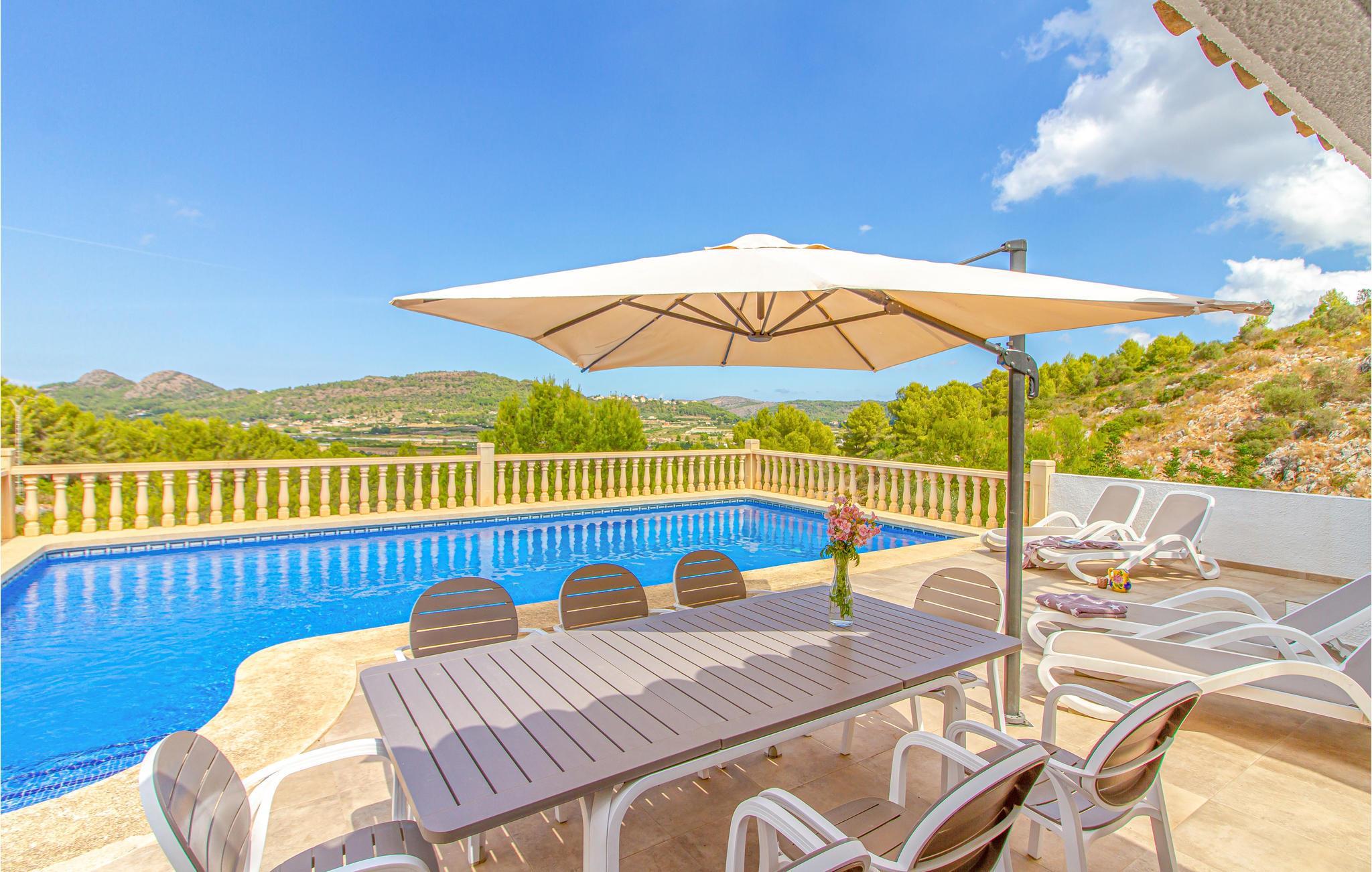 Der er flere terrasser, så I har mulighed for at trække udendørs hele dagen. Svøm nogle runder i den flotte pool og slap bagefter af på liggestolene. Sæt jer med en kold forfriskning under parasollen og afslut dagen med lækre tapas, mens I nyder udsigten til det skønne landskab.