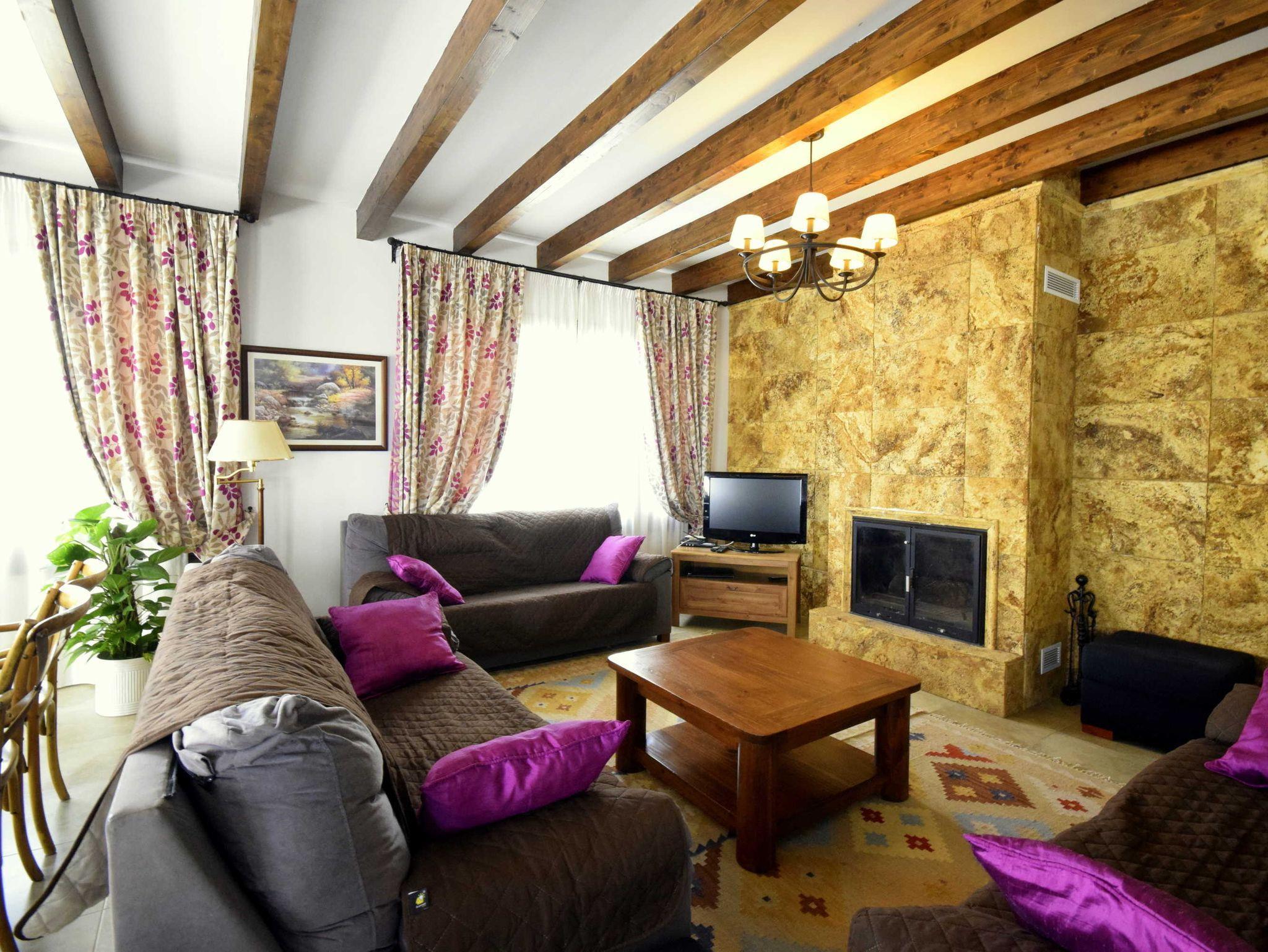 Das geräumige Wohn-Esszimmer ist hell und mit Kamin, Klimaanlage und SAT-TV.