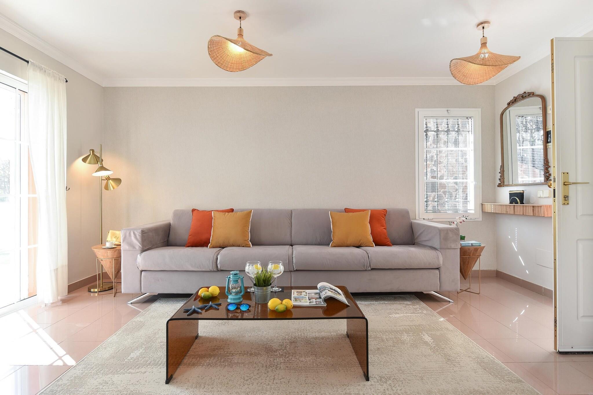 Stueetage: (åbent køkken(brødrister, komfur(glaskeramisk), kaffemaskine, ovn, mikrobølgeovn, køle-fryseskab), stue / spisestue(Fjernsyn(parabol, Smart-TV), spisebord, sofahjørne, klimaanlæg), toilet, bryggers(vaskemaskine)) På 1. etage: (soveværelse(2x enkeltseng, balkon, klimaanlæg), soveværelse(2x enkeltseng), badeværelse(badekar med bruser, håndvask, toilet, føntørrer)) terrasse(privat), havemøbler, solstole, grill, parkering, swimmingpool(deles med andre gæster, 16 x 8 m.), barneseng, barnestol