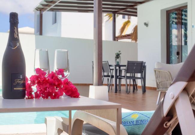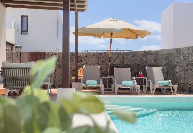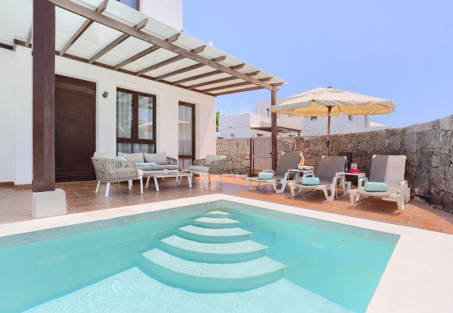 The indipendent villa 7 PIEDRAS in Playa Blanca is less than one kilometre from the lovely beaches of Papagayo and offers a well-equipped property with a 7-metre private pool. Surrounded by a small garden and two terraces with views of the Ajaches promontory and its volcanoes. In the garden area there is a heated pool with additional cost all year round, on request. Pool heats between 26ºC-28ºC maximum and you will have to cover during the night.