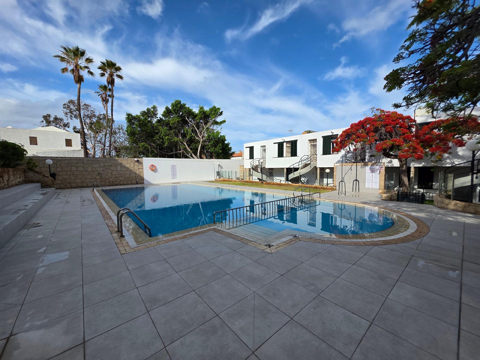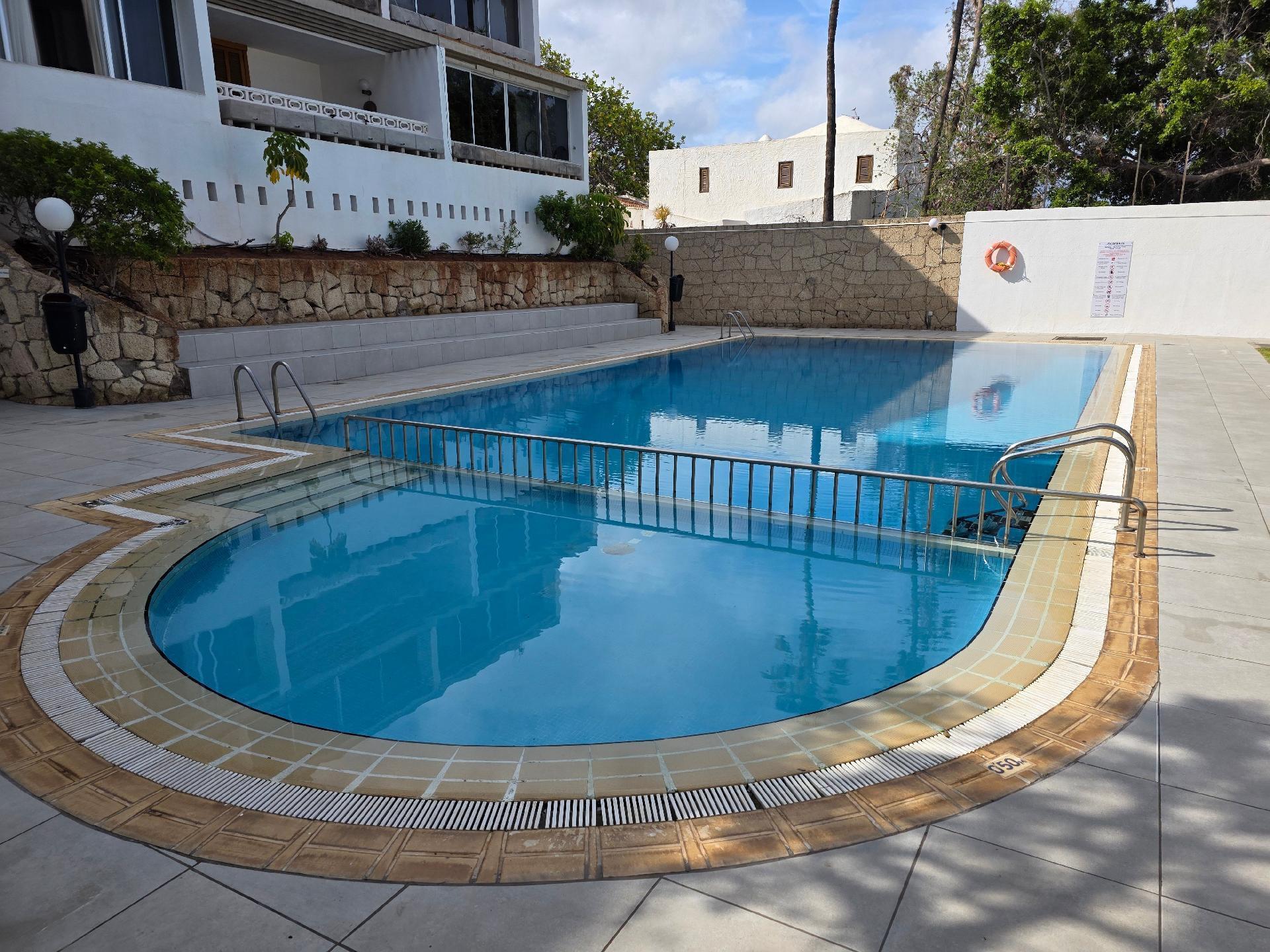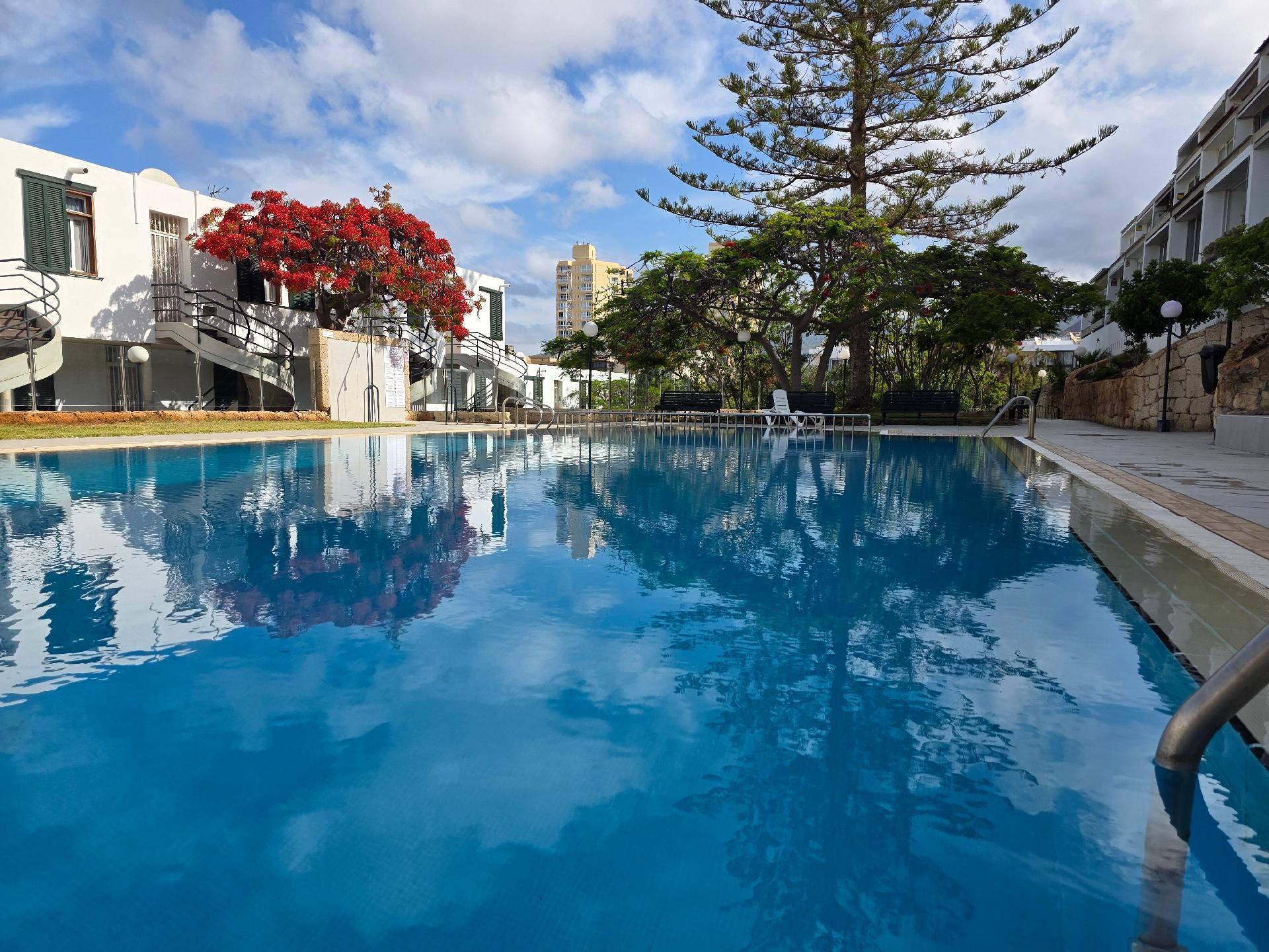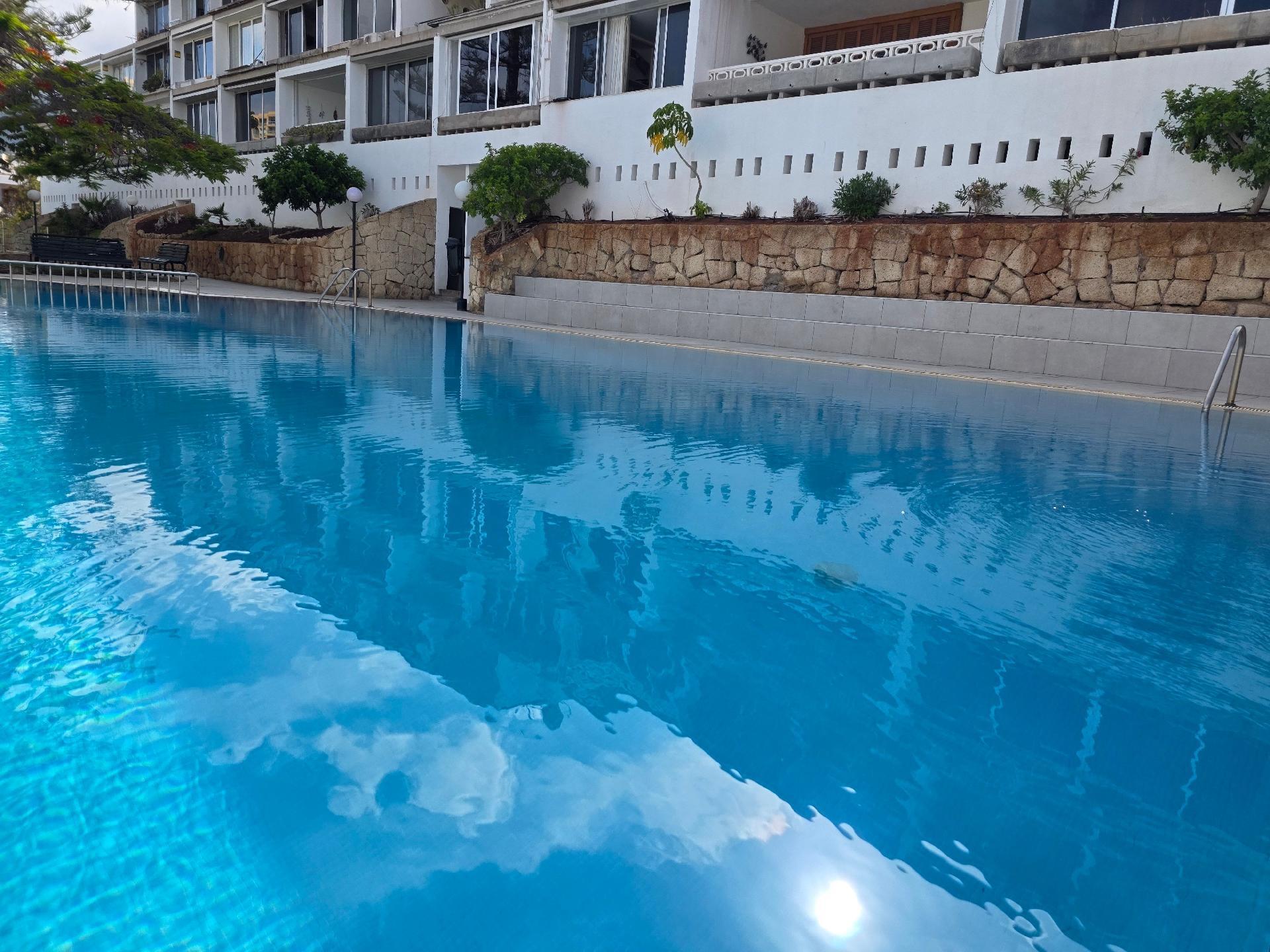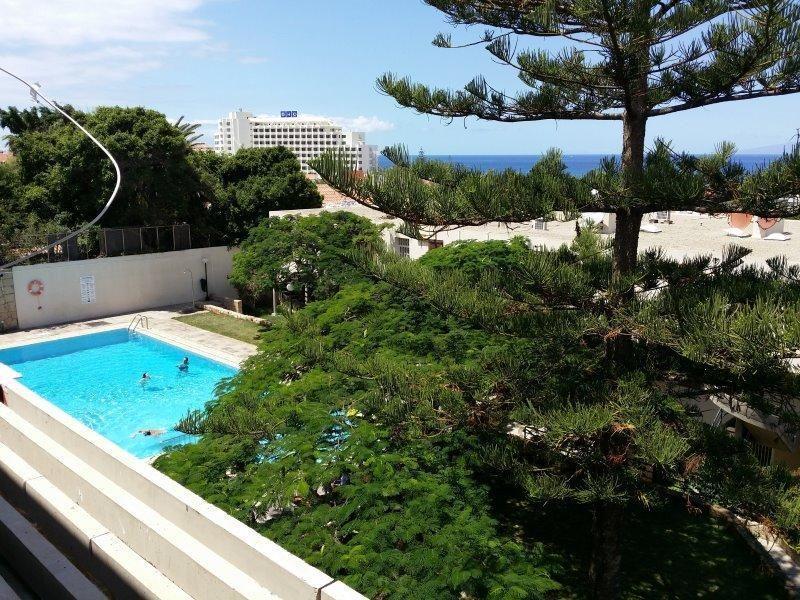 The pool area is located almost directly below the apartment.Information about the location:The apartment Jacaranda is located in the south of Tenerife, in the heart of Playa de las Américas, only two minutes from the beach and water sports facilities, a gorgeous place with an annual average temperature of 29 ° C, ideal for beach holidays and relaxing.18 km from Tenerife South Airport and 1 km from the Las Américas Golf Course. The apartment is located in a quiet and familiar system that is ideal for a holiday on the beach and has a fantastic view to the sea. The neighboring island of La Gomera is sometimes seen very well. The beach is just steps away.Playa de las Américas is the capital of tourists on Tenerife. The now grown city is a scale as holiday resort coastal town that belongs administratively to the municipality of Arona. The city is located in the southwest of the island, with its sheltered bays provides an ideal destination for bathers, Strandtourstisten, athletes and active holidaymakers of any kind. But it is also an ideal resort for people who want to see and experience, despite the rest somewhat.Playa de las Américas, together with the adjacent locations seamlessly Los Cristianos, Playa de Fañabé, La Caleta and Costa Adeje one of the most important tourism centers in Spain.The entire city's economy is primarily designed for the needs of tourists.You will find everything you need for a carefree vacation needs, such as restaurants, bars, nightclubs, hotels, supermarkets, sports fields, tennis courts, surf schools, diving, fitness clubs, car rentals, travel agencies and many ways for walkers and beach lovers.In 1966, the foundation of the city was decided and the boom of tourism in Tenerife led in the next few years, the city grew larger developed well.The city is also for excursions and tours on the island is the ideal starting point, because the south highway connects all the important points in Tenerife with one another.The beach promenade, which begins and ends in Los Cristianos in La Caleta, is now more than 16 kilometers long. Along the beach you will find a variety of shops, restaurant and shops.