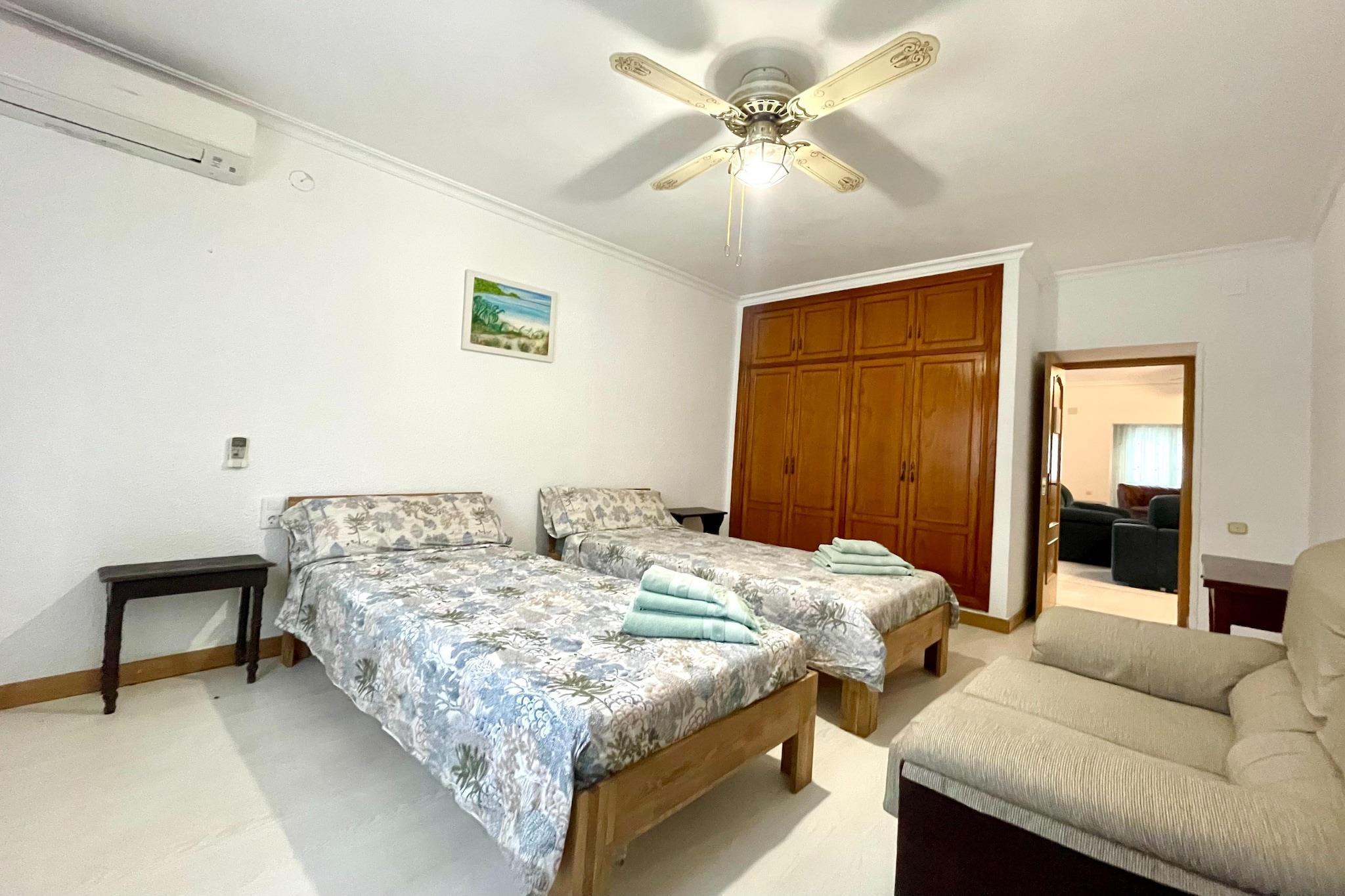 Stueetage: (Indgang (adgang udefra), åbent køkken(elkedel, komfur(Komfur med fire kogeplader, glaskeramisk), kaffemaskine), stue / spisestue(Fjernsyn(parabol), sofahjørne, klimaanlæg), soveværelse(dobbeltseng(135 x 190 cm)), soveværelse(dobbeltseng eller 2 enkeltsenge Senge), soveværelse(2x enkeltseng(90 x 190 cm)), badeværelse(badekar med bruser, håndvask, toilet)) balkon eller terrasse, havemøbler, grill(deles med andre gæster), parkering, swimmingpool(deles med andre gæster, udendørs, opened from Jun upto and including Sep)