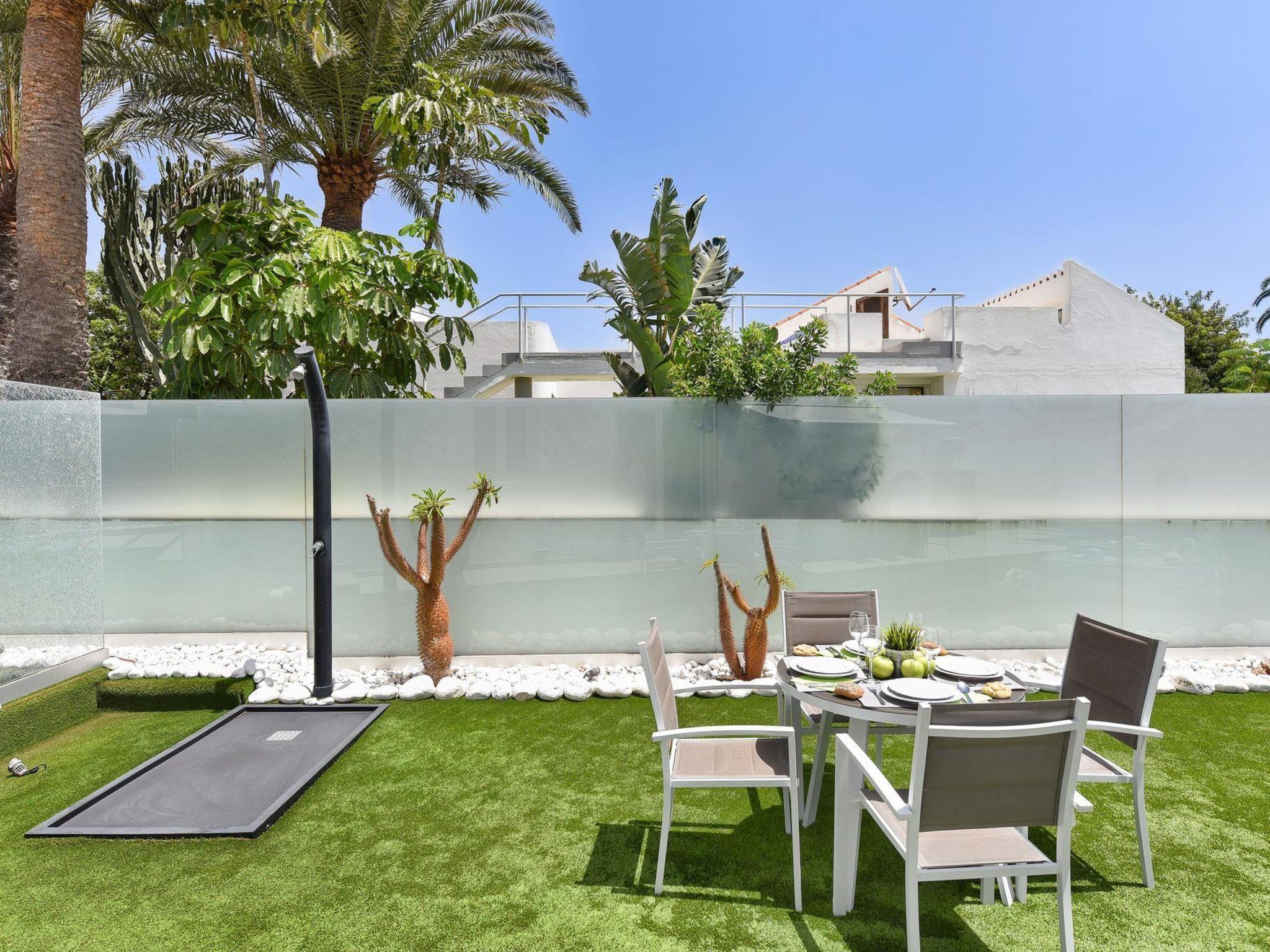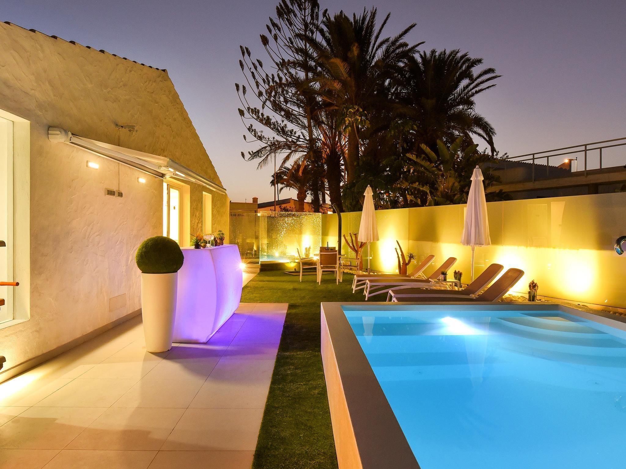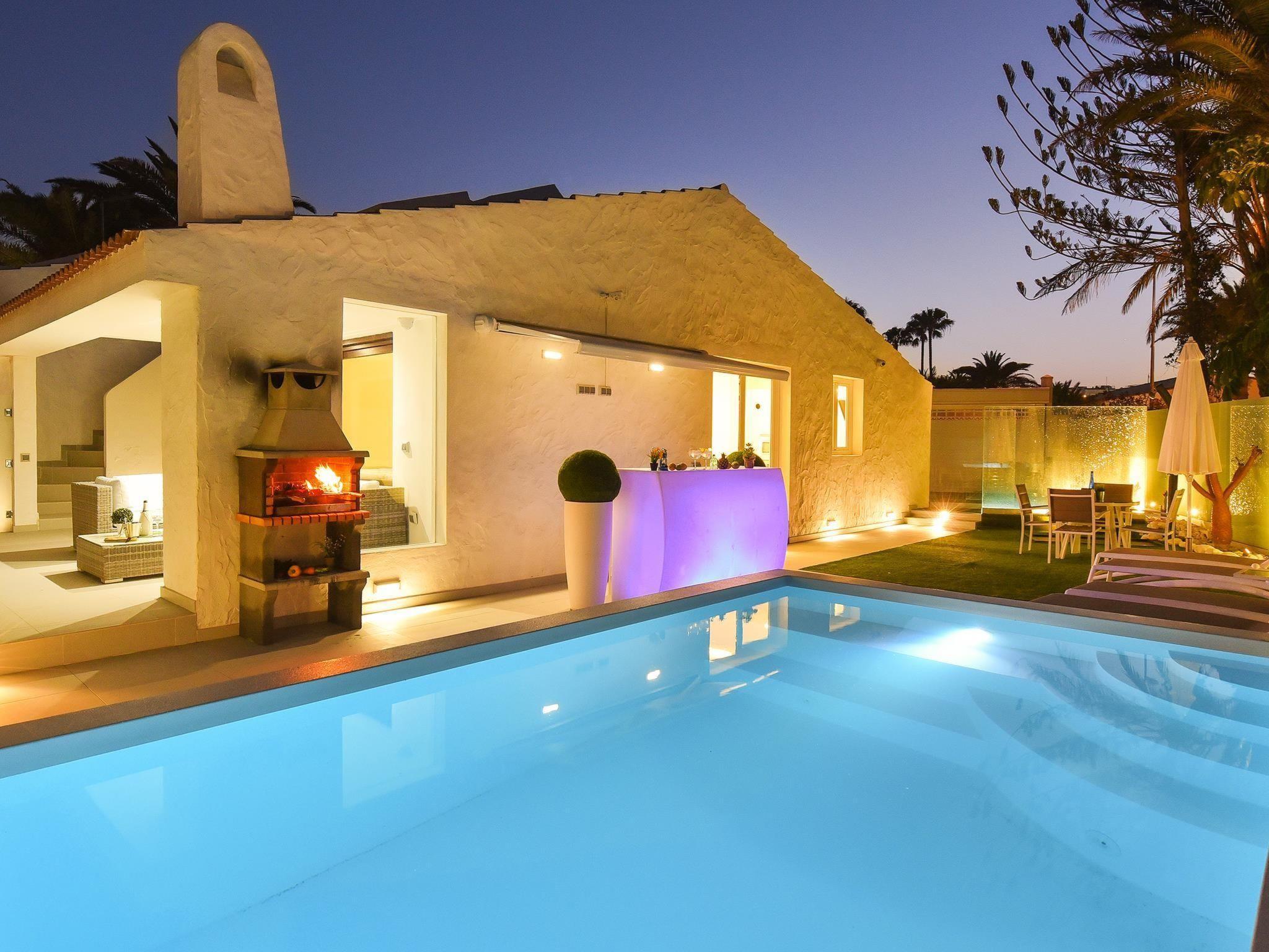 Modern, comfortable bungalow "Villa Rina MC". In the centre of Playa del Ingles, in the residential district, at the seaside. Private: swimming pool (seasonal availability: 01.Jan. - 31.Dec.). In the house: WiFi, solarium, washing machine, tumble dryer. Bus stop "Shopping Center Cita" 400 m. Please note: car recommended. Suitable for families, suitable for seniors baby equipment on request. The owner does not accept any youth groups.