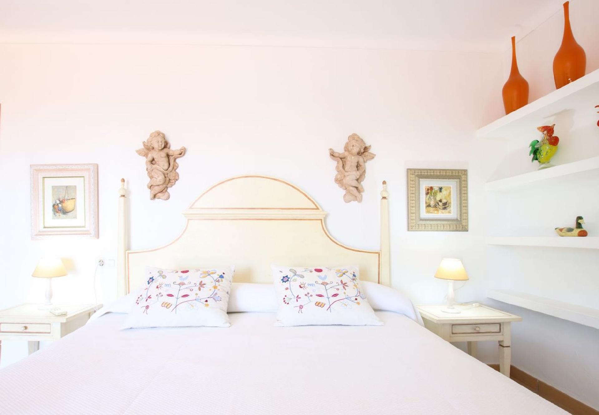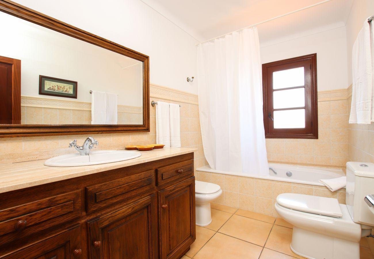 Upstairs is the master bedroom with king size mahogany bed, individual carved headboard and fitted wardrobes. This room has a beautiful en-suite bathroom and private furnished solarium with distant sea and mountain views. The second bedroom also has a king size bed, painted white, with carved headboard and fitted wardrobes and also a full en-suite bathroom and private furnished solarium, ideal for relaxing while enjoying the sunset views. The third bedroom, a superior double, has teak beds and fitted wardrobes, full bathroom and private furnished terrace overlooking the pool. The fourth bedroom also has two teak beds and fitted wardrobes, full bathroom and private sunbathing terrace with distant sea and mountain views. All bedrooms have air conditioning. Following energy saving and efficiency measures, this villa has programmed air conditioning, which can be used during midday and throughout the night.
