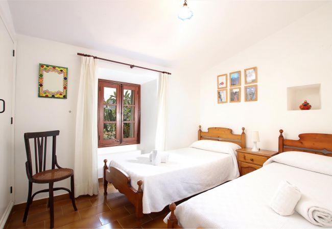 The spacious lounge dining area boasts tasteful wood furniture, paintings and decorative Mallorcan plates and ceramics. From the lounge, stairs lead up to the sleeping area; the bedrooms consist of two twins and one double, all sharing a full bathroom.