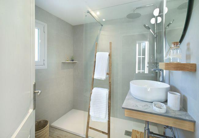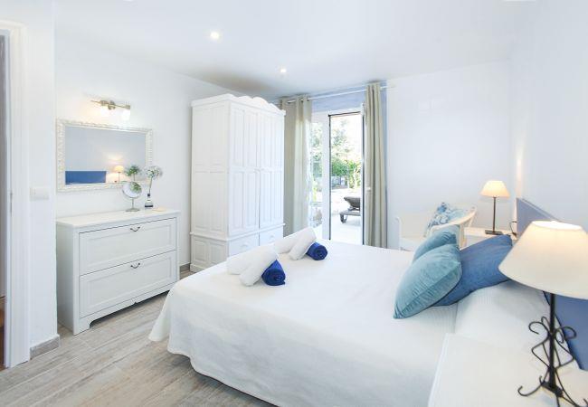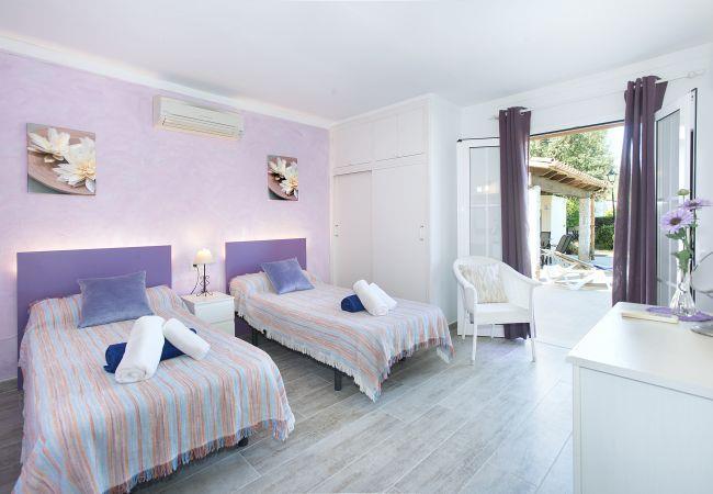 On the same floor to the right of the living room, we find a full bathroom with shower, and on both sides of the bathroom a double bedroom and a room with twin beds. Both bedrooms of light colors, with large storage space for clothes, have direct access to the pool and garden.
