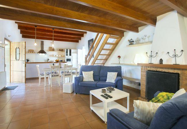 Enter to find an open flowing interior with beautiful wooden beams on the ceiling. A large dining room with its table and chairs, to the left is an open kitchen with everything you need to prepare a delicious breakfast or an exquisite meal. To the right is the living room with a sofa, and the TV to enjoy a movie or any program. Wifi is included in the whole house.
