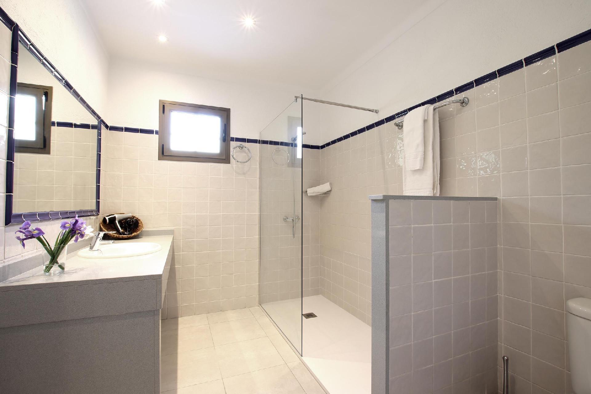 On the upper floor are the rest of the bedrooms. At the top of the stairs there is a landing where on the right hand side there is a double bedroom with en-suite bathroom, while on the left hand side there is a long corridor with the rest of the rooms distributed on both sides. On the left hand side of the corridor there is a double bedroom and another bedroom at the back which can be either a twin or a double room. Both rooms share a bathroom with shower. To the right of the corridor there are two bedrooms with en-suite bathrooms. The first one can be either a twin or a double room, while the one at the back is a double room. It is worth noting that all the bedrooms have air conditioning and fitted wardrobes.