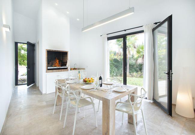 Outside, a well-kept garden and a private pool invite you to relax under the Mallorcan sun. The modern kitchen has a central island ideal for cooking together, an adjacent table for informal breakfasts and a private dining room with an indoor barbecue. This space opens directly onto the terrace through a large window, creating a bright and cosy atmosphere to enjoy outdoor meals.