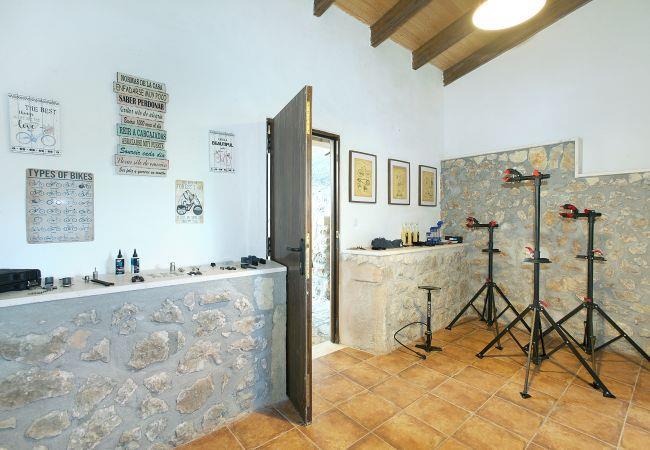 Outside, there are two annexed rooms housing a small gym and a space dedicated to cyclists, with tools and bike racks. There is also a full bathroom for showering after a day of sports.