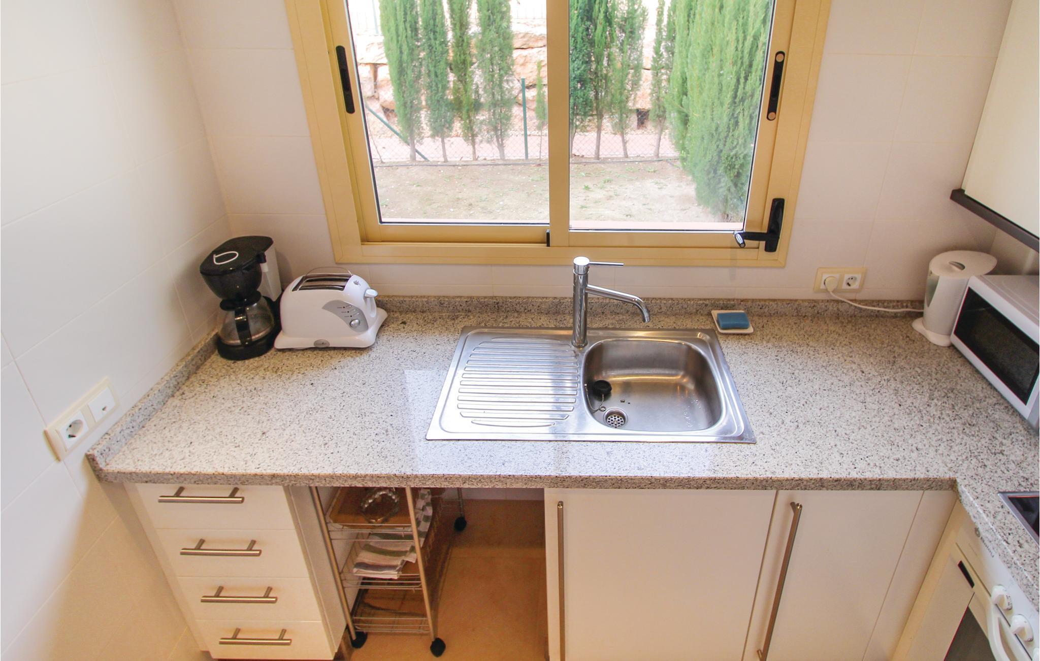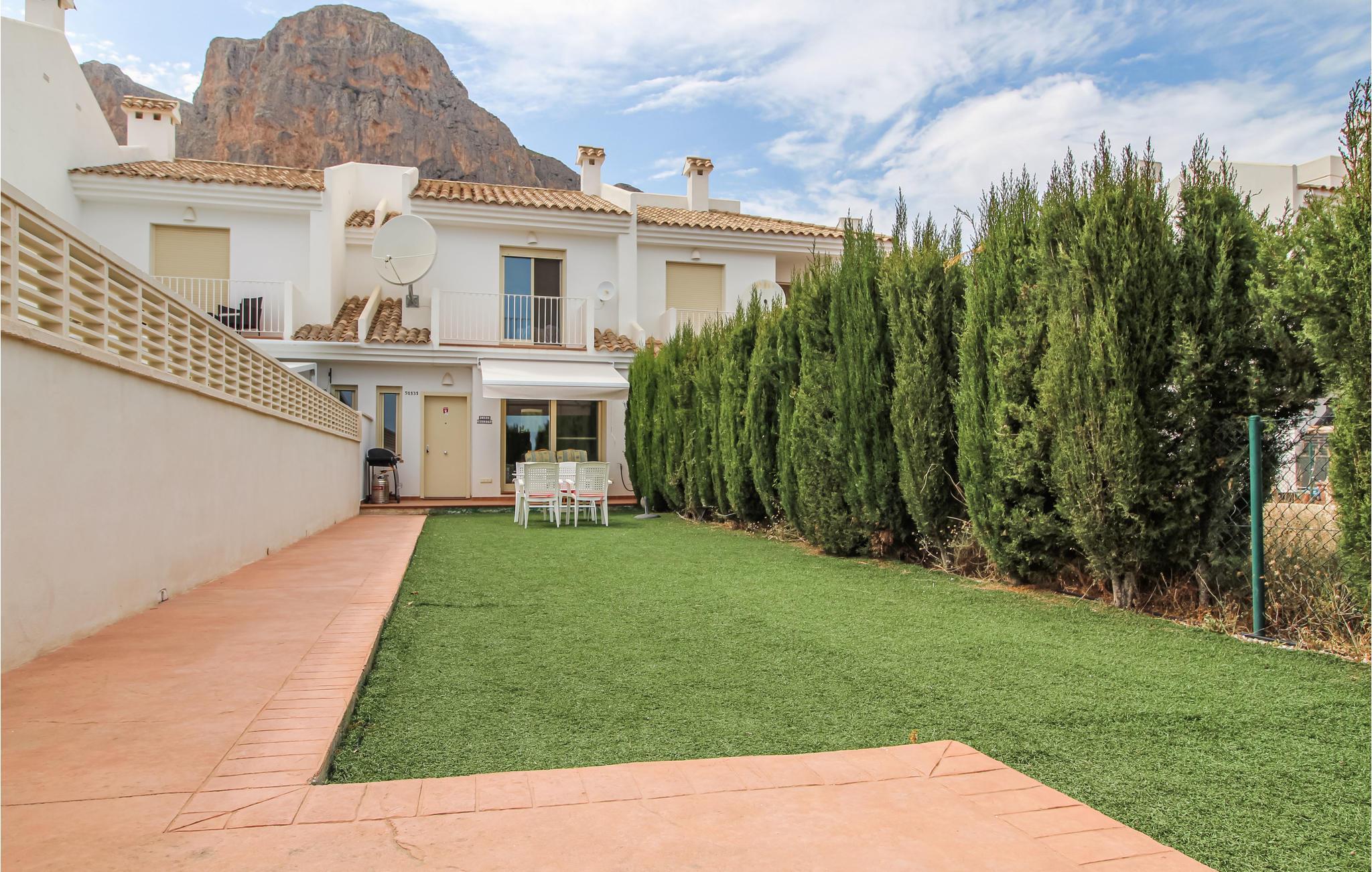 I den vidunderlige dal ved Polop de la Marina finder I dette hyggelige ferierækkehus, beliggende i et vidunderligt smukt naturlandskab, omgivet af bjerge og imponerende klippeformationer. Huset er på 60 m² og fordeler sig på to etager. I stueetagen findes den praktisk indrettede opholdsstue, med direkte adgang til til terrassen og husets udendørsområde. Via en trappe kommer I til første sal hvor begge soveværelser og to badeværelser ligger. Et af soveværelserne har en lækker balkon med fantastisk udsigt til omgivelserne. Den velplejede bebyggelse som boligen ligger i har en fællespool hvor I nok kommer til at tilbringe nogle timer med forfriskende dukkerter - kun afbrudt af lidt solbadning på de grønne plæner. Der er ikke langt til indkøbsmuligheder og restauranter, og til de herlige strande ved kysten er der otte km.
