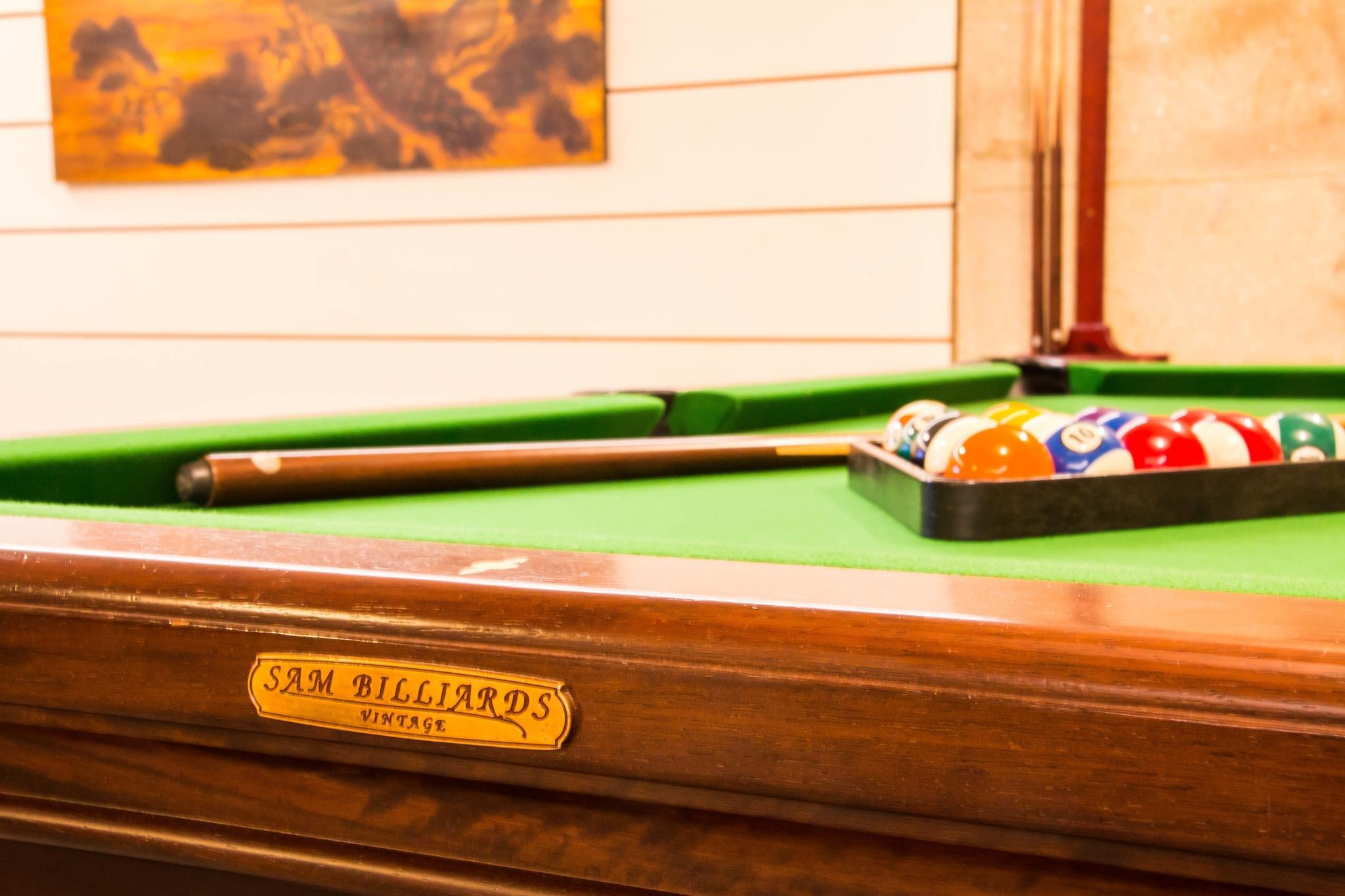 Stueetage: (Stue(Fjernsyn, pejs), Køkken(komfur, kaffemaskine, ovn, mikrobølgeovn, opvaskemaskine , køle-fryseskab, vaskemaskine), badeværelse(håndvask, toilet)) På 1. etage: (soveværelse(dobbeltseng), soveværelse(dobbeltseng), soveværelse(enkeltseng, enkeltseng), soveværelse(enkeltseng, enkeltseng), soveværelse(køjeseng), badeværelse(badekar med bruser, håndvask, toilet), badeværelse(bruser, håndvask, toilet), badeværelse(bruser, håndvask, toilet)) have, havemøbler, grill, parkering, swimmingpool(privat), biljard, fitnessapparater
