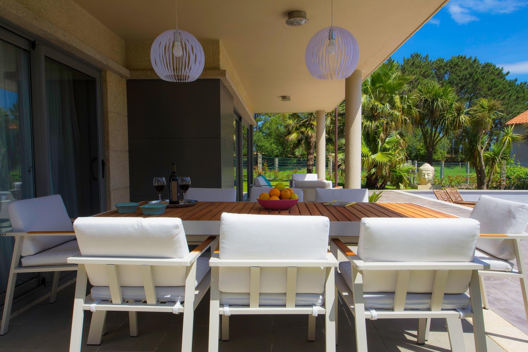 Denne smukke villa har en grund på 1100 kvadratmeter med have og swimmingpool. Den rummelige terrasse har havudsigt og giver adgang til tre af de fire soveværelser. Der er også et fritidsrum på 70 m2 med bordfodbold, billard, tv-stue og et fuldt fitnesscenter med det nødvendige udstyr til at holde sig i form. Der er Wifi i hele huset og en privat garage til to biler. Huset er beliggende i Sanxenxo kommune, hvor du kan lave mange aktiviteter som karting, vandsport, ridning, bådudlejning, besøg på øen Ons, Toxa Casino og de prestigefyldte golfbaner A Toxa og Monte Castrove. Det har et specielt mikroklima, som uden tvivl er det bedste klima i regionen. Smukke sandstrande som Montalvo, Bascuas, Silgar, Major, Paxariñas, Canelas, Caneliñas, Baltar og A Lanzada ligger kun få km væk. Det perfekte hus på det perfekte sted for en afslappende ferie og for fuldt ud at nyde solen, stranden, mad og galicisk gæstfrihed.
