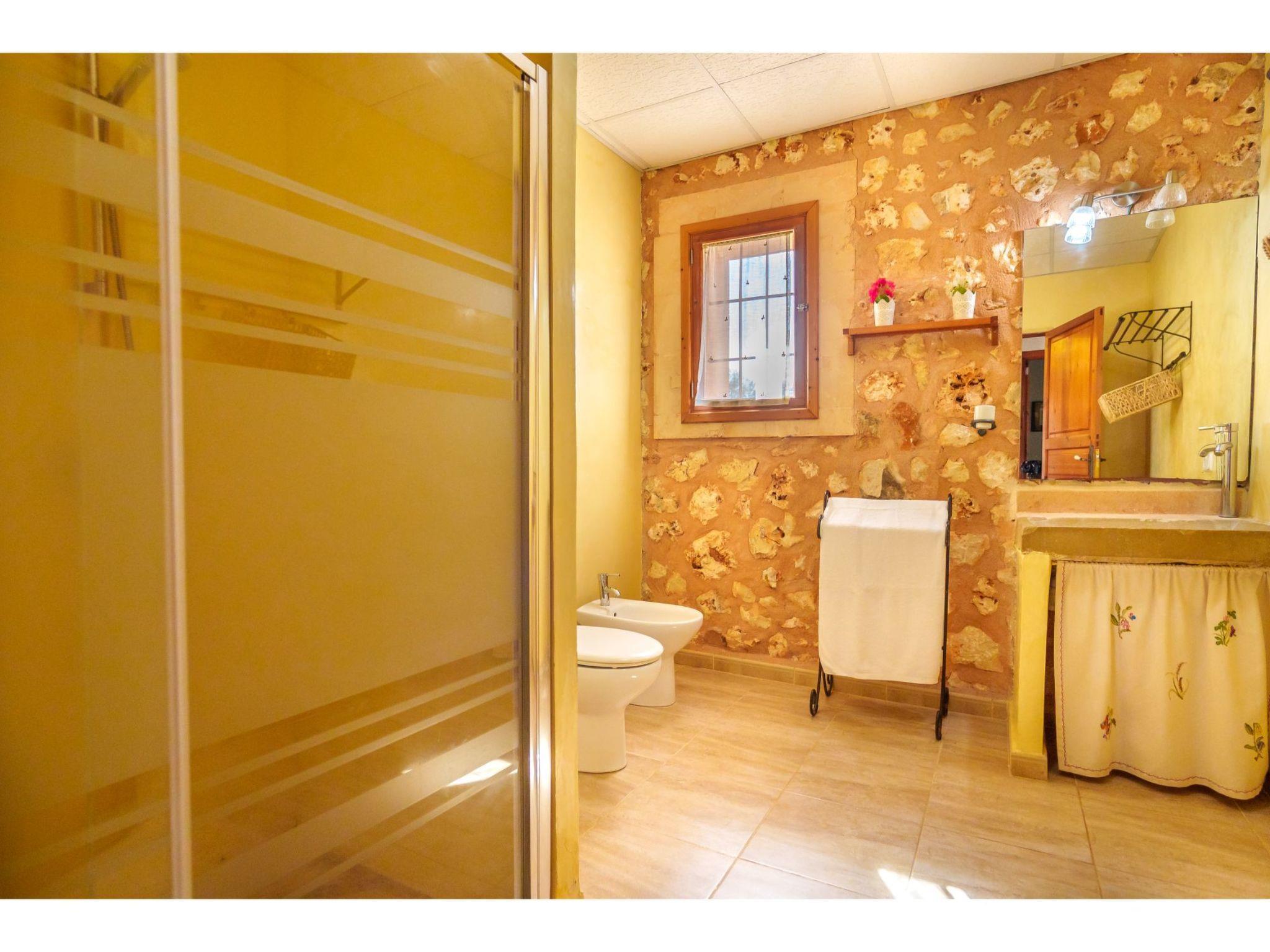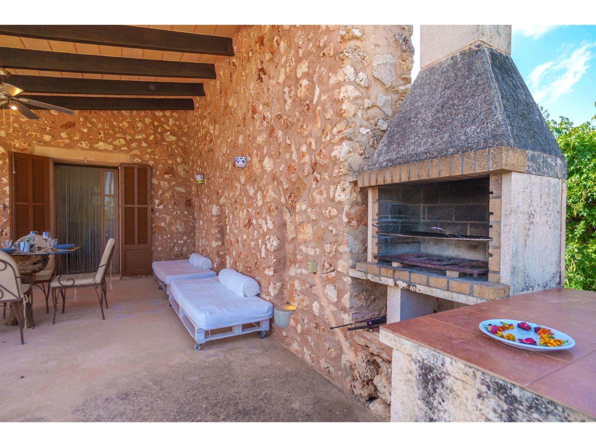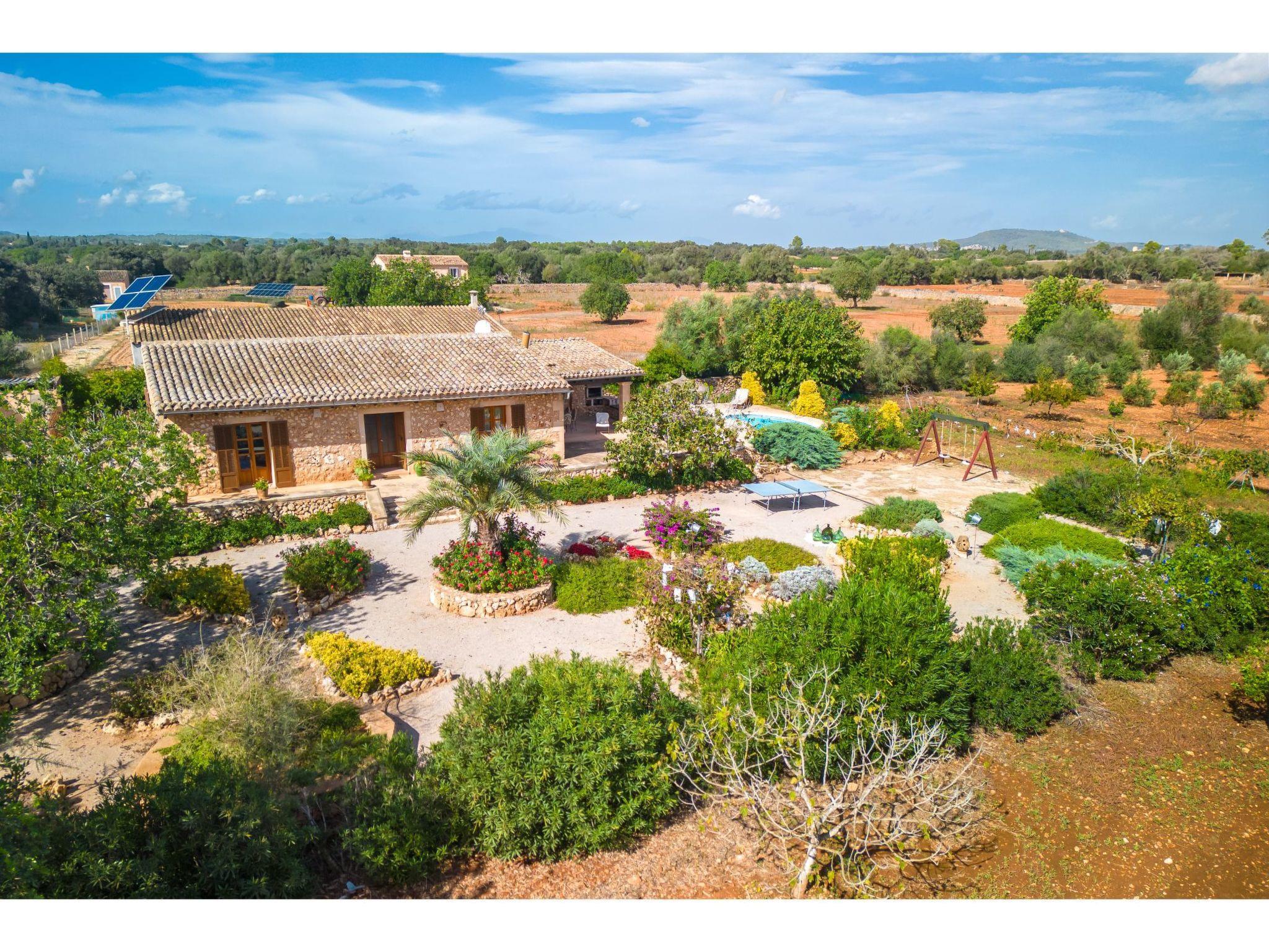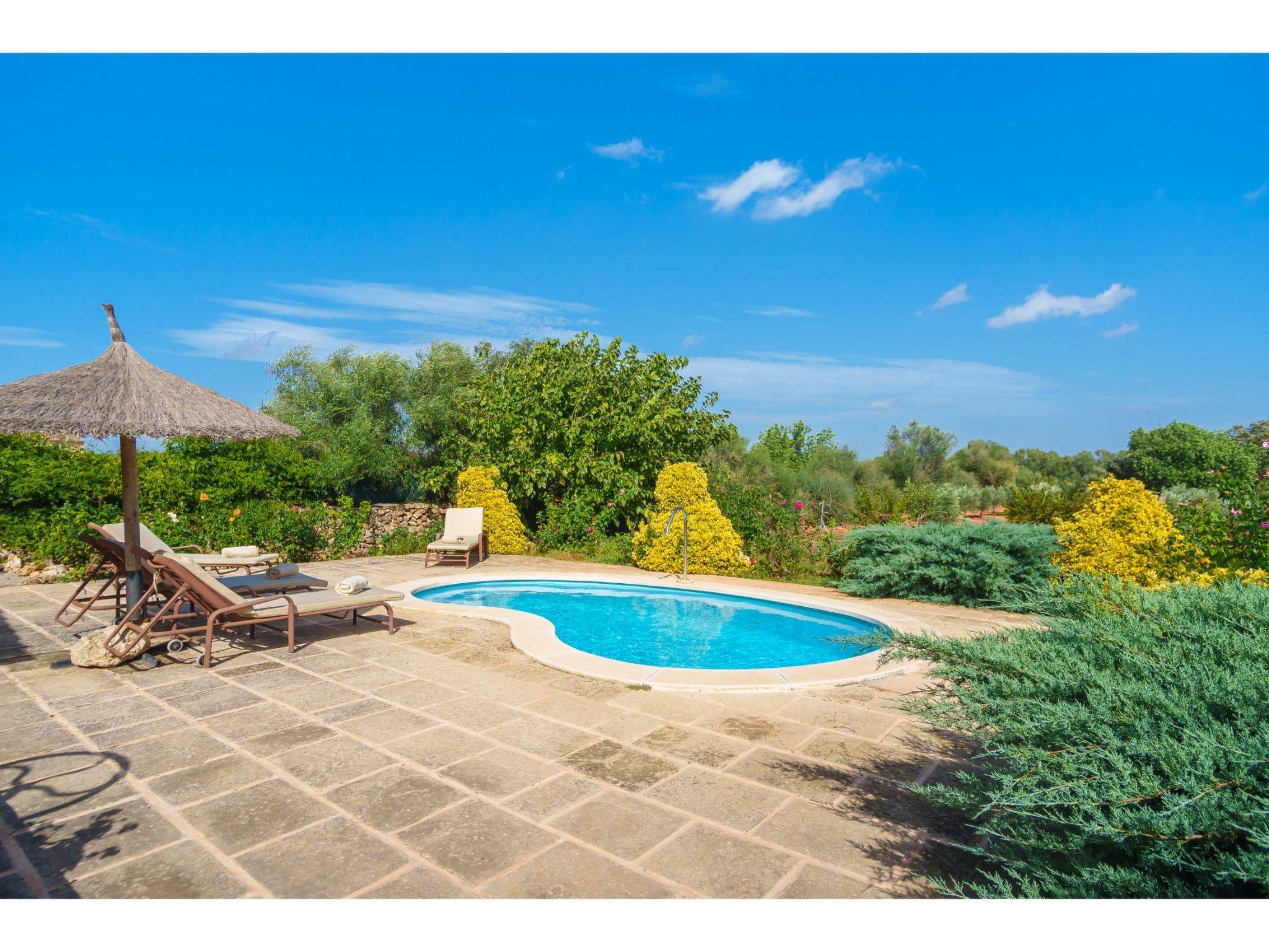 Porreres: Cosy, rustic farm estate "Los Geranios", surrounded by trees, meadows and fields. Outside the resort, 6 km from the centre of Porreres, in a quiet position, traffic calmed area, in a cul-de-sac. Private: natural state property, beautiful, well-kept garden, orchard, lawn for sunbathing, swimming pool kidney shaped (6 x 3 m, depth 60 - 150 cm, seasonal availability: 01.Mar. - 31.Oct.). Outdoor shower, arbour, pergola, terrace, garden furniture, barbecue. In the house: internet access, WiFi, air conditioning, washing machine. Parking on the premises. Bus stop "Porreras" 7 km. Please note: car recommended. Suitable for families, suitable for seniors baby equipment on request (included). Object suitable for 6 adults. The owner does not accept any youth groups. Loading and unloading of baggage is possible at the holiday house. Airfield 40 km from the property.