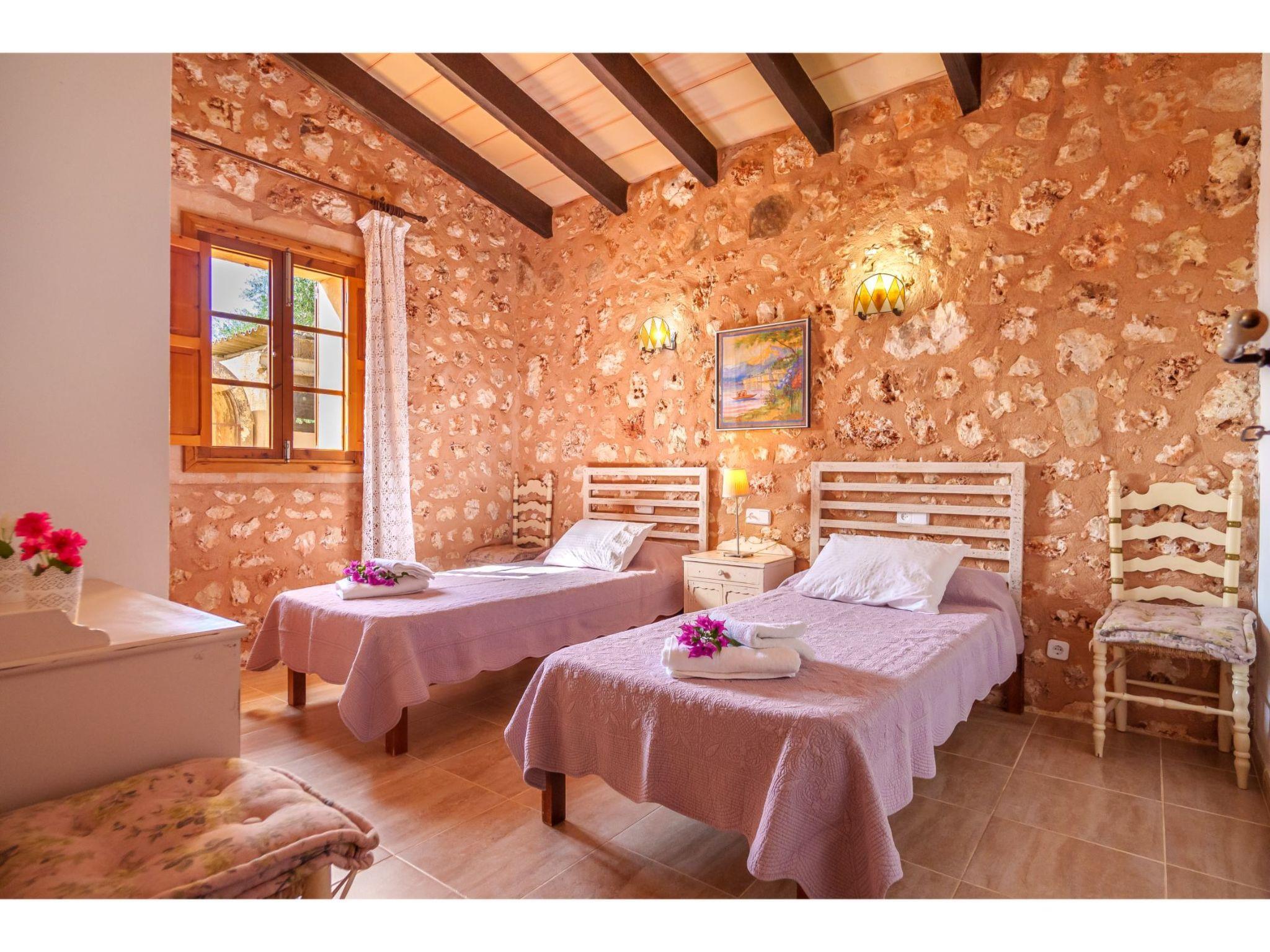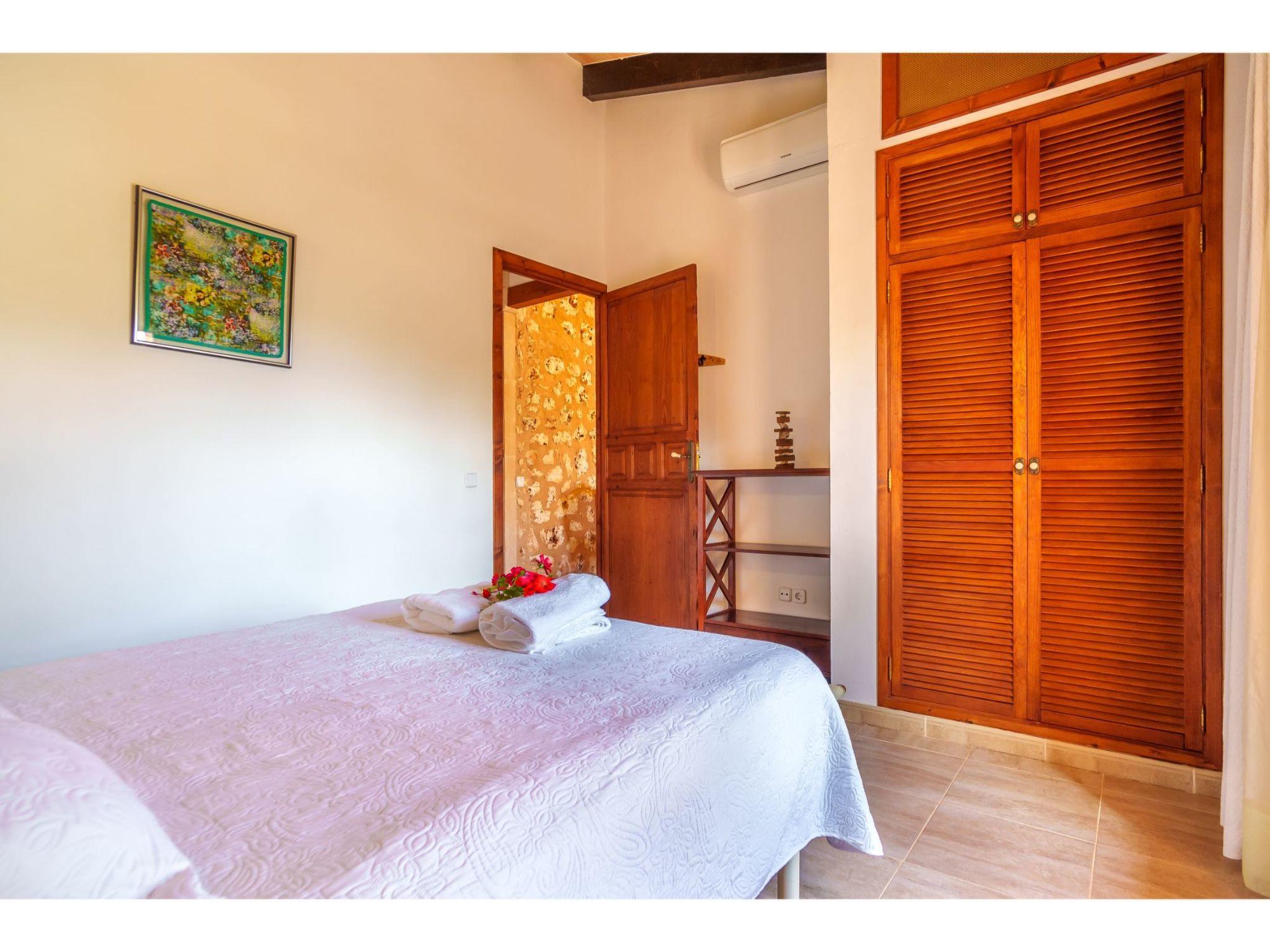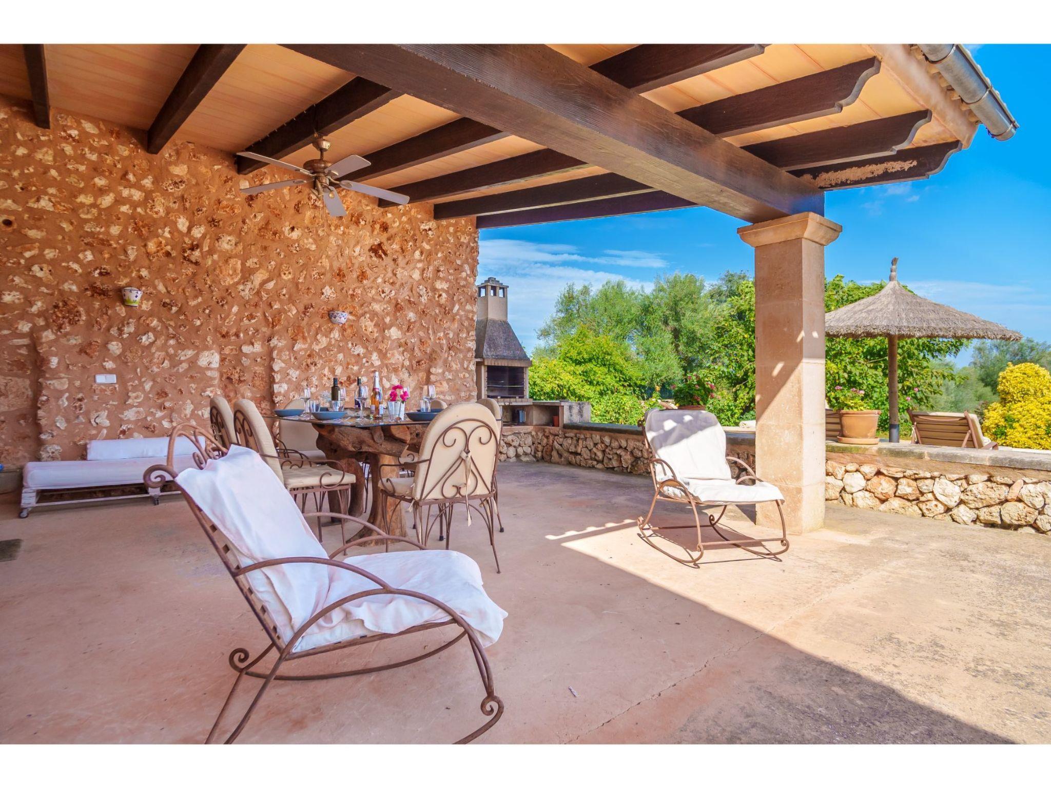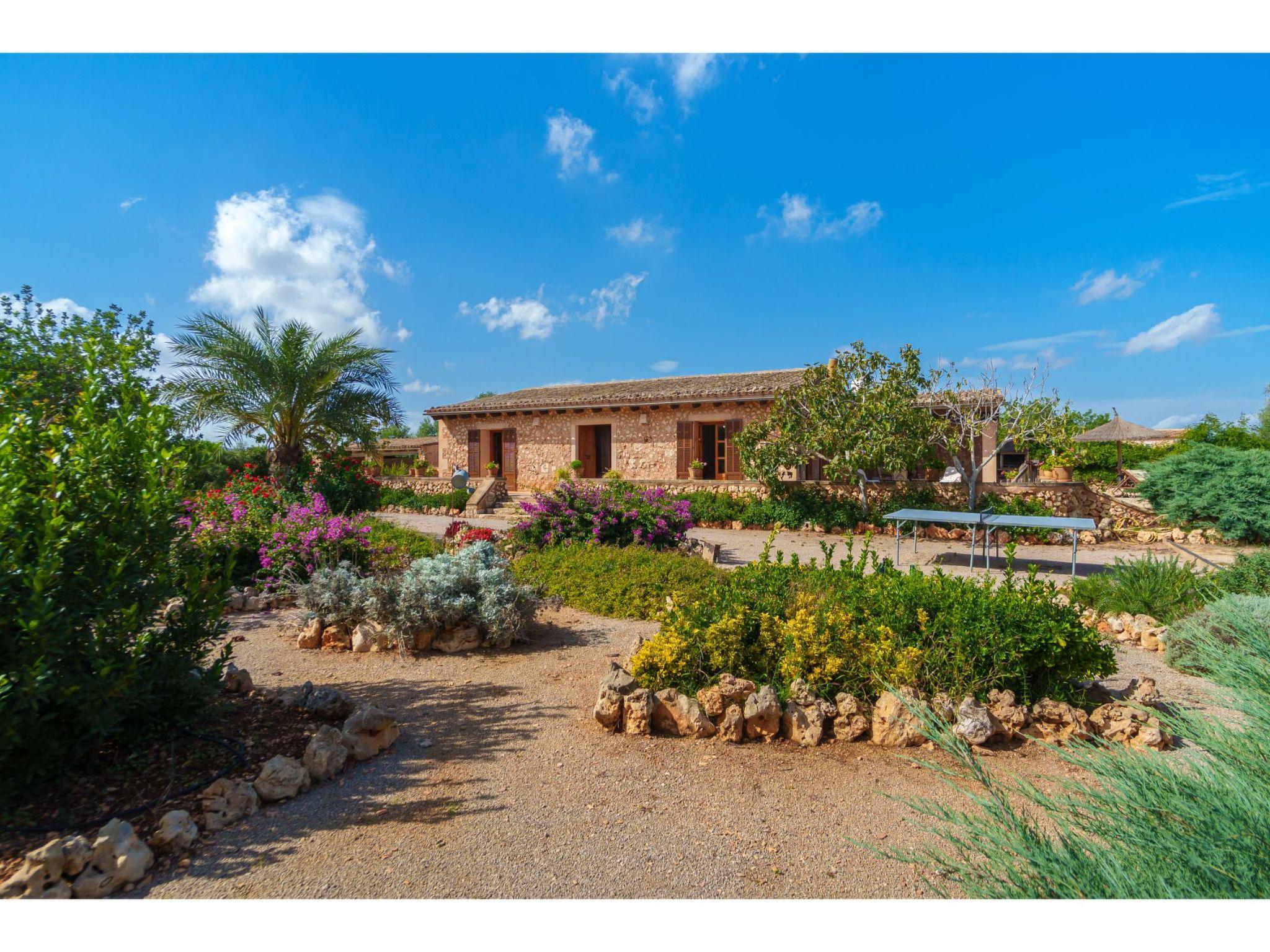 Porreres: Cosy, rustic farm estate "Los Geranios", surrounded by trees, meadows and fields. Outside the resort, 6 km from the centre of Porreres, in a quiet position, traffic calmed area, in a cul-de-sac. Private: natural state property, beautiful, well-kept garden, orchard, lawn for sunbathing, swimming pool kidney shaped (6 x 3 m, depth 60 - 150 cm, seasonal availability: 01.Mar. - 31.Oct.). Outdoor shower, arbour, pergola, terrace, garden furniture, barbecue. In the house: internet access, WiFi, air conditioning, washing machine. Parking on the premises. Bus stop "Porreras" 7 km. Please note: car recommended. Suitable for families, suitable for seniors baby equipment on request (included). Object suitable for 6 adults. The owner does not accept any youth groups. Loading and unloading of baggage is possible at the holiday house. Airfield 40 km from the property.
